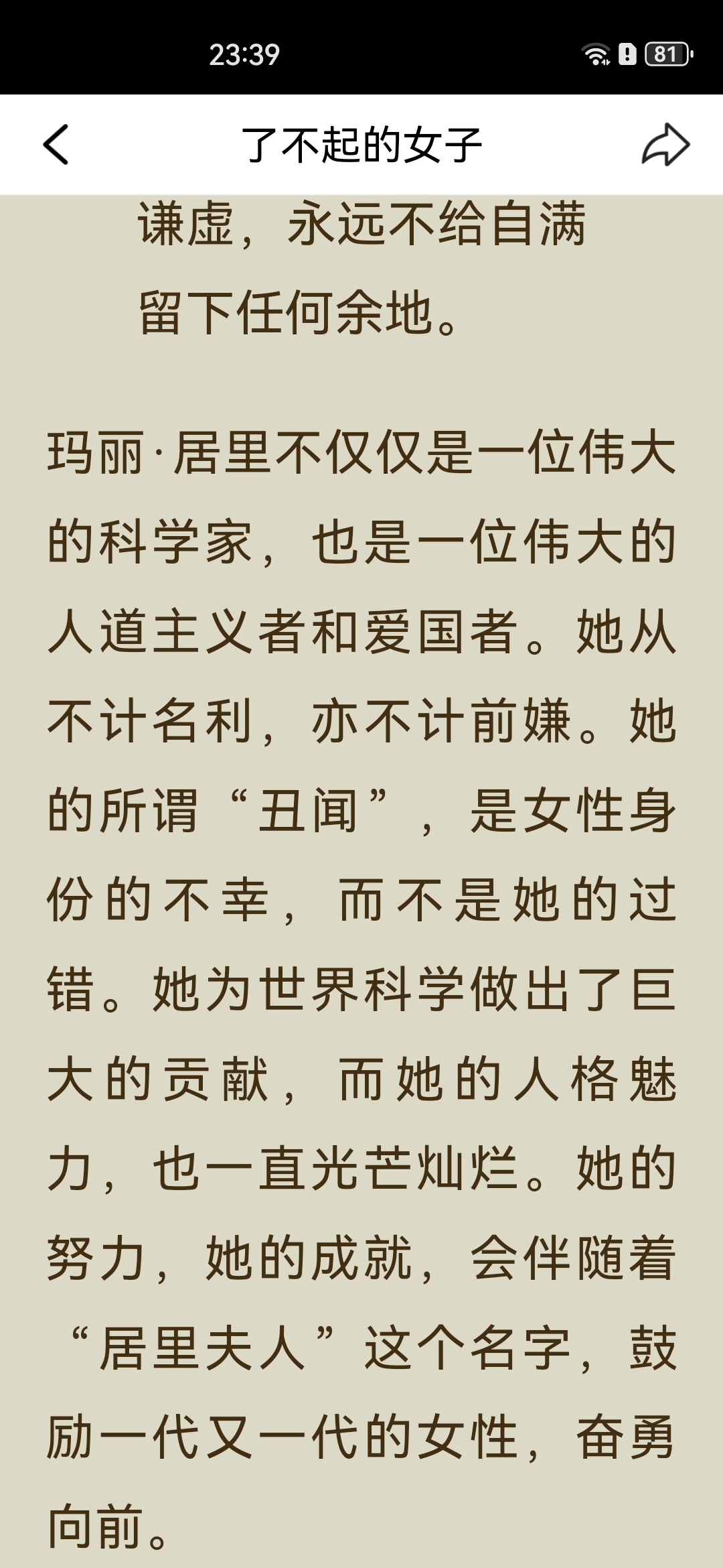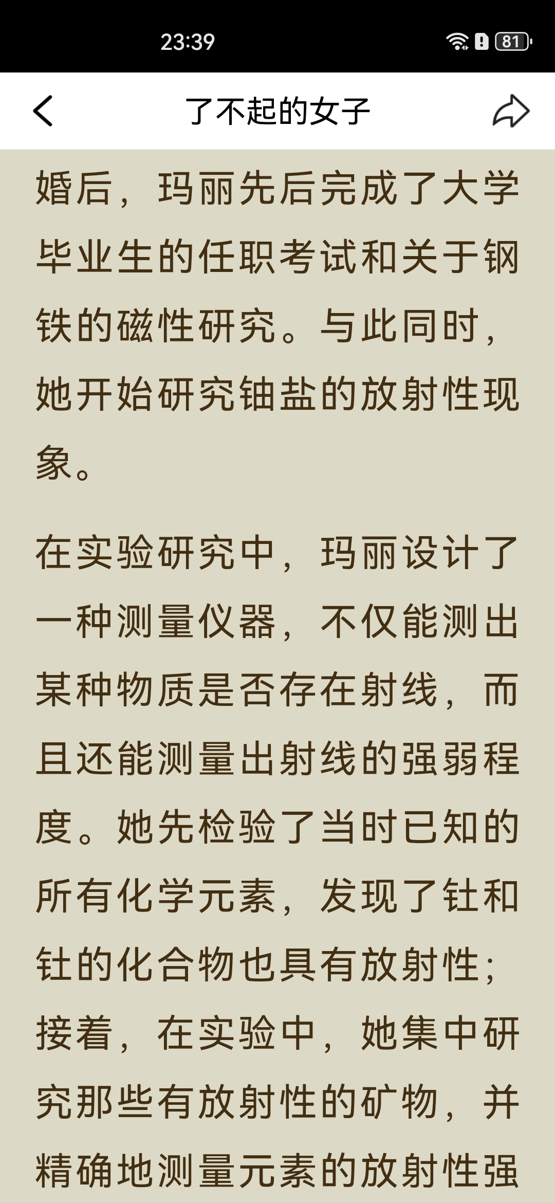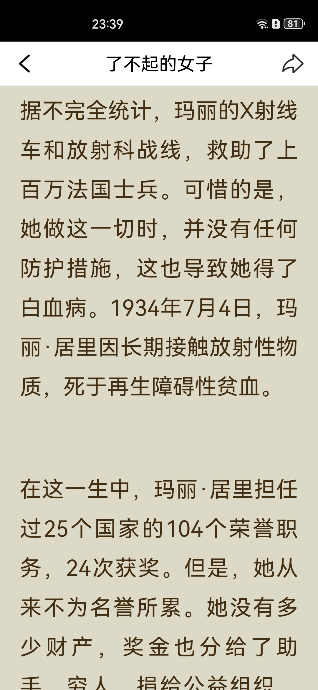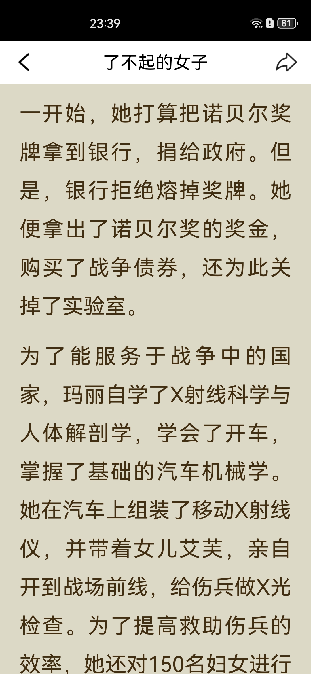 《了不起的女子》之“居里夫人读书笔记: 一、主要内容 居里夫人(玛丽·居里)出生于波兰教师家庭,早年接连失去亲人,却始终勤奋苦学,以优异成绩完成学业。 她赴法国巴黎求学时,生活极度清贫,仍坚持钻研科学,后与皮埃尔·居里相识成婚,共同投身放射性研究,先后发现钋和镭,成为首位两获诺贝尔奖的科学家。 一战爆发后,她将奖金捐给国家,自学X射线技术,带着设备奔赴战场救助伤兵;一生淡泊名利,将奖金与科研成果无私分享,还成功培养出优秀的子女,最终因长期接触放射性物质病逝。 二、阅读体会 居里夫人最打动人的,从来不是“诺贝尔奖得主”的光环,而是她把“苦日子过成光”的韧劲。 求学时饿肚子、冻得睡不着都不放弃,搞科研时在破棚子里熬好几年,成名后还能把奖金全捐出去,甚至上战场救士兵。她既扛得住生活的苦,也守得住内心的纯粹,这种“对科学赤诚、对世界温柔”的气质,比任何成就都更有力量。