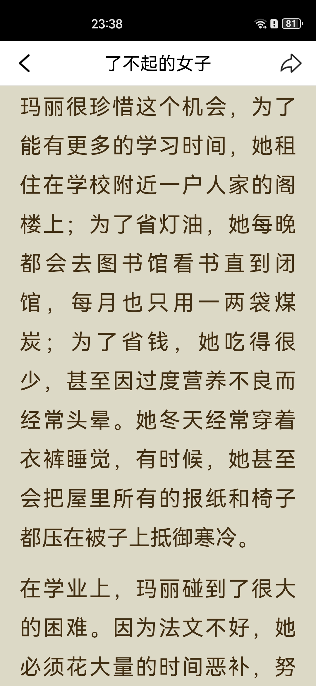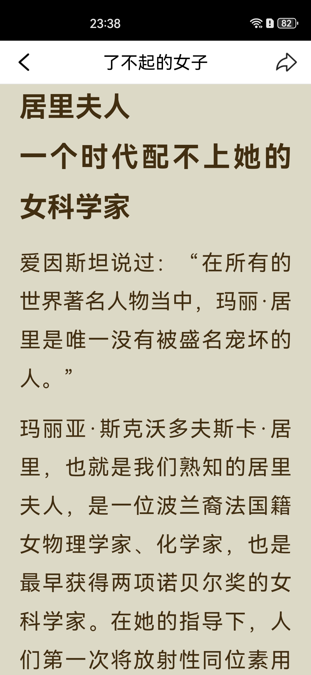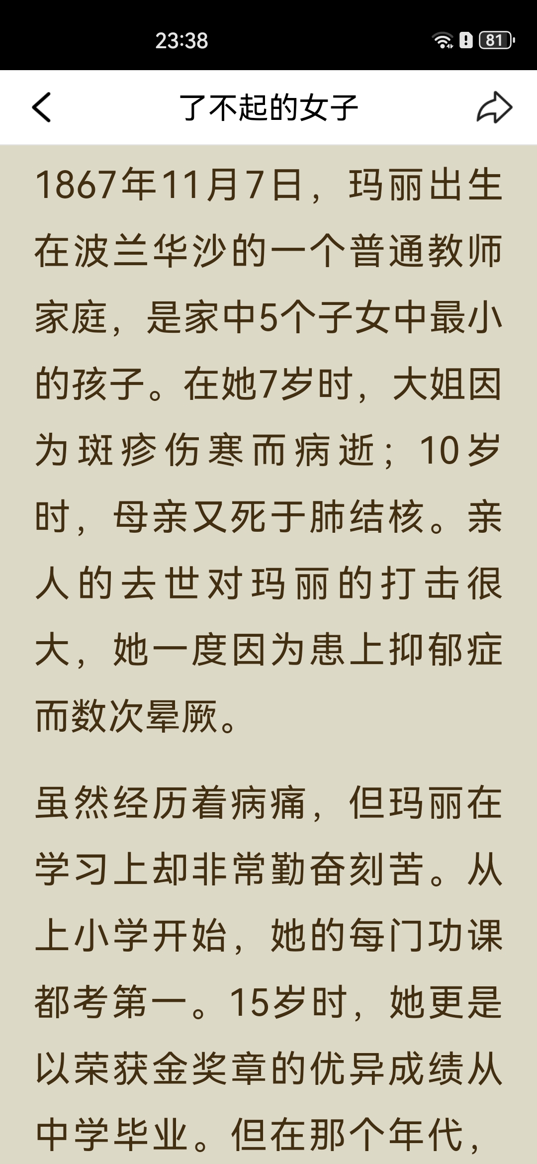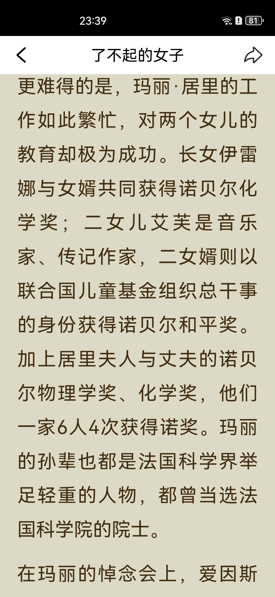 《了不起的女子》之“居里夫人读书笔记: 一、主要内容 居里夫人(玛丽·居里)出生于波兰教师家庭,早年接连失去亲人,却始终勤奋苦学,以优异成绩完成学业。 她赴法国巴黎求学时,生活极度清贫,仍坚持钻研科学,后与皮埃尔·居里相识成婚,共同投身放射性研究,先后发现钋和镭,成为首位两获诺贝尔奖的科学家。 一战爆发后,她将奖金捐给国家,自学X射线技术,带着设备奔赴战场救助伤兵;一生淡泊名利,将奖金与科研成果无私分享,还成功培养出优秀的子女,最终因长期接触放射性物质病逝。 二、阅读体会 居里夫人最打动人的,从来不是“诺贝尔奖得主”的光环,而是她把“苦日子过成光”的韧劲。 求学时饿肚子、冻得睡不着都不放弃,搞科研时在破棚子里熬好几年,成名后还能把奖金全捐出去,甚至上战场救士兵。她既扛得住生活的苦,也守得住内心的纯粹,这种“对科学赤诚、对世界温柔”的气质,比任何成就都更有力量。