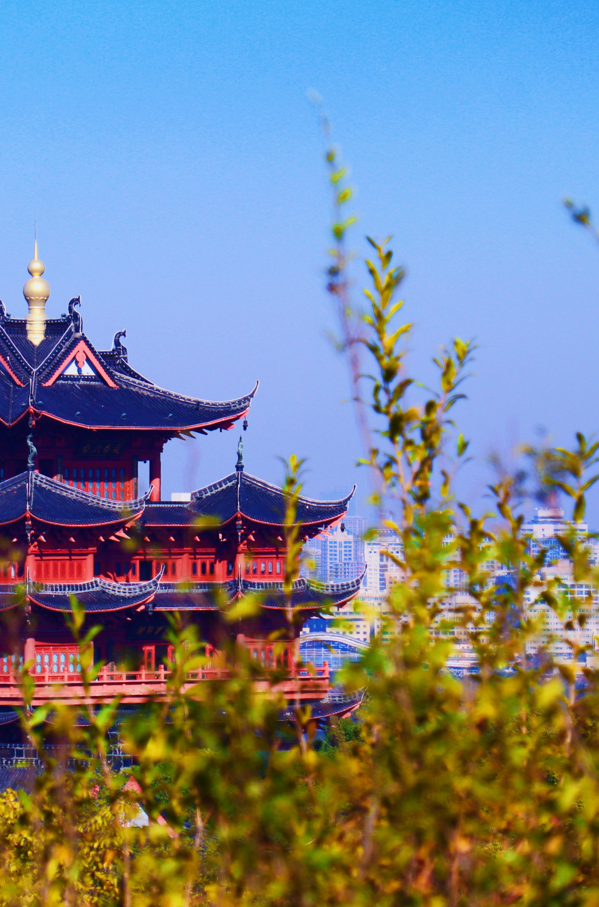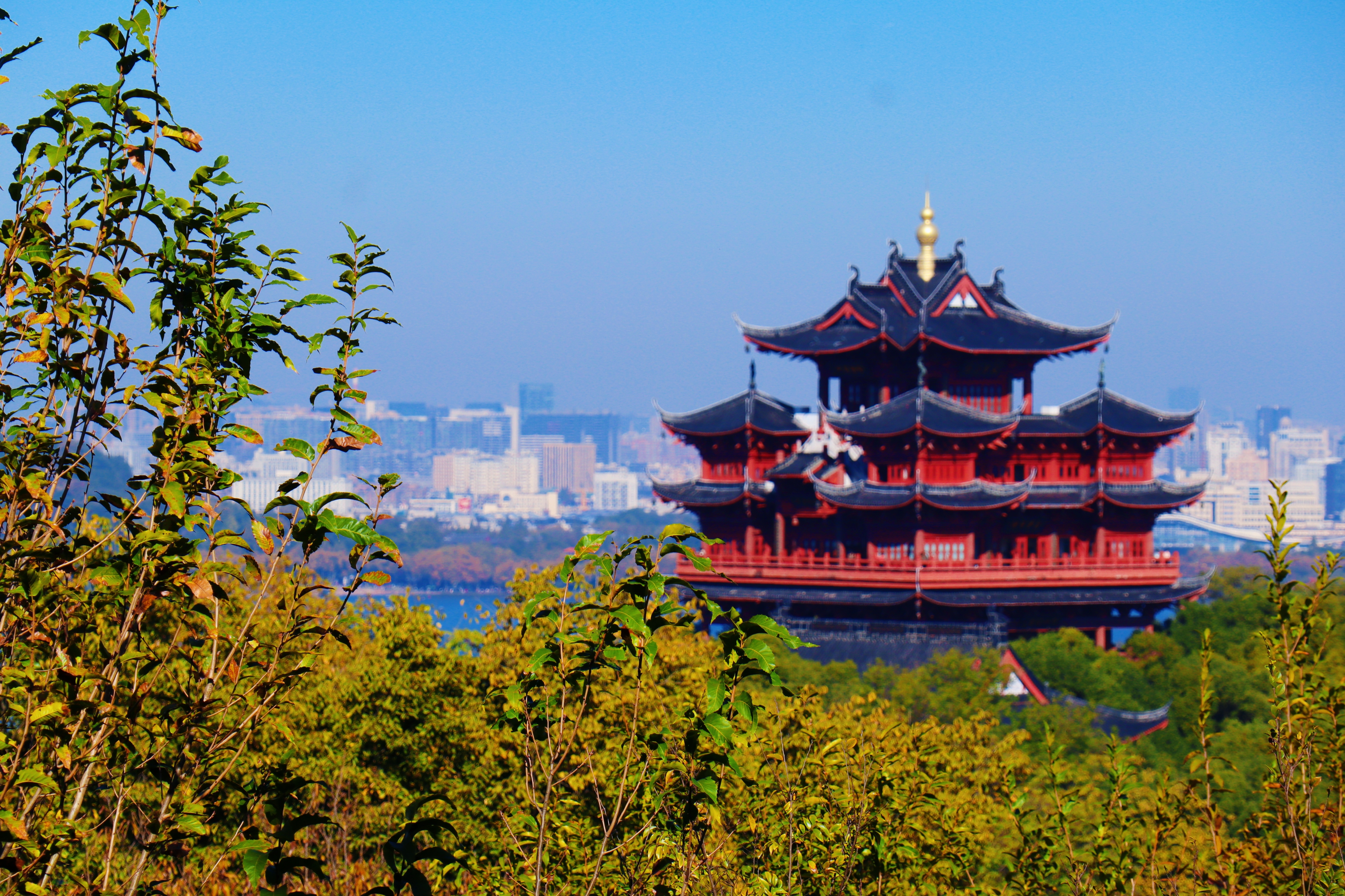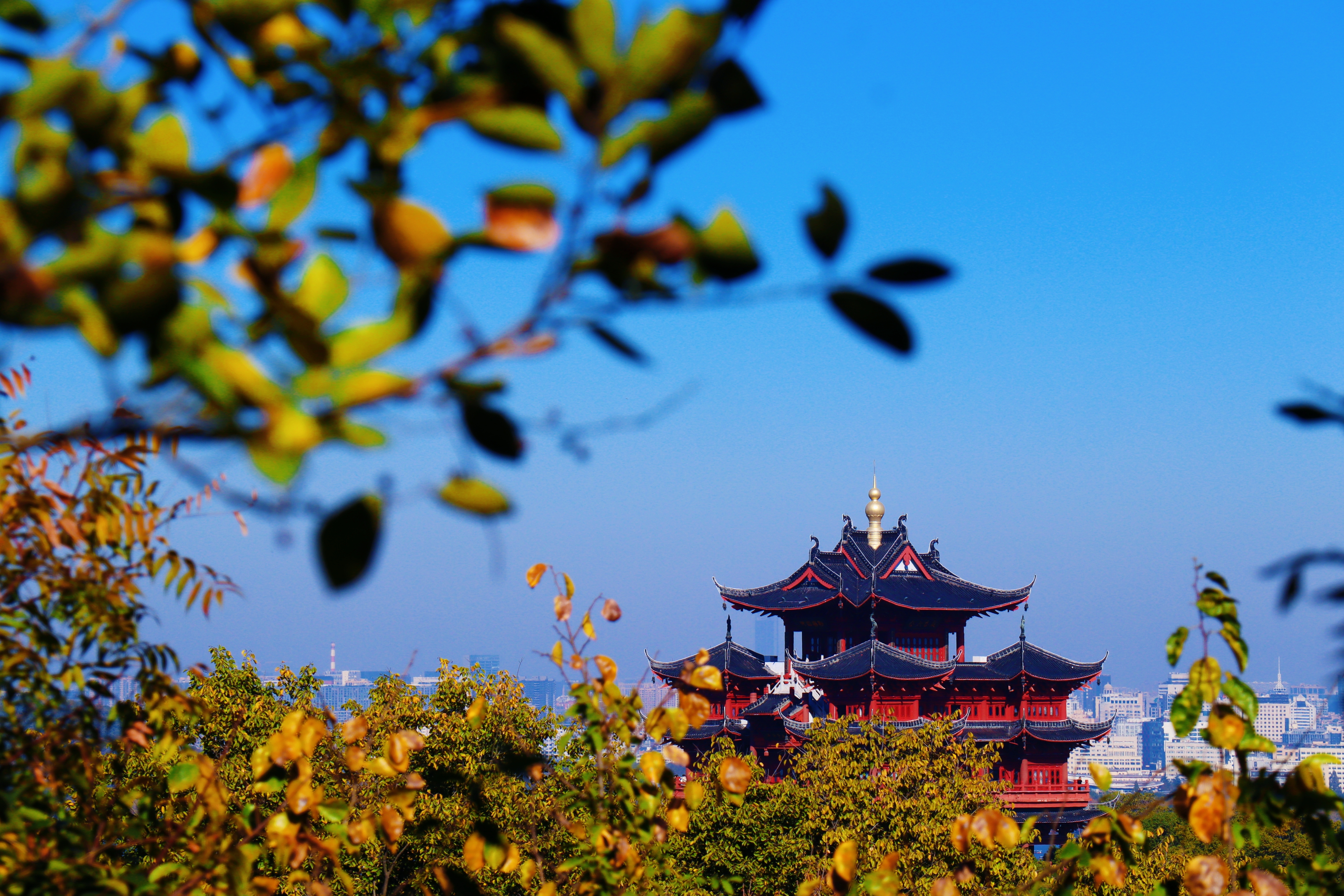 杜甫草堂飞檐翘角,红墙黛瓦映秋光;西湖畔上城楼静立,金顶融于蓝天,古意与城韵共长。