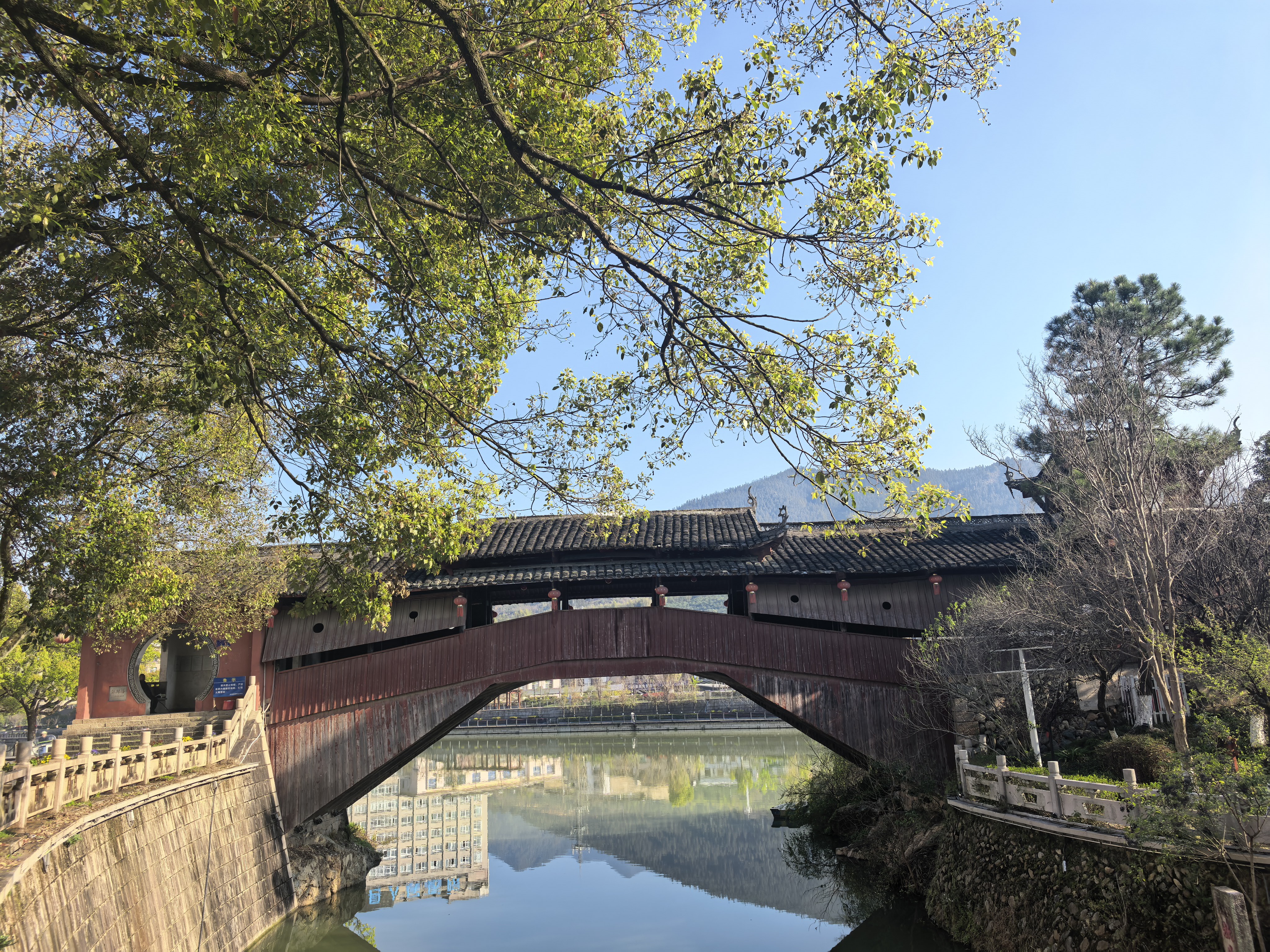 廊桥静卧上清溪,红灯映瓦,绿树筛光,水影摇曳——菇城春日,随手一拍都是水墨画~