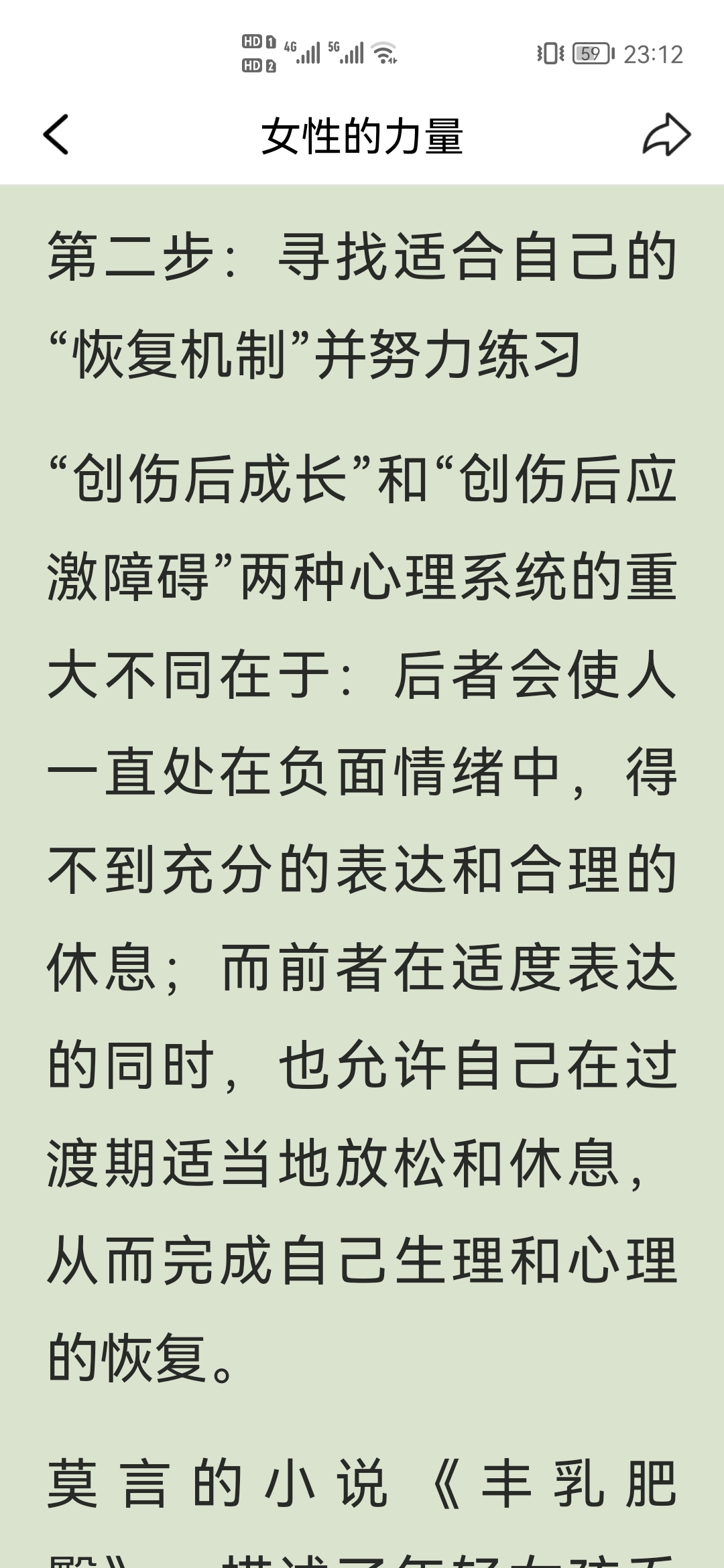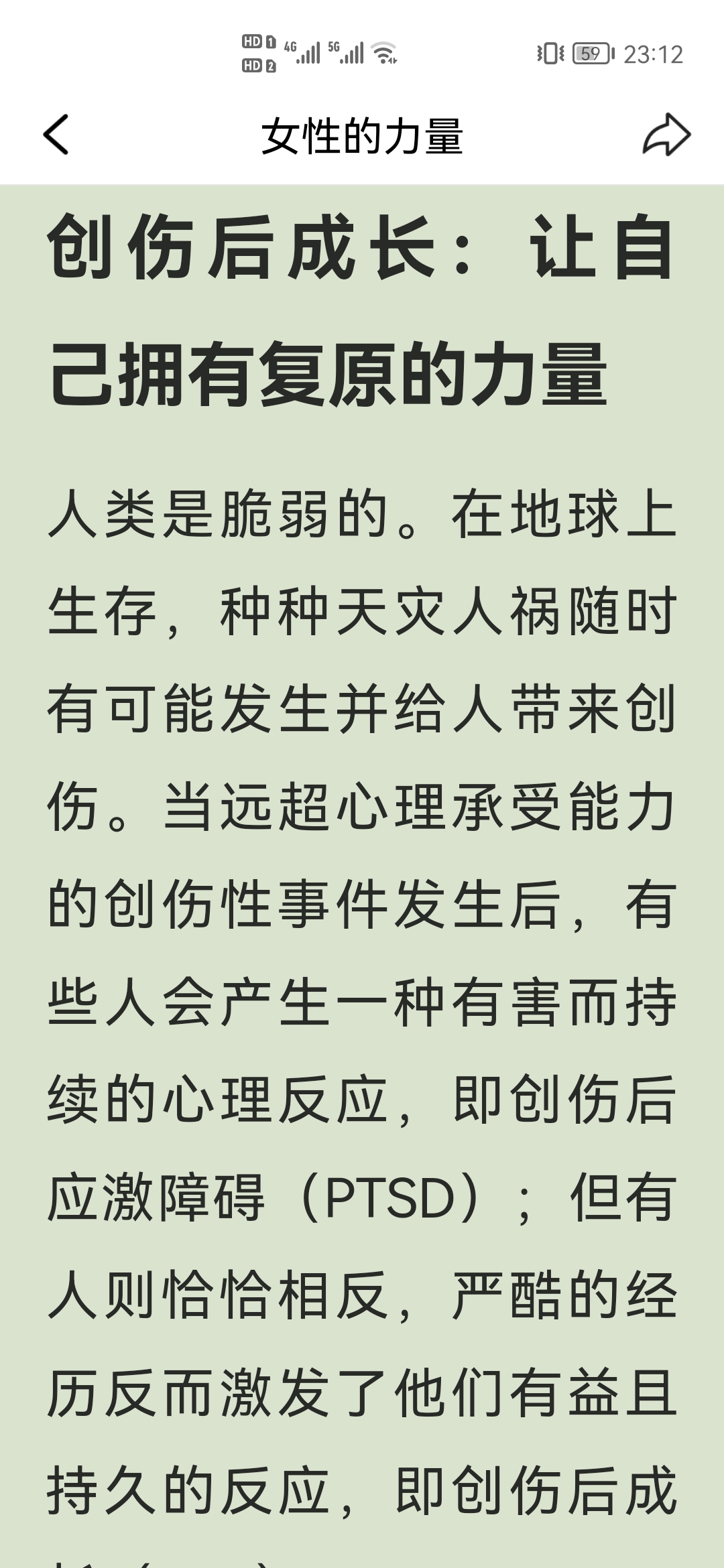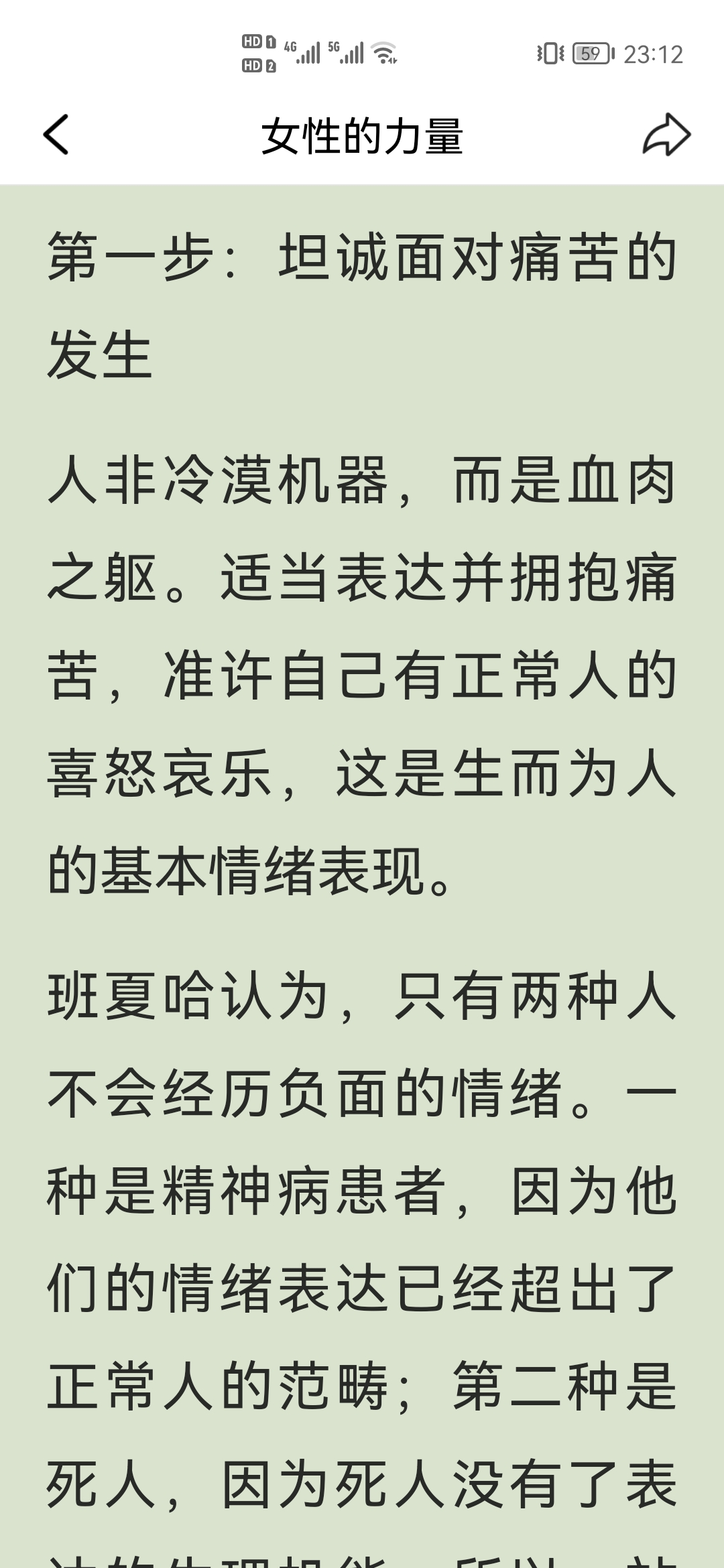 《女性的力量》第六章第三小节阅读体会: 一、主要内容 这一小节的核心是“创伤后成长:让自己拥有复原的力量”,围绕如何从挫折和创伤中恢复并成长,给出了清晰的三步法: 1. 第一步:坦诚面对痛苦的发生 - 人不是机器,有喜怒哀乐是正常的,负面情绪不是洪水猛兽。 - 引用班夏哈的观点:只有精神病人和死人才不会有负面情绪,所以允许自己痛苦、表达痛苦,是复原的第一步。 2. 第二步:寻找适合自己的“恢复机制”并练习 - 身体和心理都需要恢复期,否则创伤会让心理从脆弱变易碎。 - 具体的恢复方式: - 日常恢复:工作/学习间隙每1-2小时休息15分钟,或做几次深呼吸、伸懒腰。 - 适当运动:通过运动释放血清素和多巴胺,增强心理韧性,缓解焦虑抑郁。 - 好好睡觉:找到适合自己的生物钟,睡不着就闭眼冥想,别用电子产品消耗大脑。 - 固定休息:每周休息日、每年休假日,避免长期透支。 - 核心是:恢复不是浪费时间,而是为了更好地重启,就像“饥来吃饭,困来眠”,把简单的事做好就是福气。 3. 第三步:让自己在爱的花园中散步 - 挫折来临时,除了专业人士,信任的家人、朋友是重要的支撑。 - 警惕“功能性社交”:不要为了存在感而广交朋友,要建立小而深的人际圈,能分享悲欢、抵御孤独。 - 最后升华到“臣服于无常”:接受“一切都是最好的发生”,不是认命,而是放下抗拒,理性看待当下,把人生的每一张牌都尽力打好。 二、阅读体会 这一节读下来,我最大的感受是:原来“崩溃”和“复原”,都是我们天生就有的权利和能力。 以前我总觉得,遇到事要“扛住”“不能哭”“要坚强”,把负面情绪当成软弱的证明。结果就是,情绪像被堵住的洪水,越憋越凶,最后反而把自己冲垮。这一节直接点醒我:允许自己难过,才是真的对自己负责。就像感冒了要吃药休息一样,心里受伤了,也得给它留个“养病”的时间。 最戳我的是“恢复机制”那部分。我以前总觉得“休息”是偷懒,比如中午不睡、晚上刷手机到凌晨,美其名曰“抓住属于自己的时间”。现在才明白,那些看似“没用”的发呆、散步、睡觉,才是给心理充电的关键。就像手机没电了要充,人也一样,硬扛只会让系统崩盘。我现在开始试着每天留10分钟什么都不做,就坐着发呆,反而觉得整个人轻松了很多。 还有“小而深的人际圈”这点,太扎心了。我们这代人,微信好友几千,能半夜打电话说心事的,可能一个都没有。以前我会焦虑“是不是我人缘不好”,现在才懂:朋友不在多,在“精”。有那么一两个能听你吐槽、陪你哭的人,比几百个点赞之交有用一万倍。 最后那句“臣服于无常”,我以前觉得是鸡汤,现在才懂它的意思。不是让我们逆来顺受,而是别跟已经发生的事较劲。就像手里抓了一把烂牌,抱怨、生气都没用,不如静下心来,想想怎么把这把牌打好。毕竟,人生不是比谁的牌好,而是比谁更会打。 总的来说,这一节就是在教我们:做个“会疼、会休息、会求助”的普通人,比做个“永远坚强”的超人,更有力量。