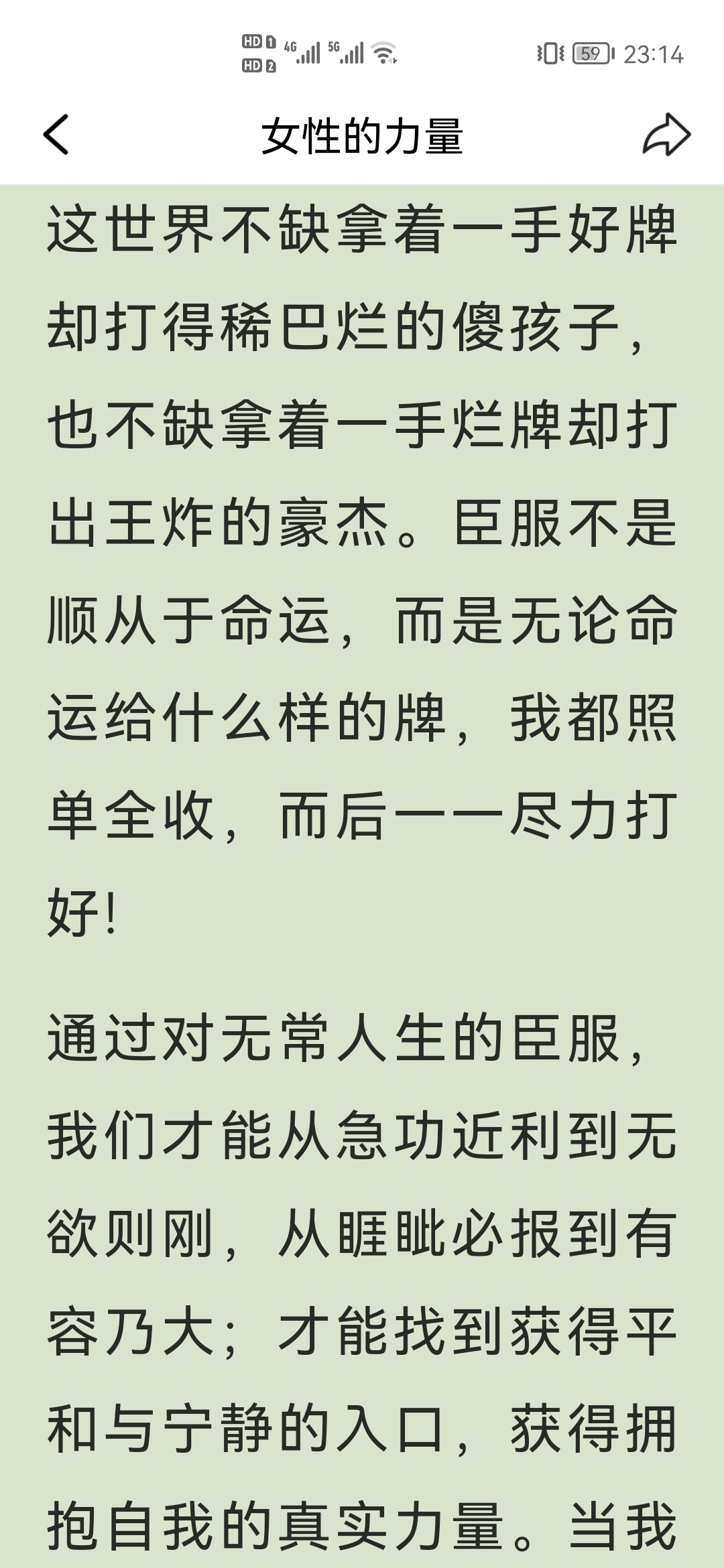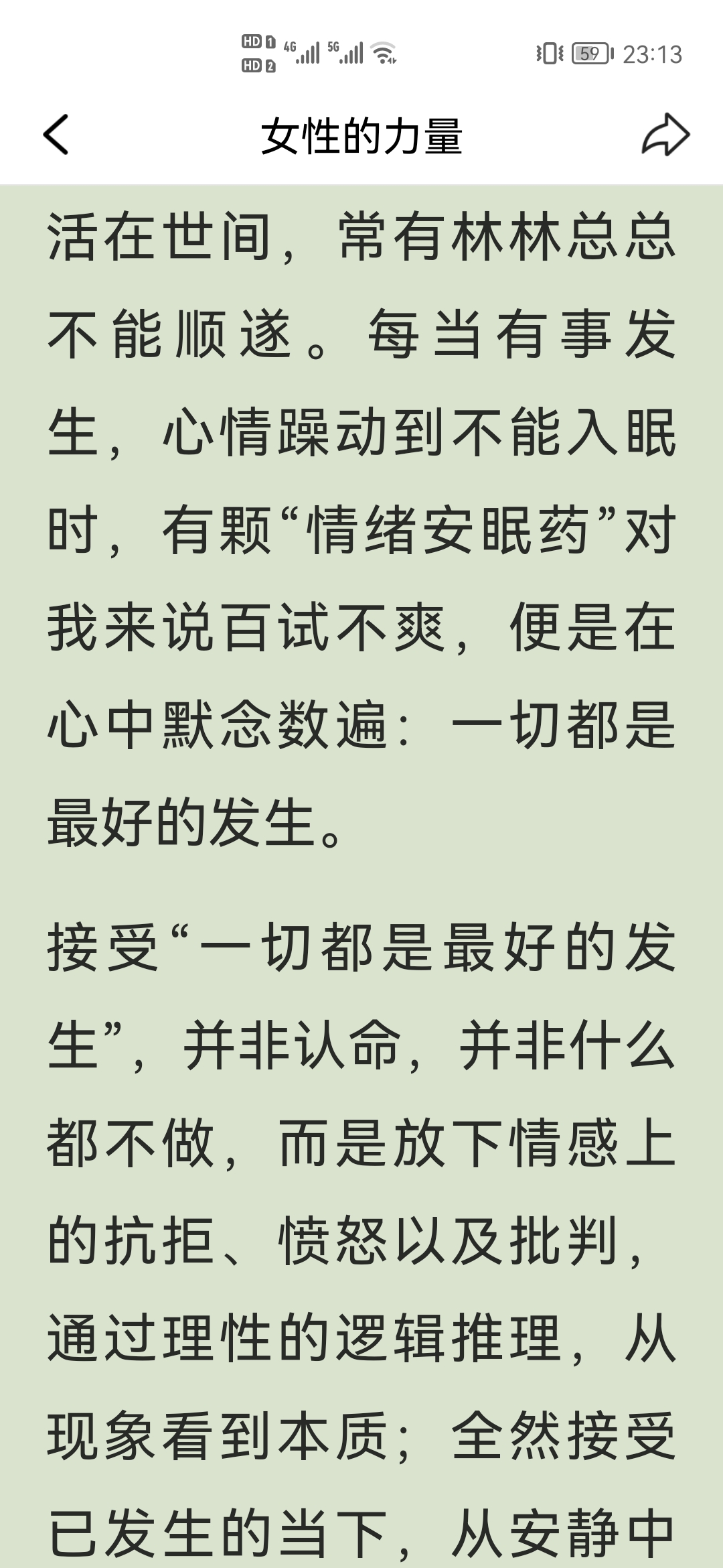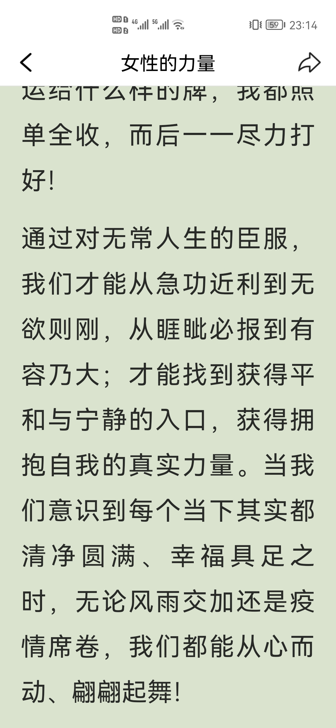 《女性的力量》第六章第三小节阅读体会: 一、主要内容 这一小节的核心是“创伤后成长:让自己拥有复原的力量”,围绕如何从挫折和创伤中恢复并成长,给出了清晰的三步法: 1. 第一步:坦诚面对痛苦的发生 - 人不是机器,有喜怒哀乐是正常的,负面情绪不是洪水猛兽。 - 引用班夏哈的观点:只有精神病人和死人才不会有负面情绪,所以允许自己痛苦、表达痛苦,是复原的第一步。 2. 第二步:寻找适合自己的“恢复机制”并练习 - 身体和心理都需要恢复期,否则创伤会让心理从脆弱变易碎。 - 具体的恢复方式: - 日常恢复:工作/学习间隙每1-2小时休息15分钟,或做几次深呼吸、伸懒腰。 - 适当运动:通过运动释放血清素和多巴胺,增强心理韧性,缓解焦虑抑郁。 - 好好睡觉:找到适合自己的生物钟,睡不着就闭眼冥想,别用电子产品消耗大脑。 - 固定休息:每周休息日、每年休假日,避免长期透支。 - 核心是:恢复不是浪费时间,而是为了更好地重启,就像“饥来吃饭,困来眠”,把简单的事做好就是福气。 3. 第三步:让自己在爱的花园中散步 - 挫折来临时,除了专业人士,信任的家人、朋友是重要的支撑。 - 警惕“功能性社交”:不要为了存在感而广交朋友,要建立小而深的人际圈,能分享悲欢、抵御孤独。 - 最后升华到“臣服于无常”:接受“一切都是最好的发生”,不是认命,而是放下抗拒,理性看待当下,把人生的每一张牌都尽力打好。 二、阅读体会 这一节读下来,我最大的感受是:原来“崩溃”和“复原”,都是我们天生就有的权利和能力。 以前我总觉得,遇到事要“扛住”“不能哭”“要坚强”,把负面情绪当成软弱的证明。结果就是,情绪像被堵住的洪水,越憋越凶,最后反而把自己冲垮。这一节直接点醒我:允许自己难过,才是真的对自己负责。就像感冒了要吃药休息一样,心里受伤了,也得给它留个“养病”的时间。 最戳我的是“恢复机制”那部分。我以前总觉得“休息”是偷懒,比如中午不睡、晚上刷手机到凌晨,美其名曰“抓住属于自己的时间”。现在才明白,那些看似“没用”的发呆、散步、睡觉,才是给心理充电的关键。就像手机没电了要充,人也一样,硬扛只会让系统崩盘。我现在开始试着每天留10分钟什么都不做,就坐着发呆,反而觉得整个人轻松了很多。 还有“小而深的人际圈”这点,太扎心了。我们这代人,微信好友几千,能半夜打电话说心事的,可能一个都没有。以前我会焦虑“是不是我人缘不好”,现在才懂:朋友不在多,在“精”。有那么一两个能听你吐槽、陪你哭的人,比几百个点赞之交有用一万倍。 最后那句“臣服于无常”,我以前觉得是鸡汤,现在才懂它的意思。不是让我们逆来顺受,而是别跟已经发生的事较劲。就像手里抓了一把烂牌,抱怨、生气都没用,不如静下心来,想想怎么把这把牌打好。毕竟,人生不是比谁的牌好,而是比谁更会打。 总的来说,这一节就是在教我们:做个“会疼、会休息、会求助”的普通人,比做个“永远坚强”的超人,更有力量。