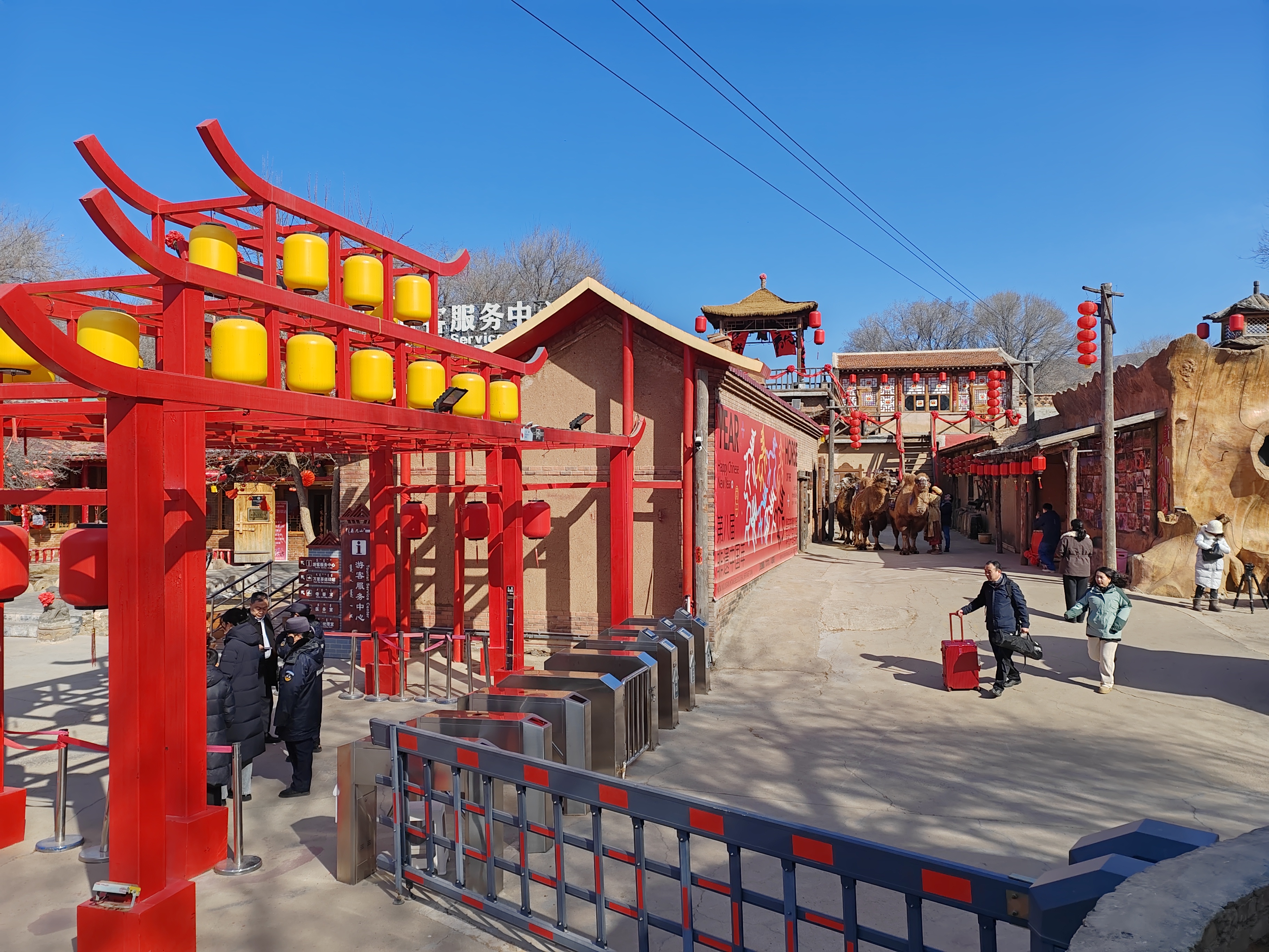 八达岭长城入口,红灯笼高挂,骆驼巡游,蓝天晴好,随手一拍都是年味儿大片~