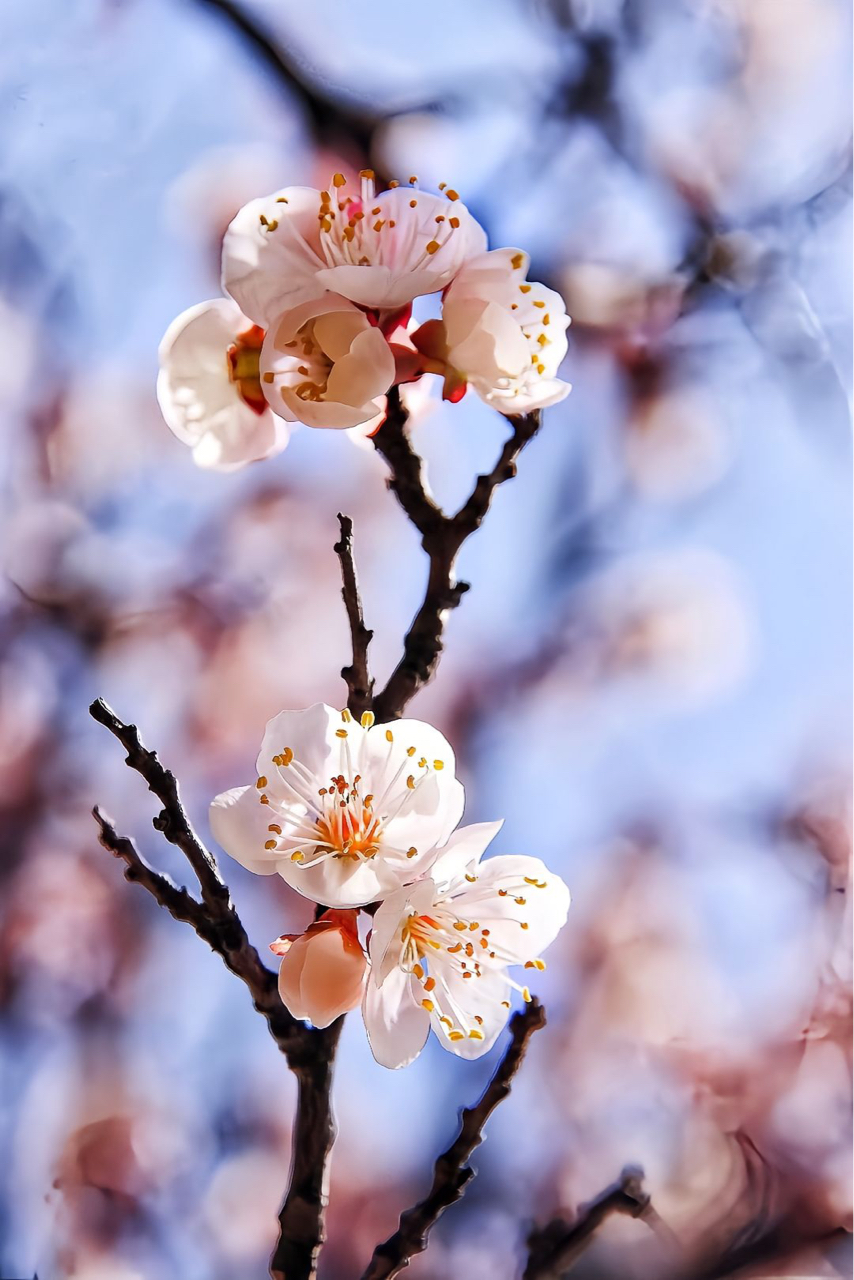 今天蹲在树下拍杏花,阳光软乎乎的,粉白花瓣衬着蓝得发亮的天,连花蕊都泛着小金光~树枝歪歪扭扭伸进画面,反而更像春天随手写的诗。快门按到手机发烫,不是在找角度,是在跟风抢花瓣!🌸