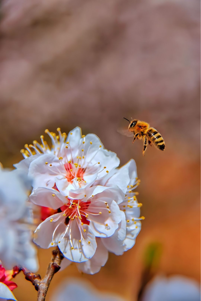 春日午后,杏花枝头正热闹~小蜜蜂嗡嗡飞来,在白瓣黄蕊间忙个不停,翅膀微颤,花粉沾满腿毛。虚化的背景里,整棵树都在呼吸。原来最甜的春天,是它们用触角丈量出来的呀~🌸🐝