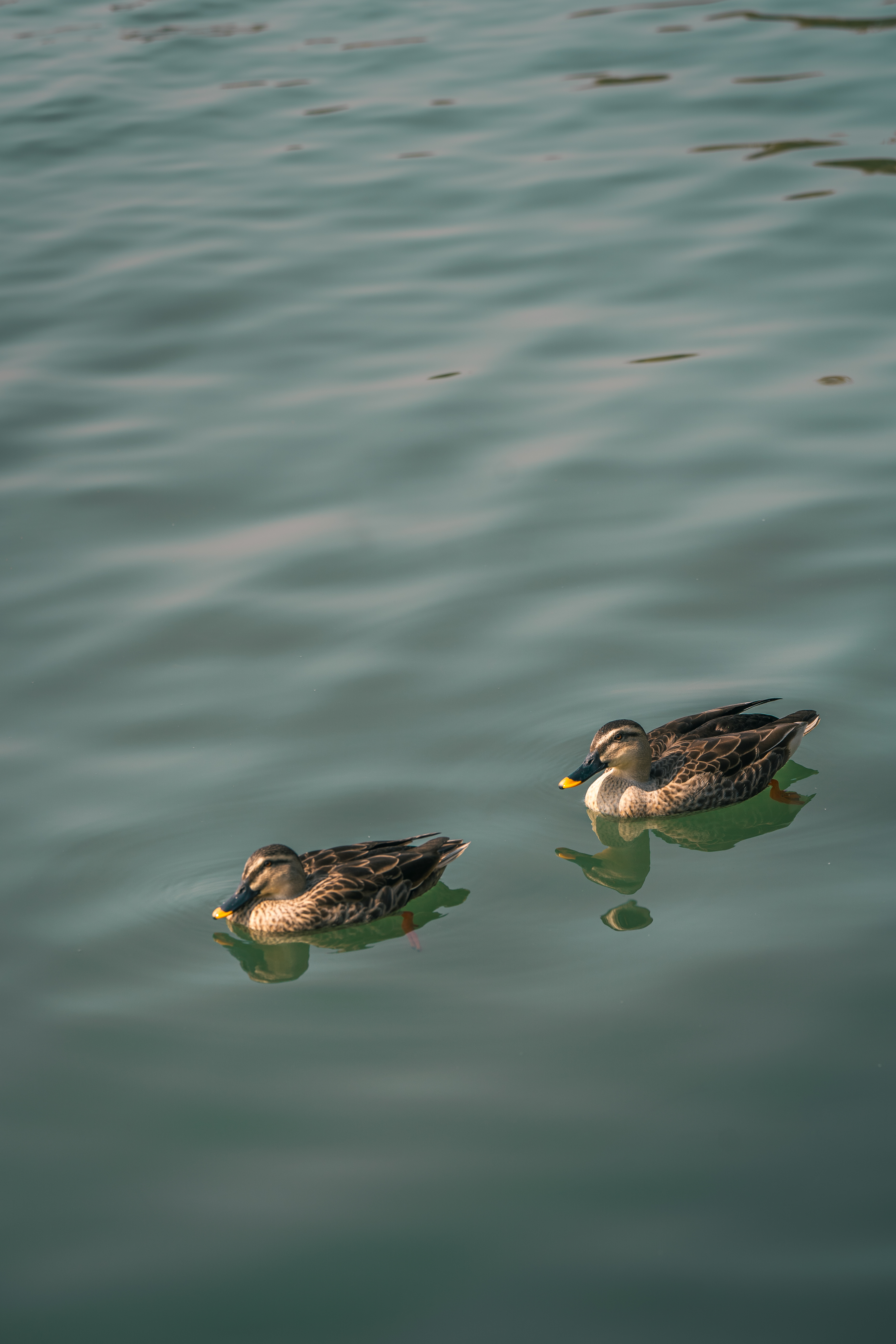 远处,水光潋滟,山色空蒙; 船行处,惊起鸥鹭一对; 近处,水波悠悠,野鸭相依; 正是西湖好时节。