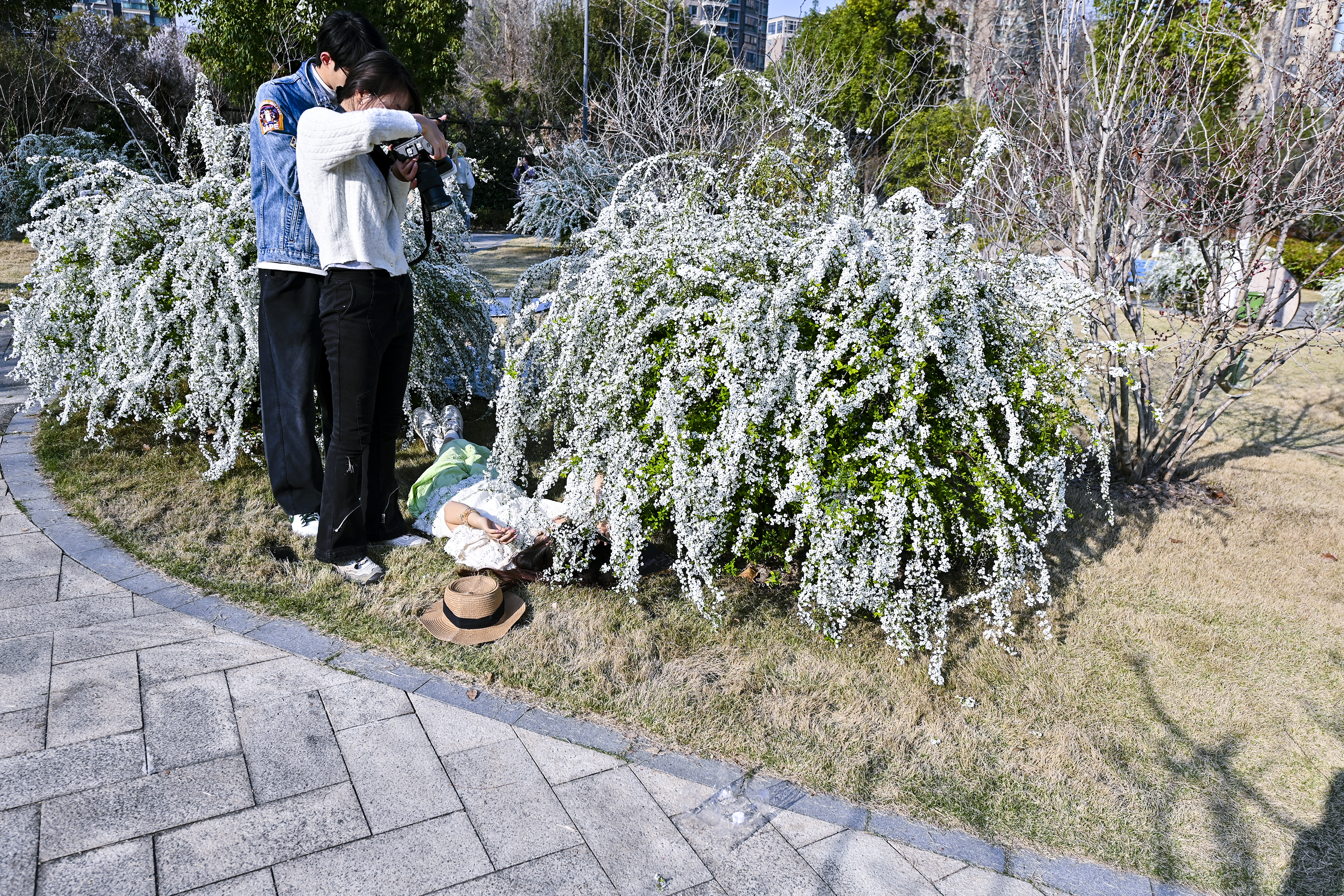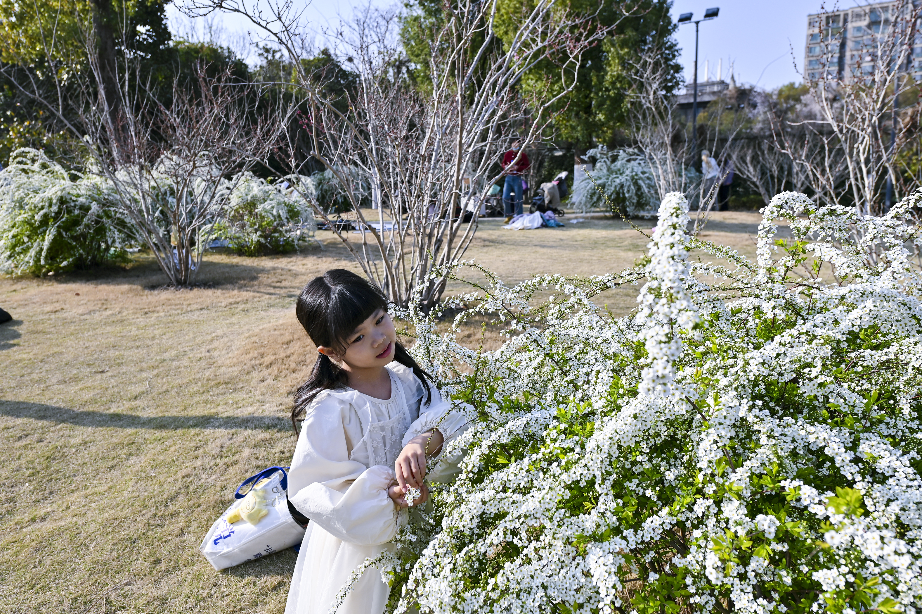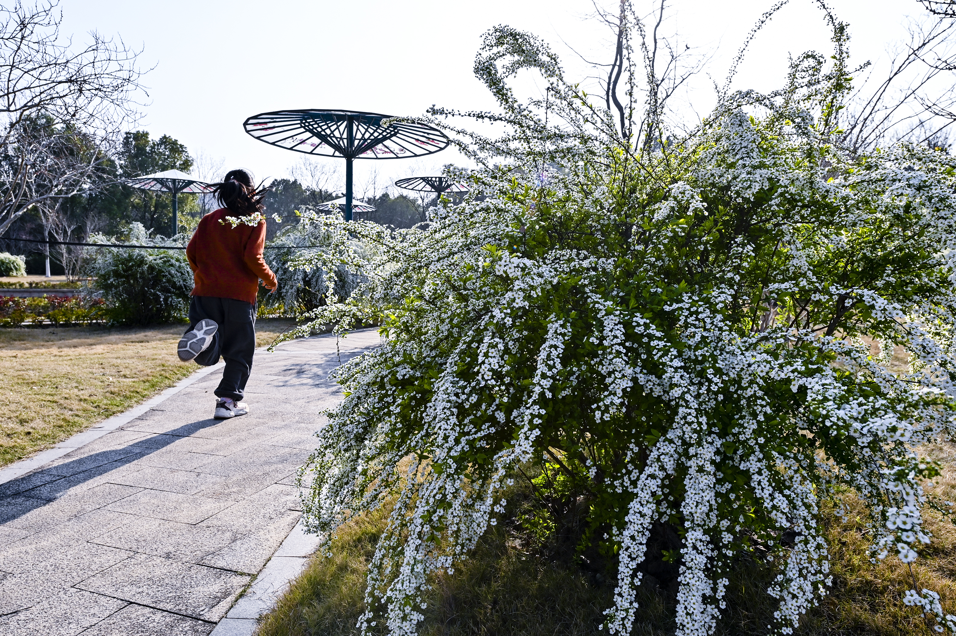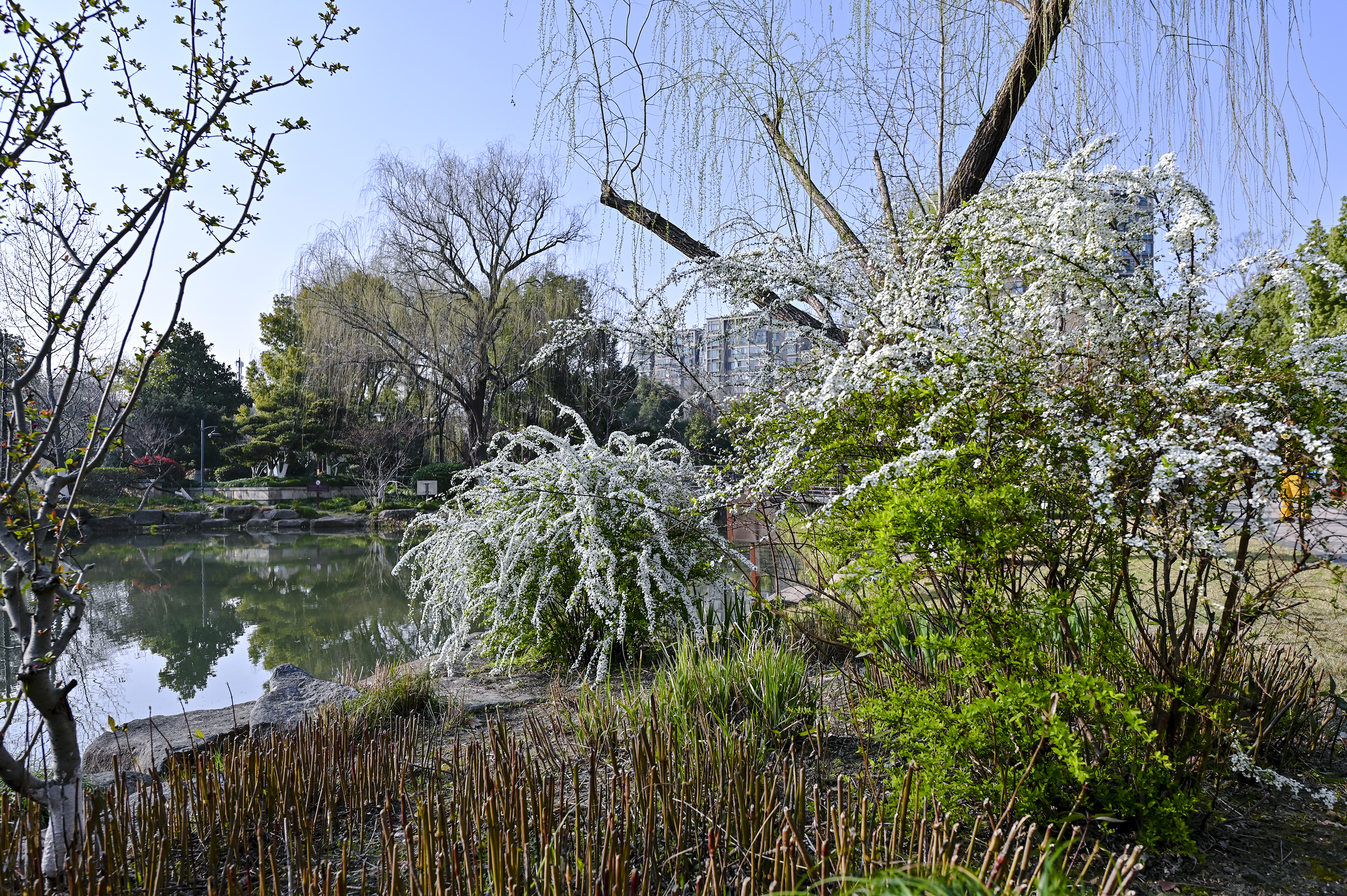 #春拍大赛#春光漫溢,喷雪花如雪铺径;女孩裙袂轻扬,垂柳拂过湖面,城市在绿意里温柔呼吸。