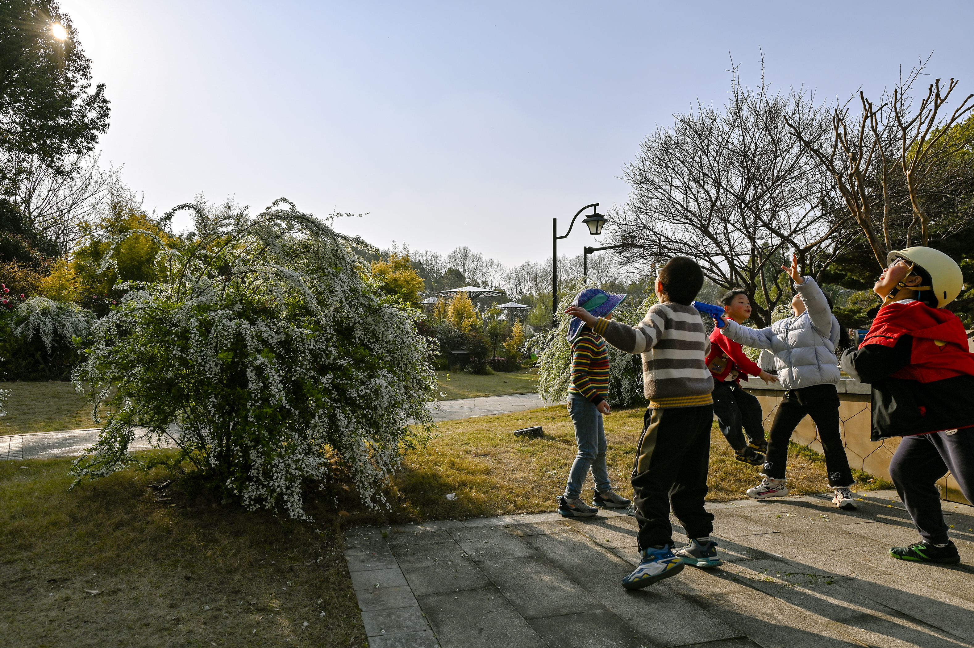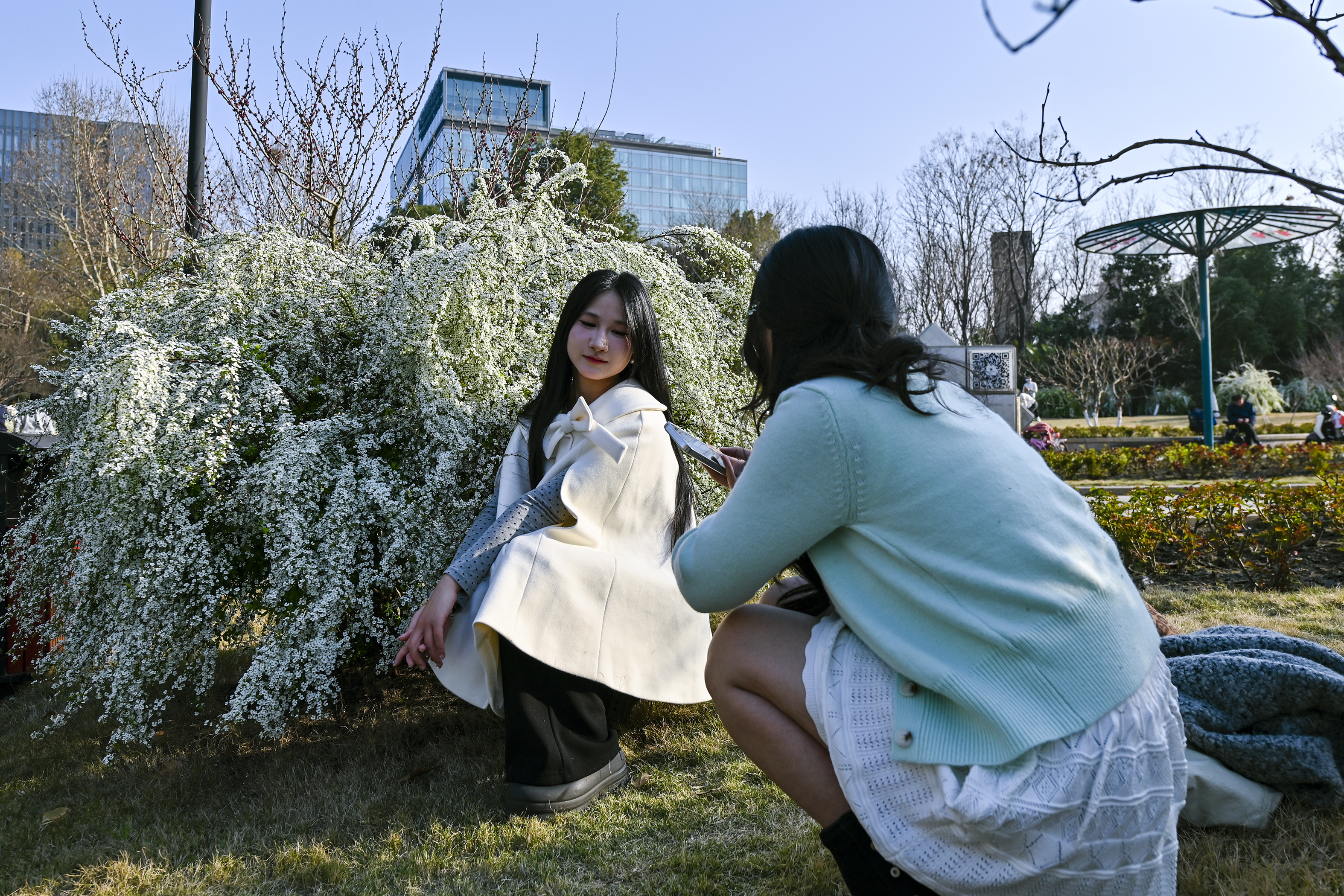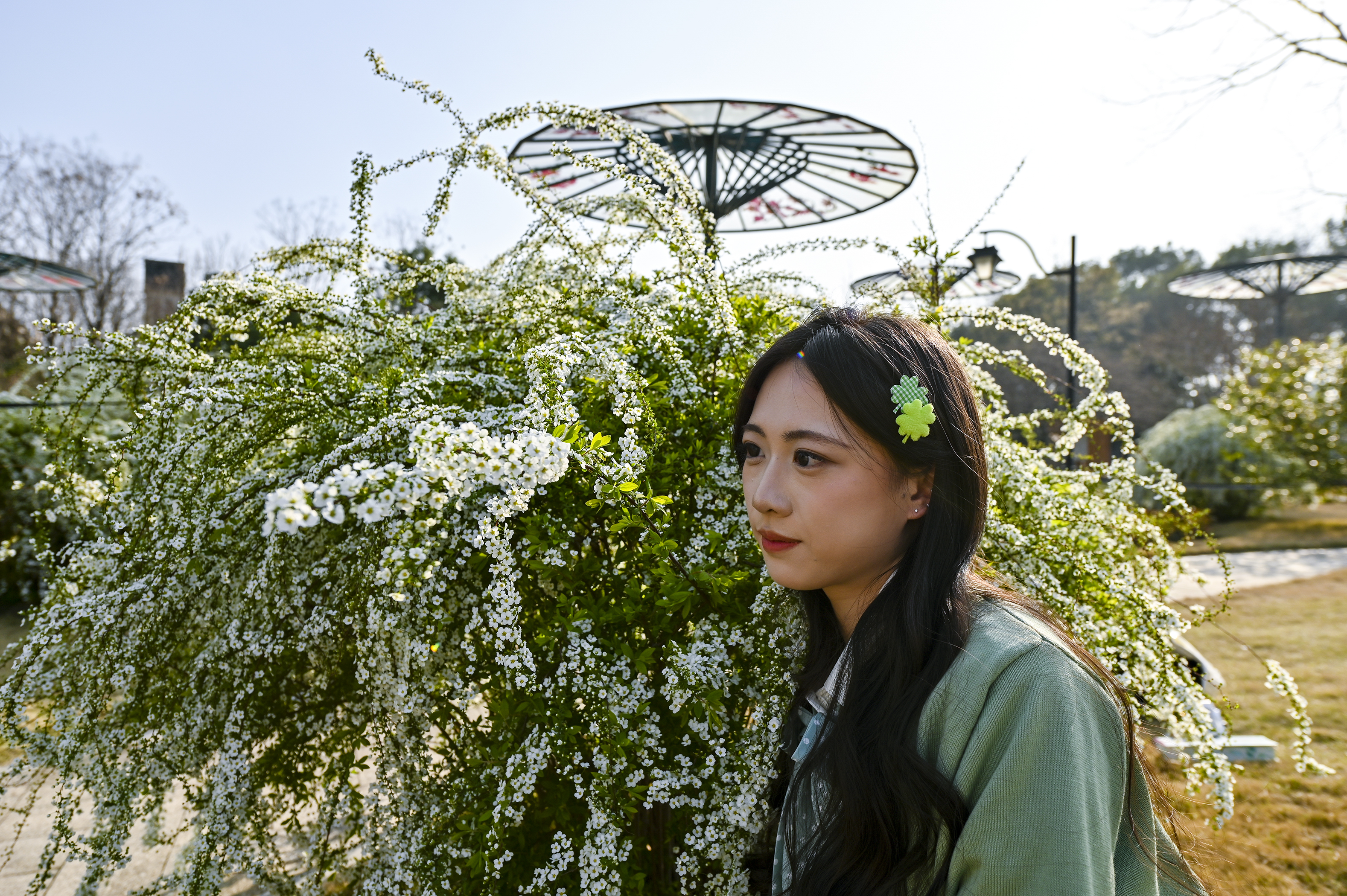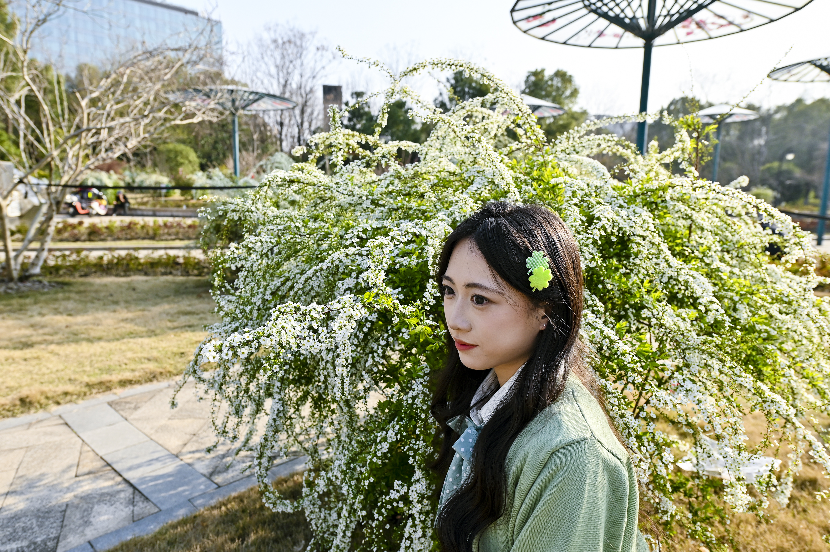 #春拍大赛#春光漫溢,喷雪花如雪铺径;女孩裙袂轻扬,垂柳拂过湖面,城市在绿意里温柔呼吸。