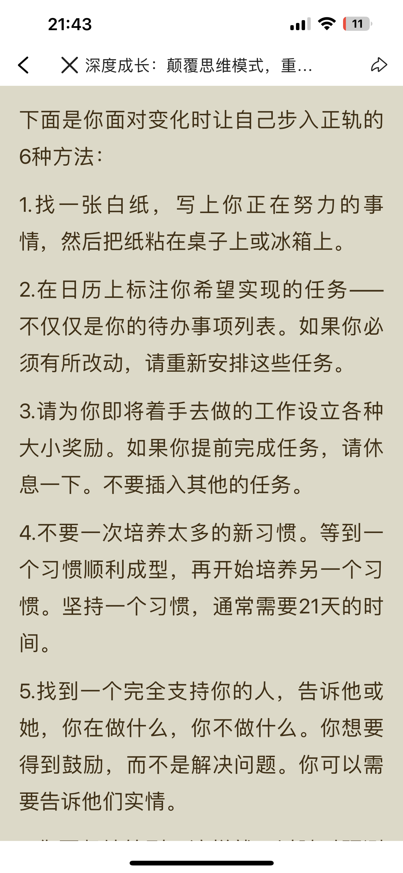 第二轮第十一天 今日摘抄: 面对变化时让自己步入正轨的 6种方法: 1.找一张白纸,写上你正在努力的事 情,然后把纸粘在桌子上或冰箱上。 2.在日历上标注你希望实现的任务一 不仅仅是你的待办事项列表。如果你必 须有所改动,请重新安排这些任务。 3.请为你即将着手去做的工作设立各种 大小奖励。如果你提前完成任务,请休 息一下。不要插入其他的任务。 4.不要一次培养太多的新习惯。等到一 个习惯顺利成型,再开始培养另一个习 惯。坚持一个习惯,通常需要21天的时 间。 5.找到一个完全支持你的人,告诉他或 她,你在做什么,你不做什么。你想要 得到鼓励,而不是解决问题。你可以需 要告诉他们实情。 6.你要坚持签到,这样就可以随时预测 你距离目标还有多远。你可以在日历上 签到,或者在笔记本或文件上做标记。 然后,花一个小时来反思自己的进展情 况。