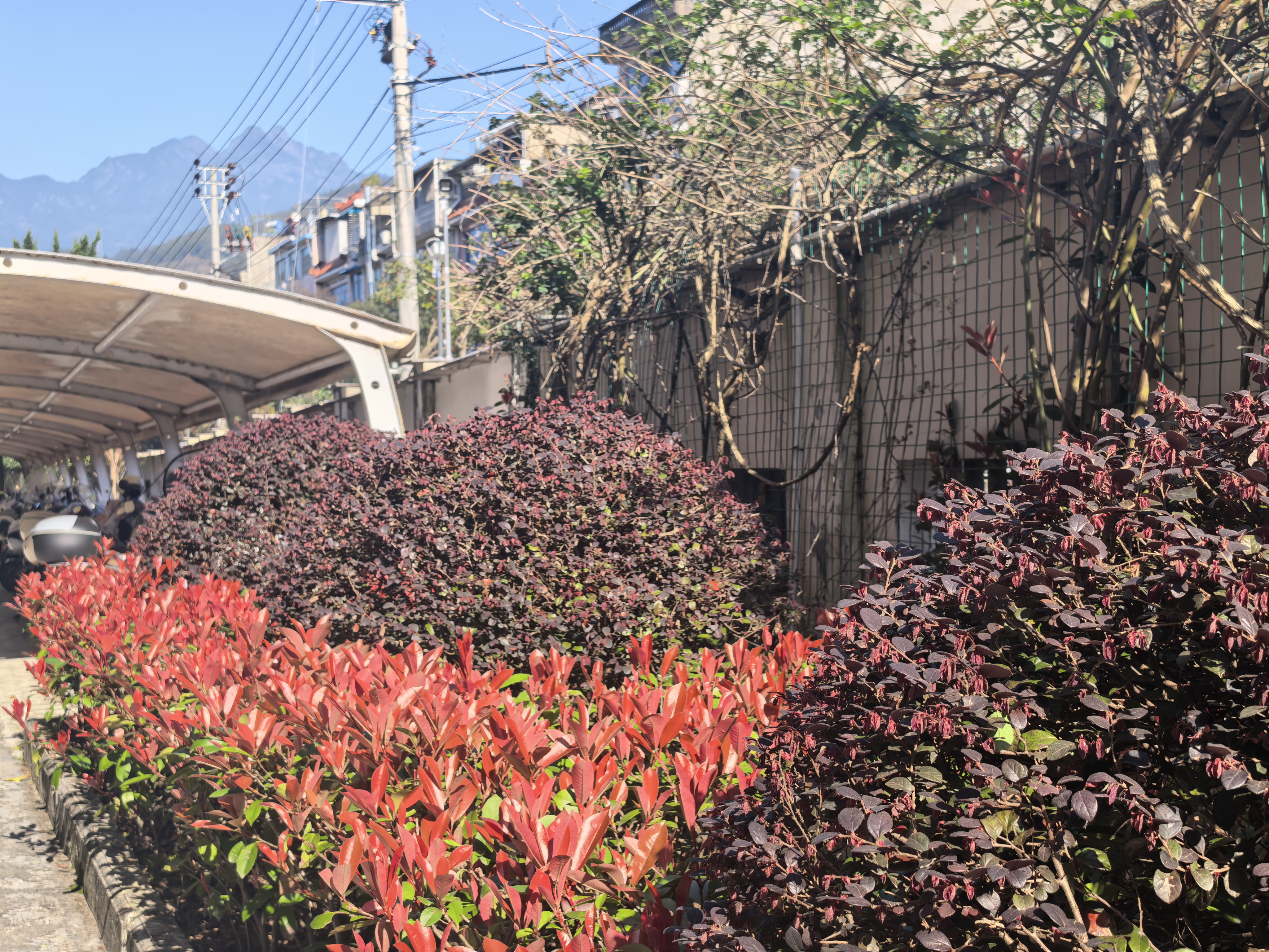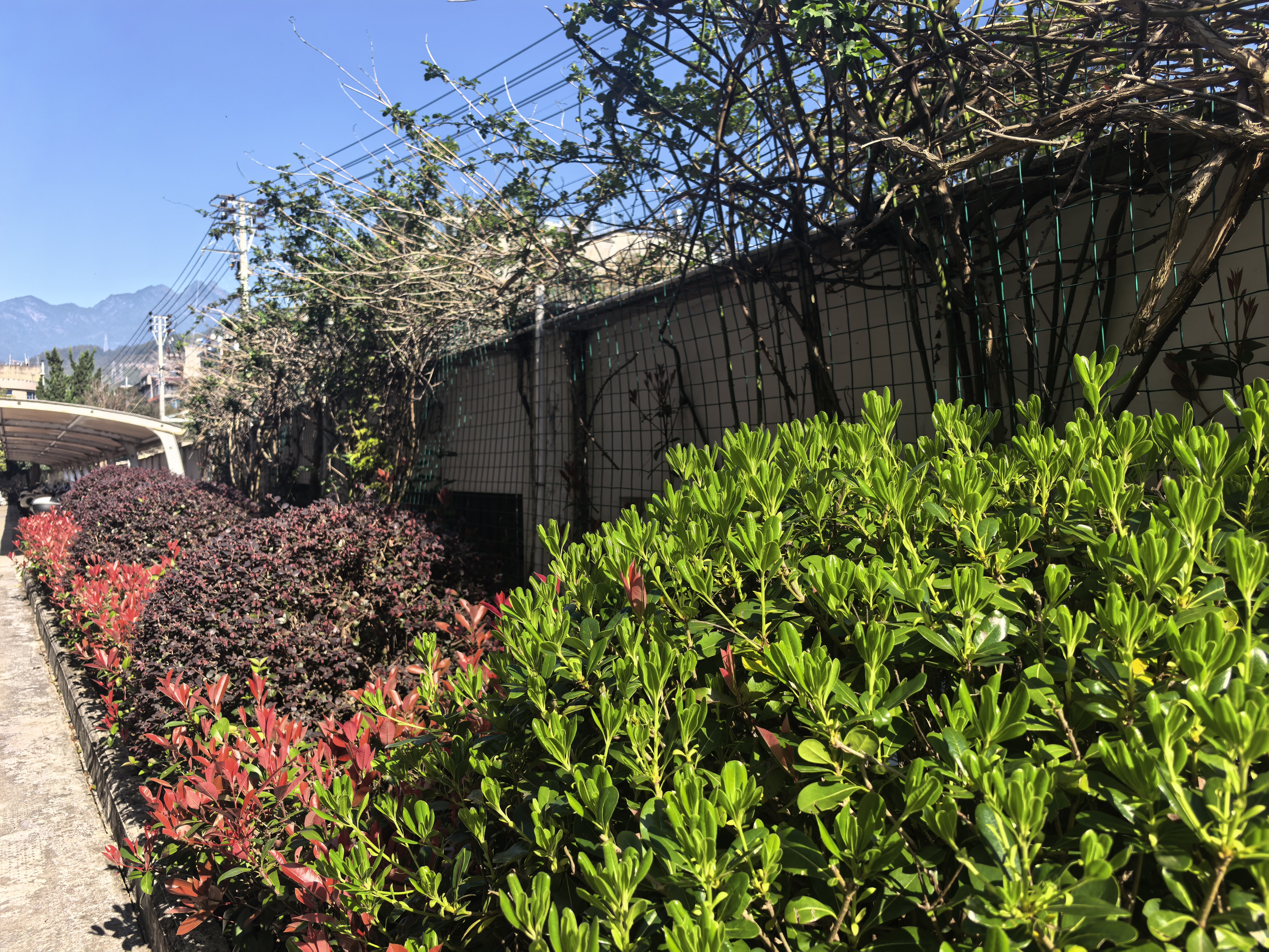 红叶石楠绿篱撞上围墙,常绿灌木与现代建筑静静对话,自然和城市原来可以这么搭~