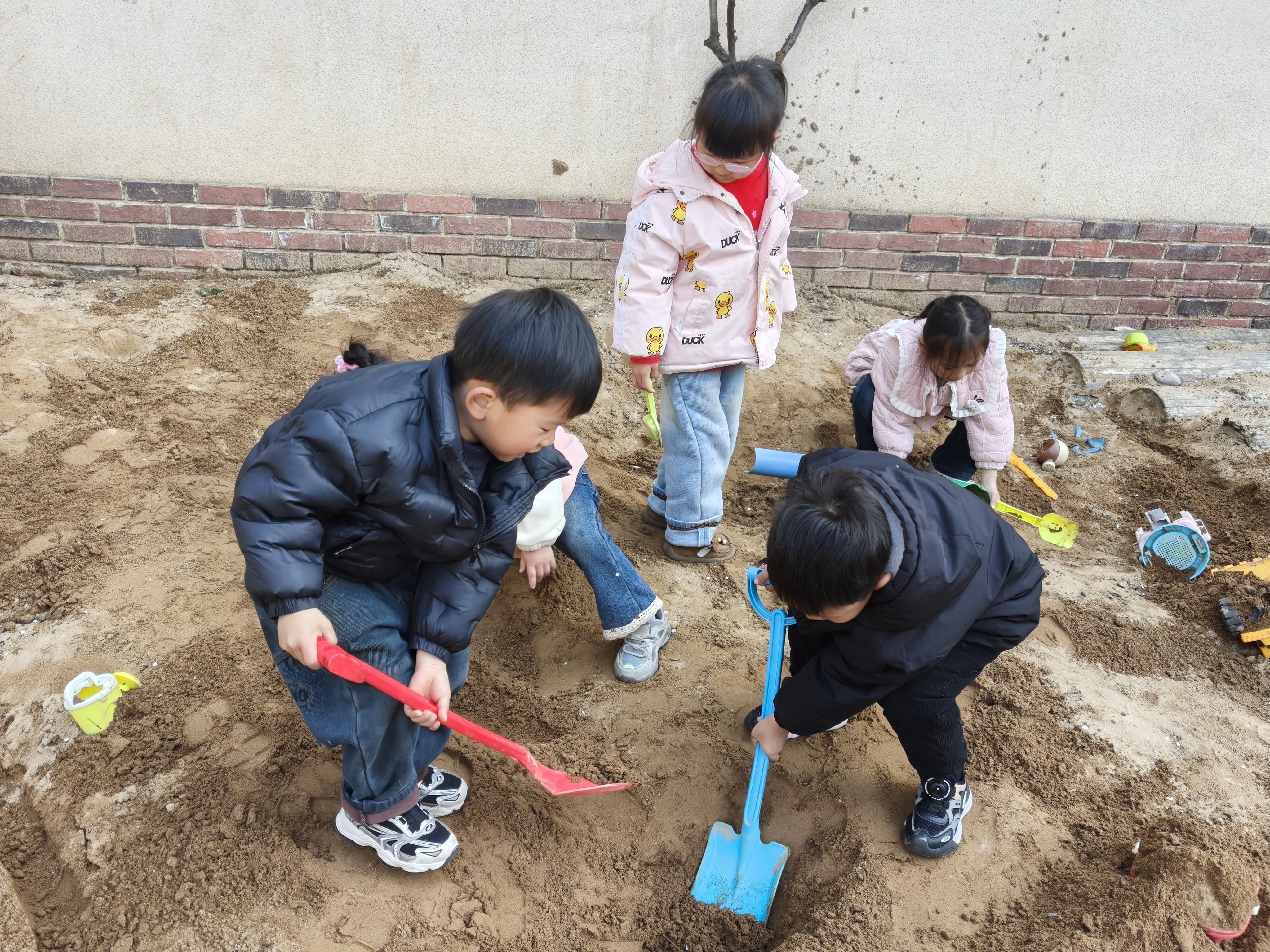 看这群小家伙们,攥着小铲子、小桶,在沙堆里忙得热火朝天~ 红铲子男孩和蓝铲子男孩正合力挖着“秘密隧道”,你一铲我一挖,沙土簌簌往下掉,还不忘互相喊着“加油!再深一点就能通到操场啦!” 旁边的小女生们也不甘示弱,有的蹲在一旁堆起“小沙丘城堡”,有的拿着小模具给城堡刻上花纹,还时不时凑在一起分享“建筑灵感”。 阳光暖暖地洒在沙粒上,孩子们的笑声混着沙土的细碎声响,每一次挖掘、每一次堆砌,都是他们对世界最天真的探索呀~在这片小小的沙池里,藏着最纯粹的快乐与无限的创造力!