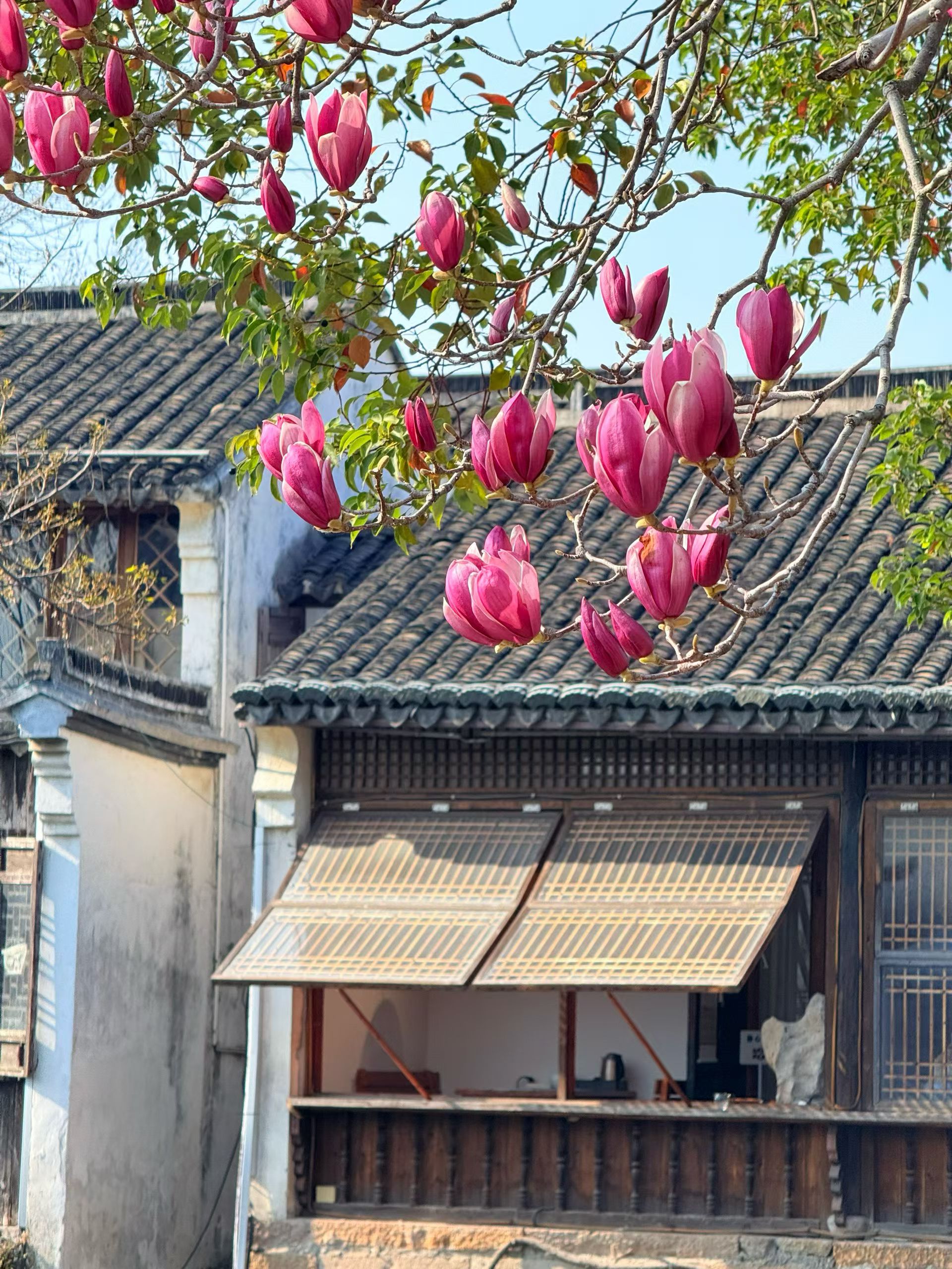 玉兰映青瓦,柳影摇波纹;木府春深,一盏茶里浮沉着江南的静谧时光。