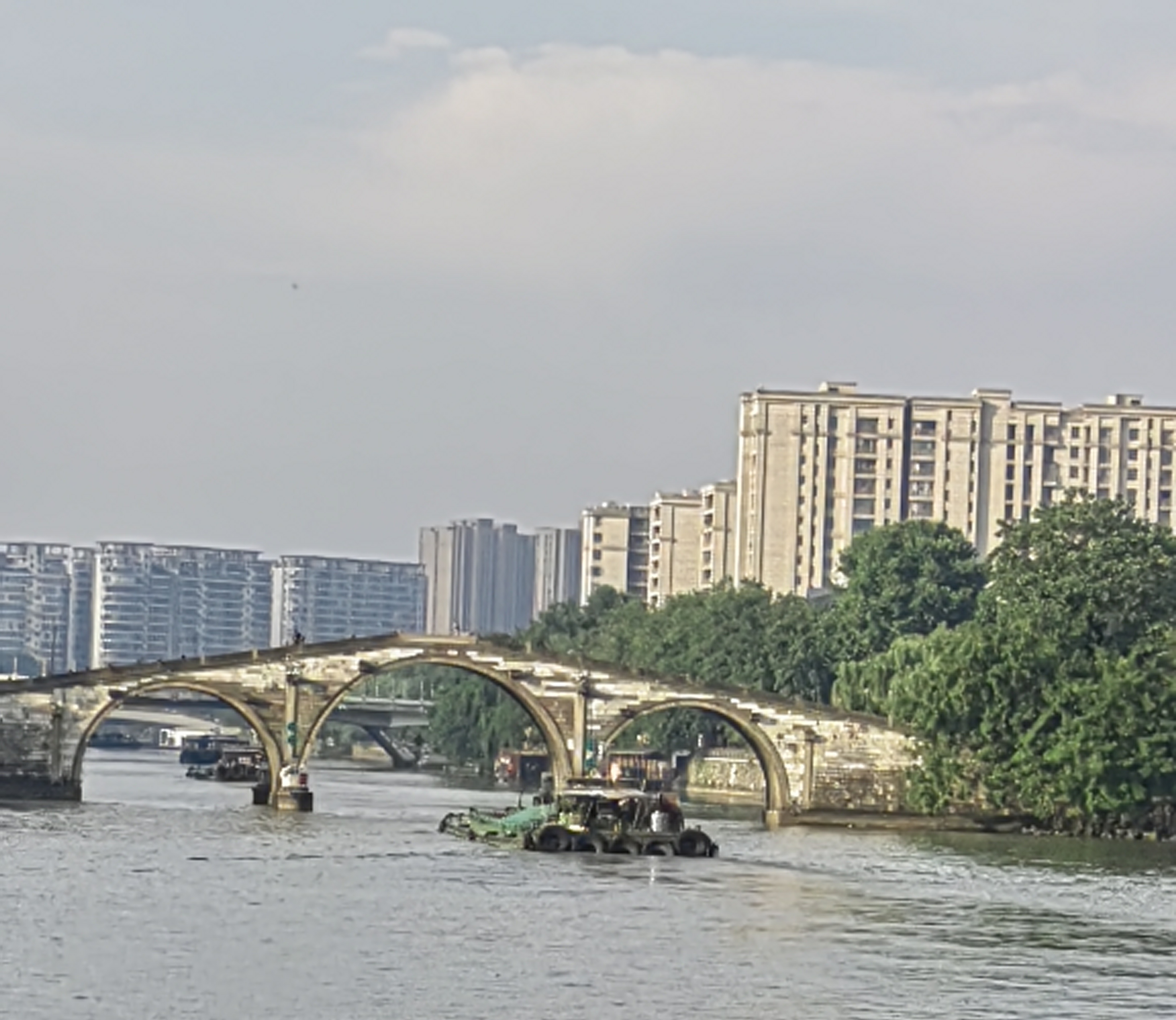 拱宸桥上吹吹风,运河船过,绿树高楼倒映水面,杭州的慢镜头~