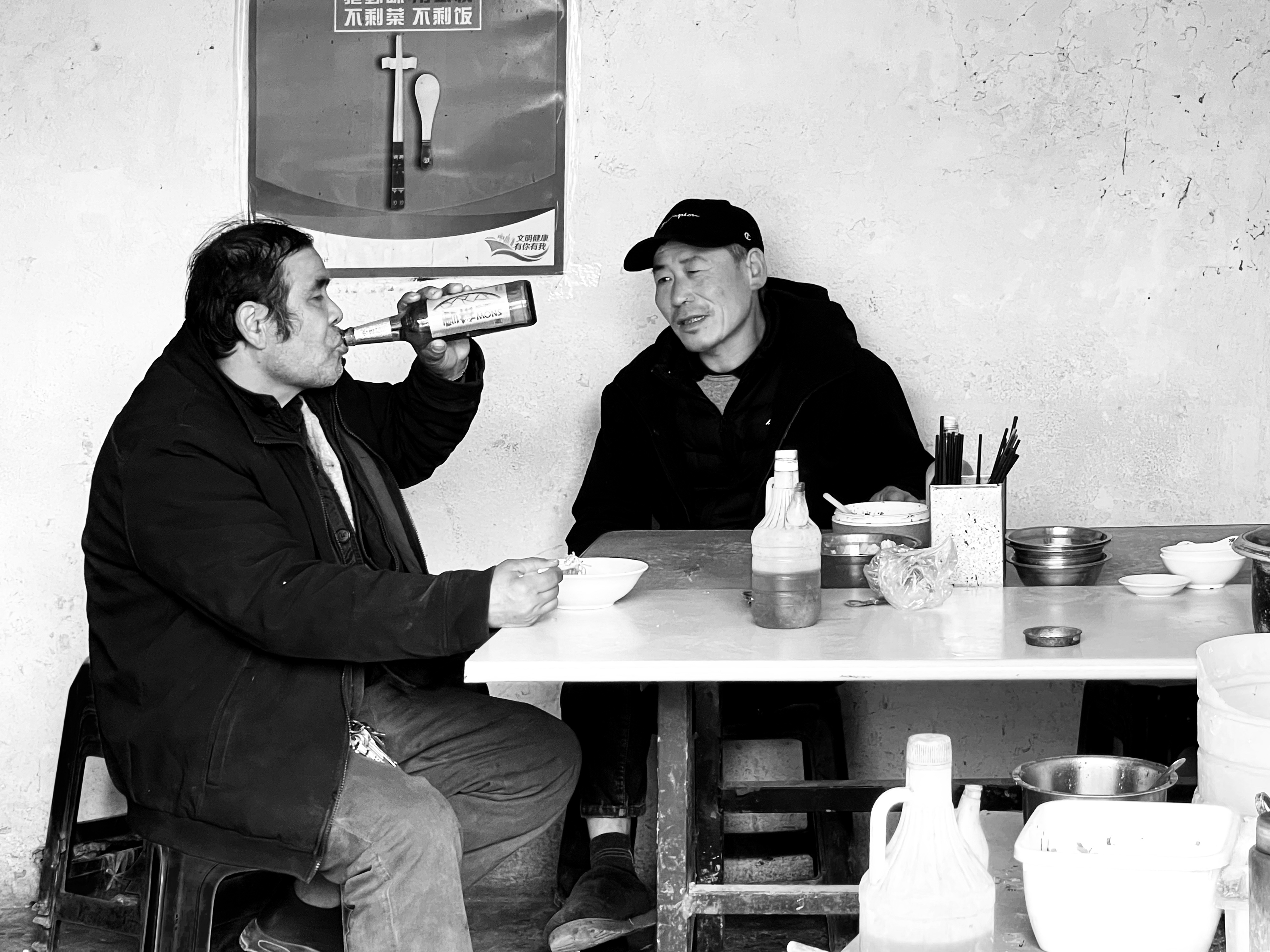 《快门之下,平凡皆珍》王文澜曾言:“每一个摄影记者拍不出好照片是非常正常的,拍好照片才是罕见的。”这句看似平淡的话,道尽了摄影的本质,也道尽了对平凡瞬间的深刻洞察。 这张黑白照片里,两张黝黑的脸庞在简陋的桌台前相对而坐,没有精致的布景,没有刻意的摆拍,只有一瓶对饮的酒、几样简单的餐具,还有墙上“不剩菜 不剩饭”的朴素标语。画面的颗粒感带着岁月的粗糙,却比任何精修的影像都更戳人心。这正是我所追求的——不追求轰轰烈烈的宏大场面,只捕捉生活里最真实的烟火气。 摄影从来不是器材的较量,而是心境的对话。我始终如一,用一台简单的相机,穿梭在胡同巷陌、市井街头,记录着普通人的日常。其实,摄影是个讲年头的事儿,长期积累是吸的过程,偶然得之是呼的体现。按下快门的瞬间,看似偶然,实则是长久观察与内心沉淀的释放。就像我拍的这张照片里的两人,或许是老友久别重逢,或许是工友收工后的小聚,没有惊天动地的故事,却藏着最动人的人间温情。 很多人执着于追求“好照片”,总想拍出与众不同的画面,却忽略了生活本身的力量。而我从不急功近利,愿意慢下来,在街头游荡,在市井驻足,等待那个独一无二的瞬间。我认为,拍不出好照片很正常,因为生活本就是由无数平凡的瞬间组成,能从平凡中提炼出价值,才是摄影的难得之处。就像这张黑白影像,没有鲜艳的色彩,没有复杂的构图,却通过人物的神态、环境的氛围,传递出一种踏实、温暖的生活质感。 作为爱好者的我,始终秉持着对镜头的敬畏。按一次快门就要负一次责任,要珍惜自己的底片,坚定对瞬间语言的信念。我从不轻易拿出不好的照片,认为那是对他人的不尊重;也不过度展示完美的画面,避免强加给观者自己的审美。这种克制与谦逊,让作品多了一份真诚与厚重。 在这个人人都能拿起手机拍照的时代,影像变得泛滥而浮躁。但王文澜的话提醒着我:摄影的核心,从来不是设备的优劣,而是镜头背后的眼睛与心。不必焦虑拍不出“好照片”,因为每一个平凡的瞬间都值得被记录,每一次用心的拍摄都是对生活的致敬。 就像这张对饮的黑白照片,没有华丽的技巧,却定格了人与人之间最纯粹的情谊,藏着生活最本真的模样。这,或许就是正如王文澜所说的,我眼中最珍贵的好照片——源于生活,归于真实,在平凡中见深情,在瞬间里留永恒。