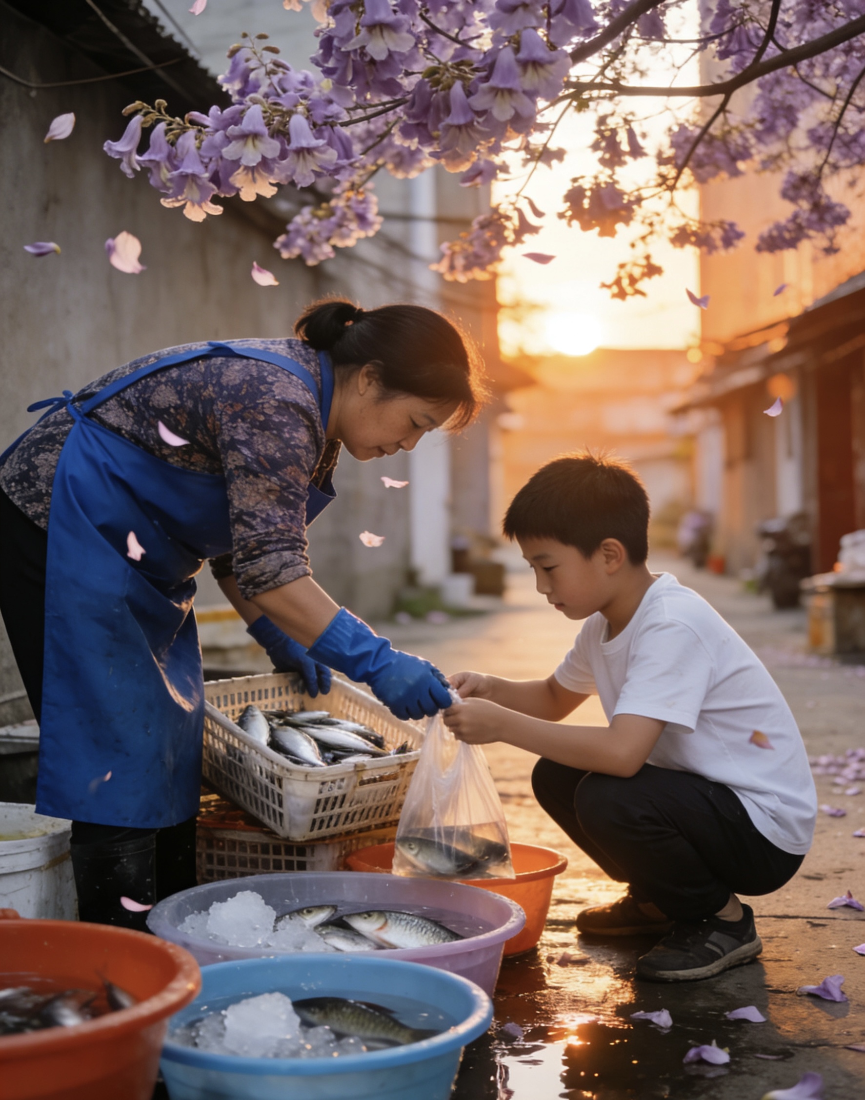 春日的第二次相遇 (故事经过艺术加工和模糊化处理,部分图片为AI制作~) 早起时忽然想换个方向走走。 一周了,每天都是那条老路——巷口、菜市场、河边、拆迁地。风景是好风景,可春天这么大,总该有些没去过的地方。 于是往东走,穿过三条街,拐进一条从没进过的巷子。 巷子很窄,两边是那种老式的平房,墙皮斑驳,瓦片上长着瓦松。一扇木门虚掩着,门缝里探出一枝杏花,粉白粉白的,缀着露水,像刚哭过的少女的脸。我站在门口看了好一会儿,想敲门问问能不能进去拍张照,又怕打扰了人家的清梦。 正犹豫着,门“吱呀”一声开了。一个老太太端着一盆水出来,看见我,愣了一下,随即笑了:“看花呢?” 我不好意思地点点头。她把水泼在门口,说:“进来看看吧,今天开得正好。” 小院里是一棵老杏树,比房子还高,花开得密密匝匝的,把半个院子都遮住了。树下摆着一张竹躺椅,一个老头躺在上面,闭着眼,收音机里放着京剧。老太太说:“他呀,天天躺这儿听戏,听了几十年了。杏花开的时候,戏也不听了,就看着花发呆。” 我站在树下,花瓣时不时飘下来,落在肩上、头发上。有一朵落进我的衣领里,凉丝丝的,像一个小小的亲吻。 老太太进屋端了杯茶出来,递给我:“自家采的,去年春天晒的杏花茶,尝尝。” 茶是淡黄色的,有一股若有若无的香,喝下去,舌尖微微的甜。我端着茶杯,忽然想,这一周我写了那么多春日的事,可真正的春天,原来是这样的——是一杯杏花茶,是一个陌生人的善意,是一树花开在谁也看不见的院子里,安静地灿烂着。 从巷子出来,继续往东走,竟走到了一个从没注意过的小公园。 说是公园,其实只是一片空地,几棵老树,几条石凳。可这会儿,空地上全是人——打太极的老人,跳绳的孩子,遛狗的年轻人,推着婴儿车的母亲。阳光从树叶缝隙里漏下来,洒在他们身上,斑斑驳驳的,像一幅印象派的画。 有个男孩在放风筝。风筝是一只大蜈蚣,红红绿绿的,尾巴拖得老长。他跑几步,放线,跑几步,放线,风筝摇摇晃晃地升上去,又摇摇晃晃地落下来。反复了十几次,终于飞稳了,稳稳地停在半空,在春风里一扭一扭的。 男孩的妈妈在旁边鼓掌,男孩自己却收了线,把风筝拽下来。 “怎么不放了?”我问。 他回头看我一眼,认真地说:“它飞得太高了,我看不清它的脸。” 我愣了一下,然后笑了。孩子的道理,大人总是听不懂——风筝不是非要飞到最高,而是要飞在自己看得见的地方。 公园角落里有棵歪脖子柳树,枝条垂到地上,绿得发亮。柳树下蹲着一只黑猫,一动不动地盯着池塘里的鱼。鱼游过来,它伸出爪子捞,捞了个空,也不急,继续蹲着等。 旁边石凳上坐着一个画画的女孩,拿着铅笔在本子上画那棵柳树。我悄悄凑过去看,她画得真好,每一根枝条都在风里微微弯曲,每一片叶子都透着光。 她察觉到我在看,抬起头,冲我笑了笑。我指指她的本子:“画得真好。”她摇摇头:“不行,画不出真的那种软。柳树的软,是画不出来的。” 我想了想,好像真是这样。有些东西,只能看,只能感觉,画不出,也写不出。 傍晚回家,又经过那条窄巷。杏花还在,门还虚掩着,收音机里的京剧还在咿咿呀呀地唱。我在门口站了一会儿,没再进去。有些美好,遇见过一次就够了,再去,反倒贪心了。 回到自家巷口,那棵泡桐树下没人。今天那位老太太大概已经看过花了,回家做饭去了。树上花还开着,开得更盛了,紫薇薇的一片,在夕阳里像一团燃烧的雾。 卖鱼的女人今天出摊了。她坐在那儿,系着那条蓝布围裙,手伸进水里捞鱼。旁边站着她儿子,在帮着招呼客人。有个大妈问:“这是你儿子啊?真俊,多大了?”她笑着答:“十九了,上大学了,周末回来帮我。” 她的眼睛亮亮的,比盆里的水还亮。 我忽然想,这一周,我遇见了很多人,很多事。有些是第一次见,有些是第二次见。可无论第几次,每次遇见都是新的——因为春天在变,人也在变,就连同一棵树上的同一朵花,今天和昨天,也是不一样的。 回到家,翻开笔记本,把今天的日期写上。想了想,又添了一行: “遇见一树杏花,喝了一杯杏花茶。看见一个男孩把风筝拽下来,因为看不清它的脸。柳树的软,画不出来。黑猫还在等那条鱼。” 窗外传来笛声。还是那个邻居,还是那首《茉莉花》。这回吹得熟极了,不仅顺溜,还加了些花哨的装饰音,听得人心里痒痒的。 我趴在窗台上听,忽然笑了。一周前,他还是个断断续续的生手,现在已经是个能加花的老手了。春天里,原来每个人都在悄悄地进步着,连吹笛子的人也不例外。 春日打卡计划第二周的第一天,就这么过去了。 明天,该往哪个方向走呢?