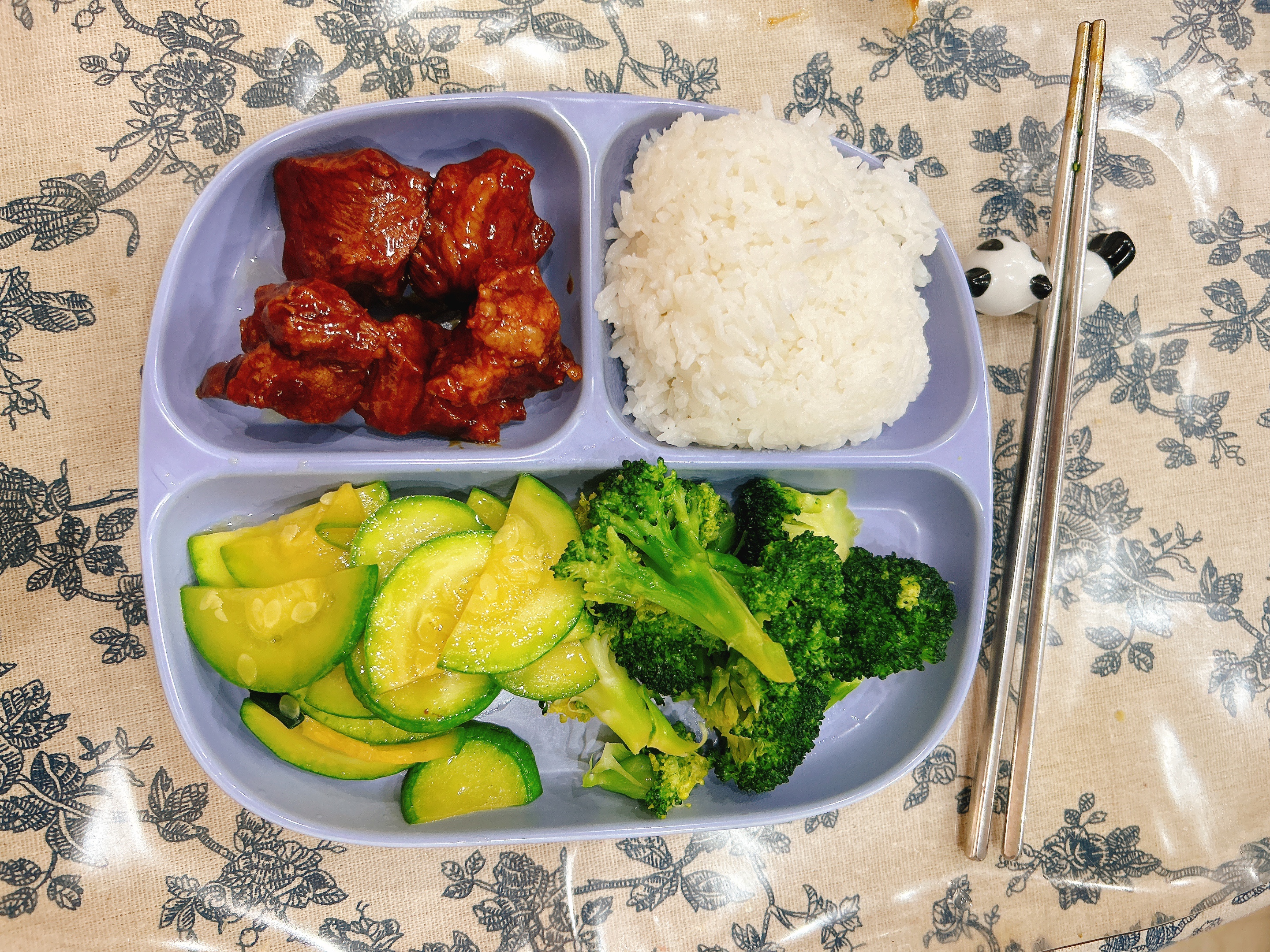 小学生午餐: 碳水白米饭 蛋白质:红烧肉 维生素:葫芦瓜&西兰花🥦