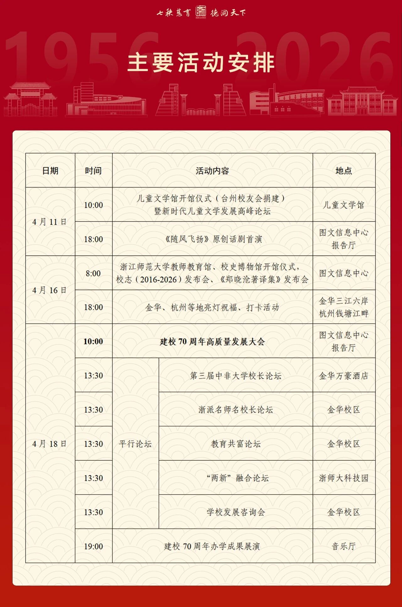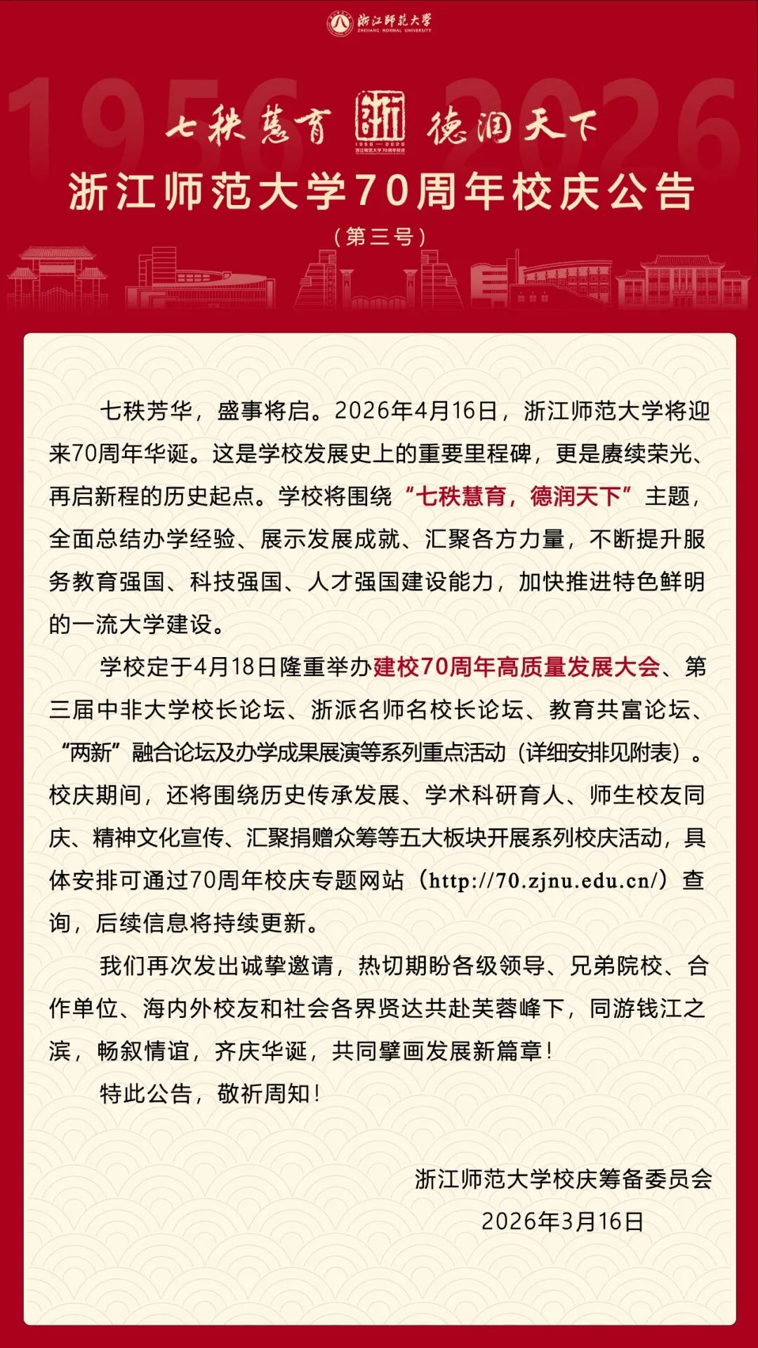 浙江师范大学70周年校庆公告(第三号),今日发布!诚邀全球校友共赴芙蓉峰下,同游钱江之滨,畅叙情谊,齐庆华诞!