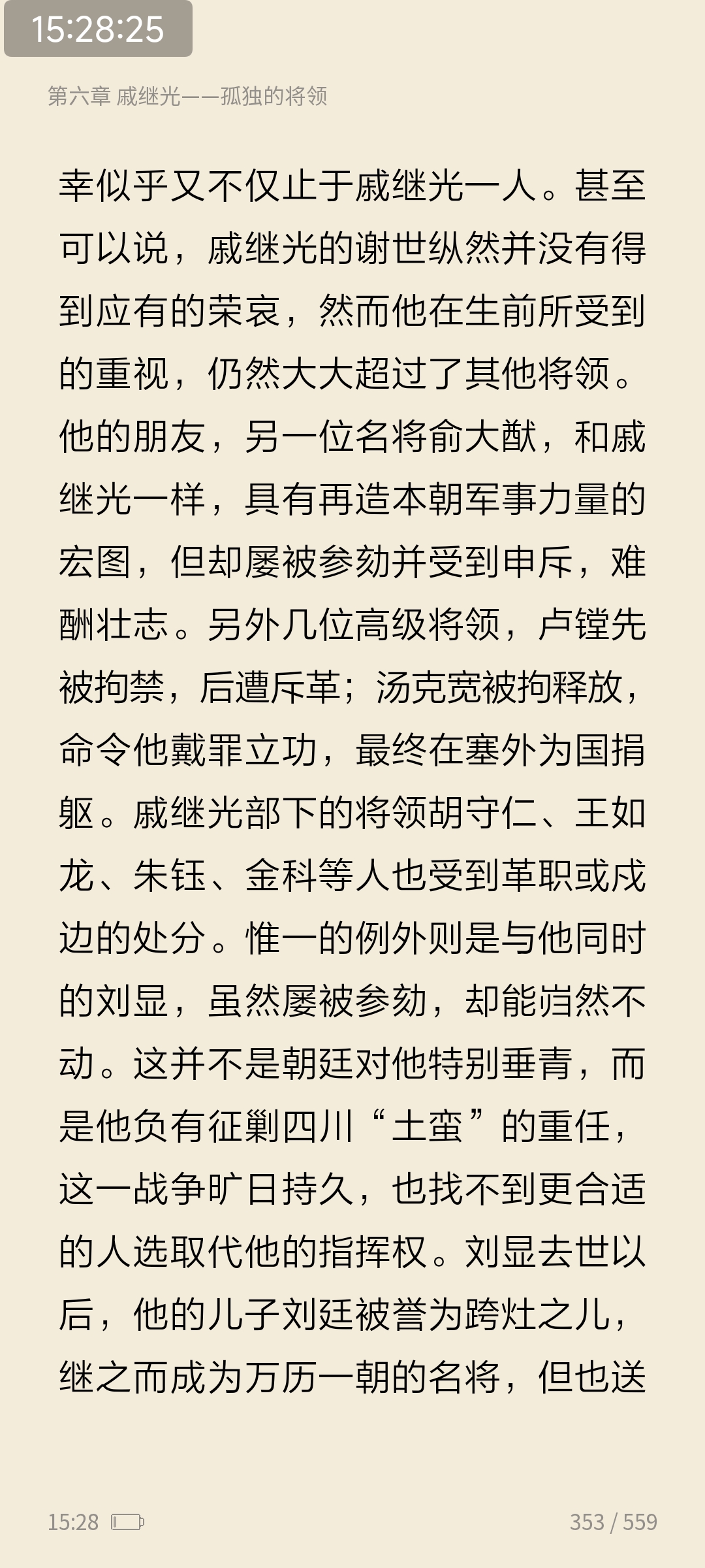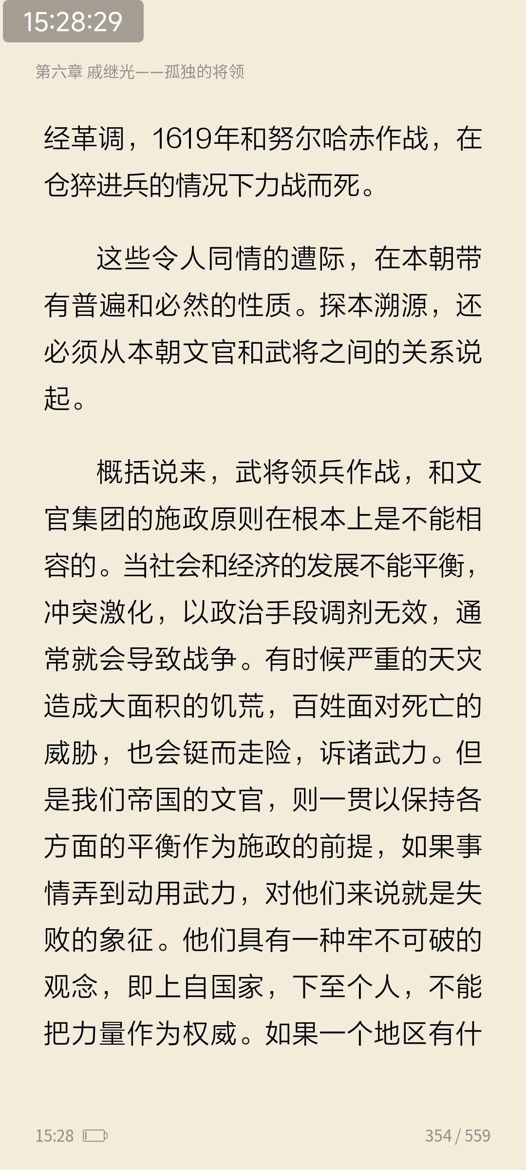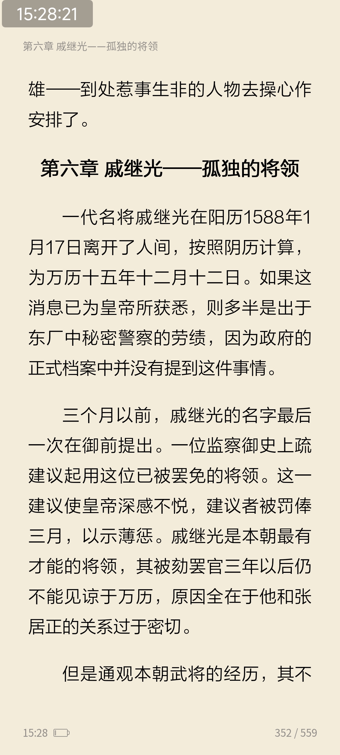 今日续读《万历十五年》第六章戚继光-孤独的将领。--戚继光是否是一个超自然的崇拜者?从某些方面来说,他和很多同时代的人物一样,确实有这样的倾向。但是在有些时候,超自然的信仰却只是一种治军的手段。--戚继光的不幸遭遇是因为他在一镇中推行的整套措施业已在事实上打破了文官集团所力图保持的平衡。既然如此,他就必须付出代价。