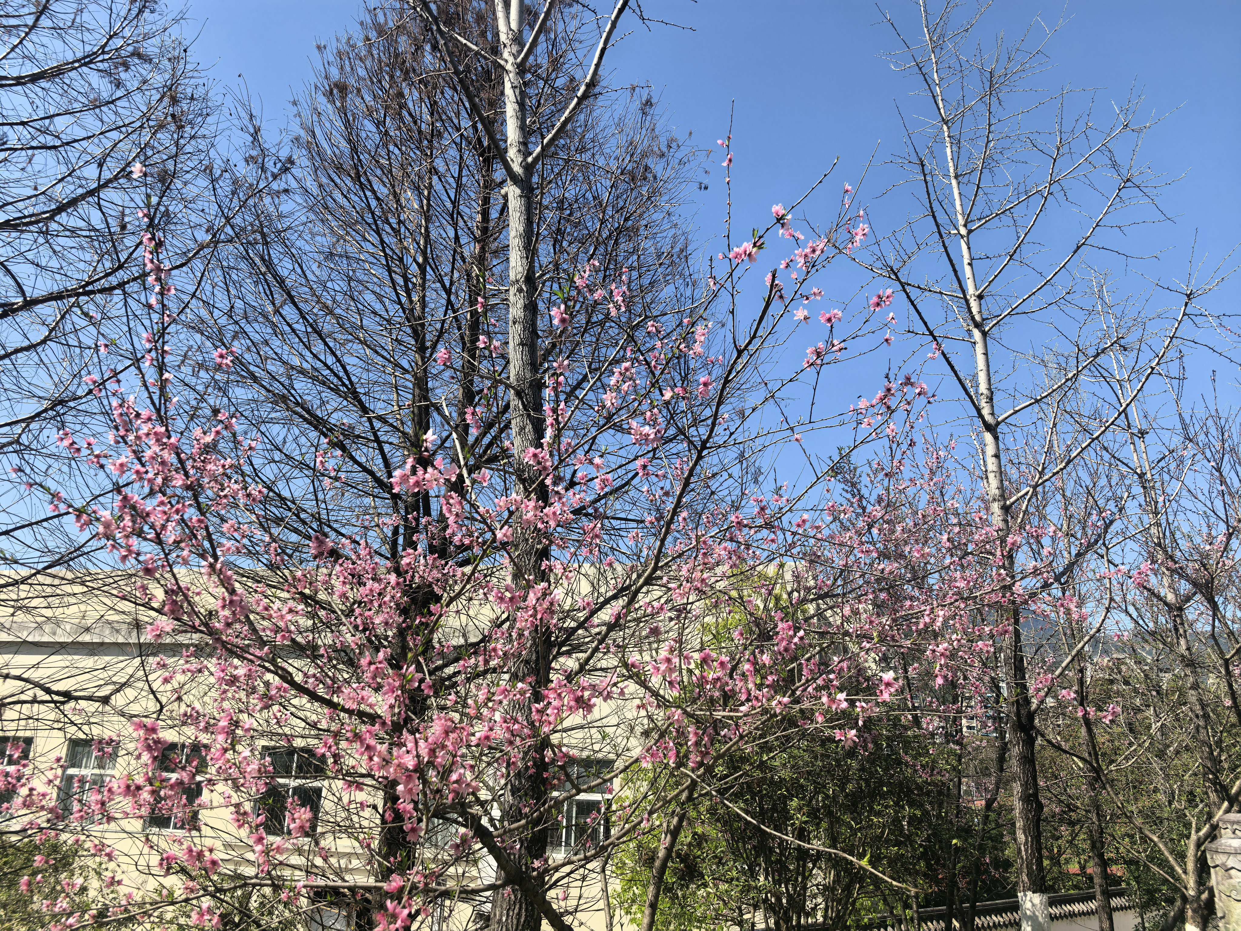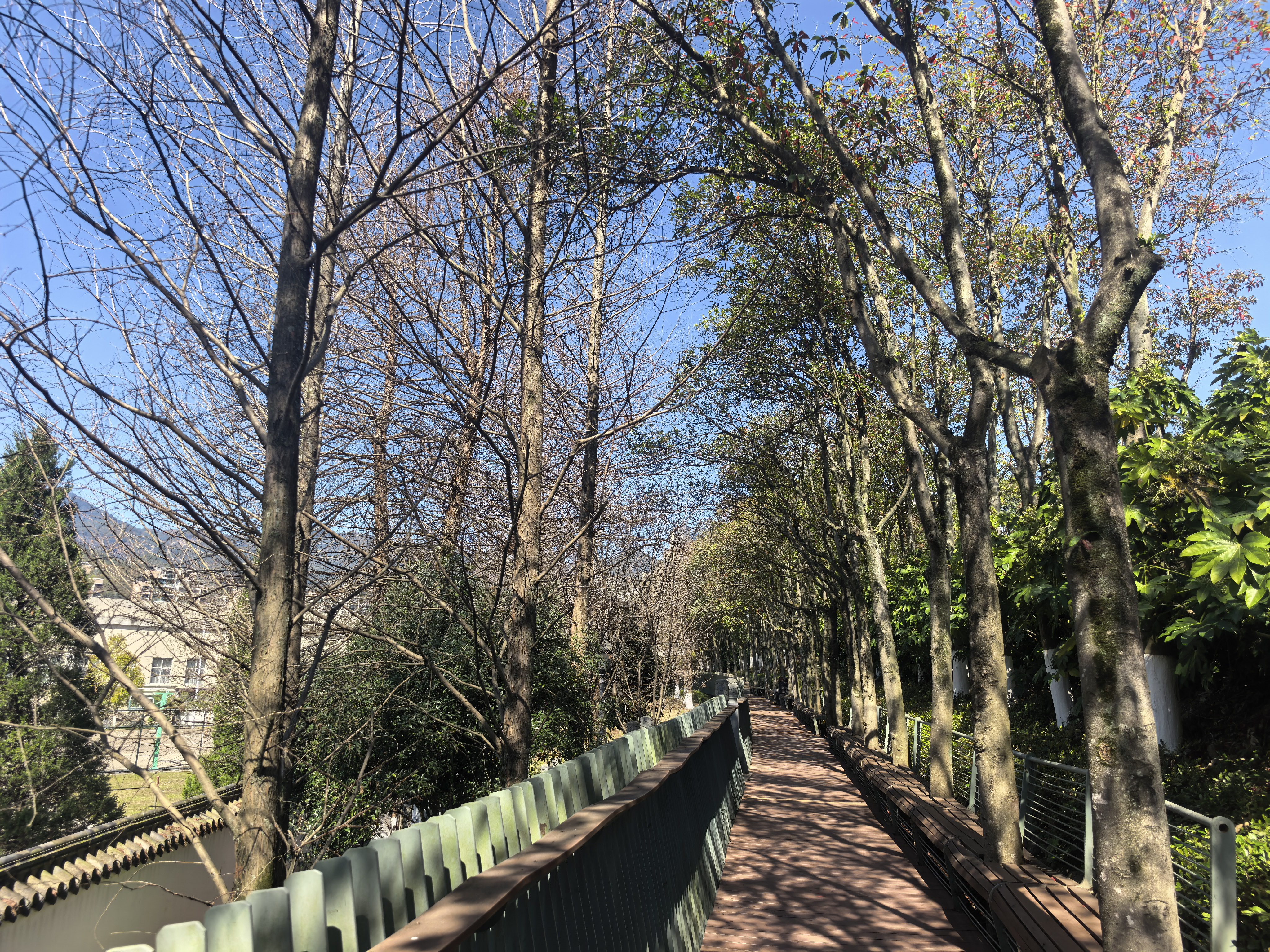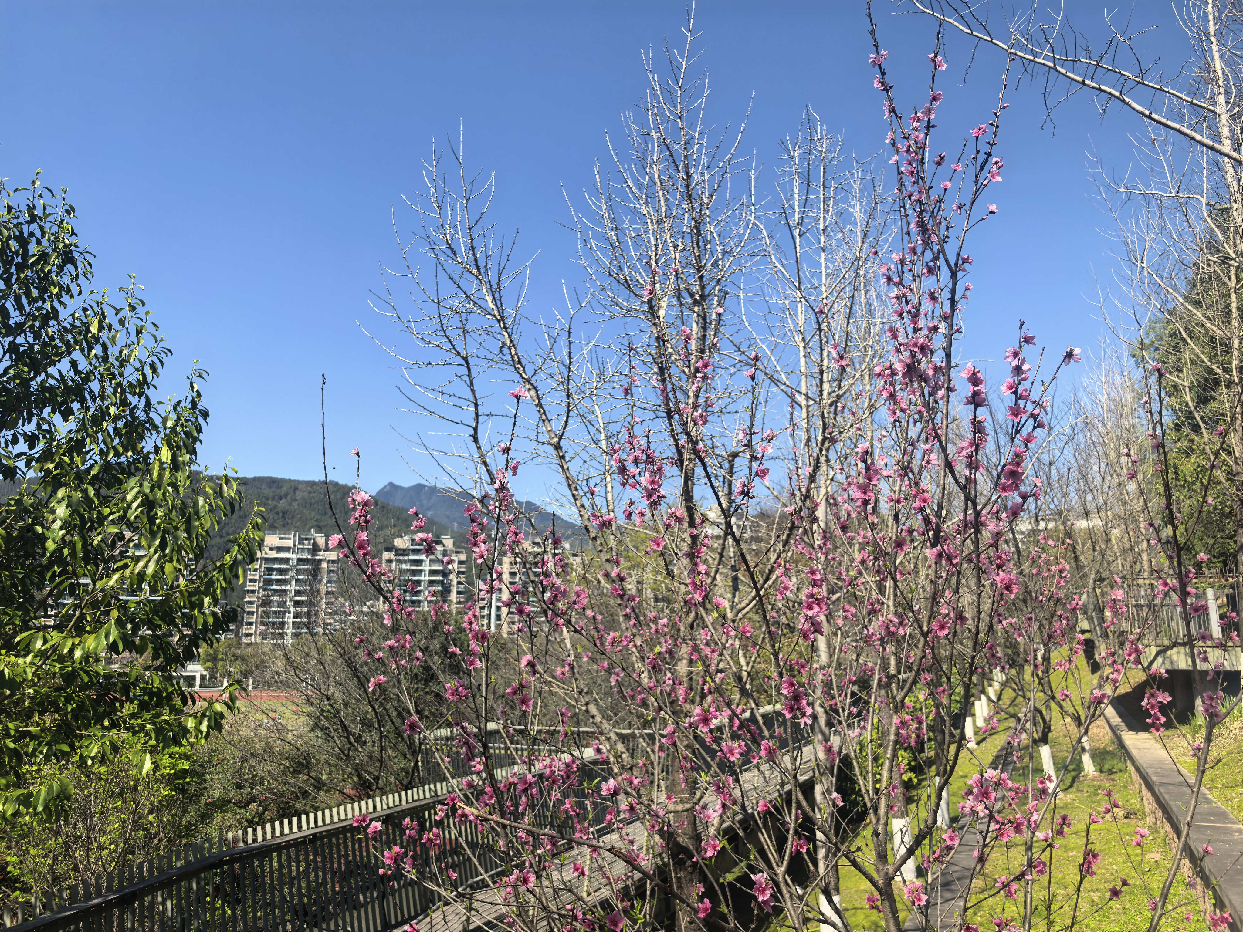 桃花樱花紫荆齐绽放,粉嫩花海配蓝天,木步道上光影斑驳,美得像打翻调色盘~