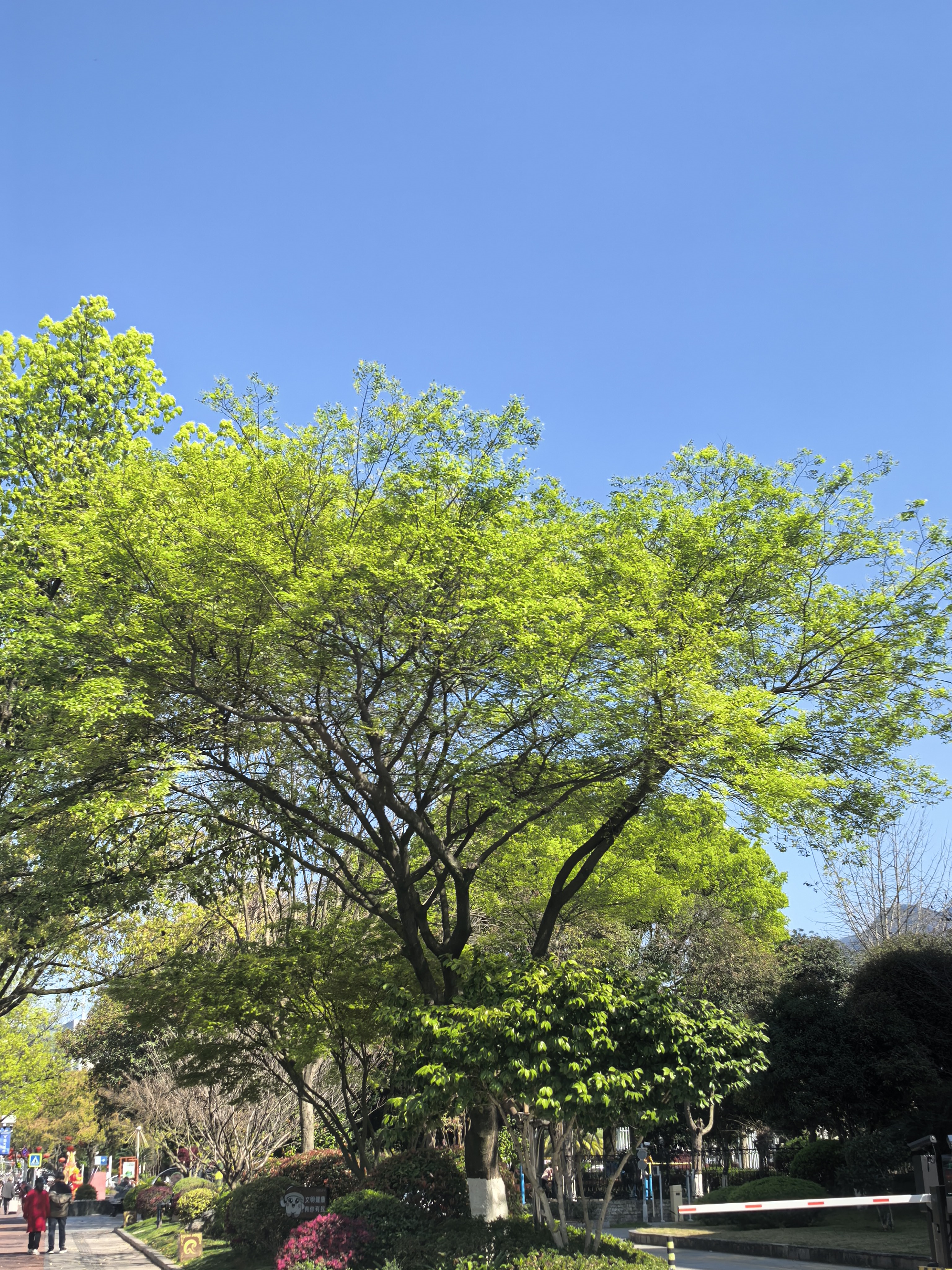 春日公园随手拍,绿荫蓝天配红花,白栏杆旁慢悠悠~