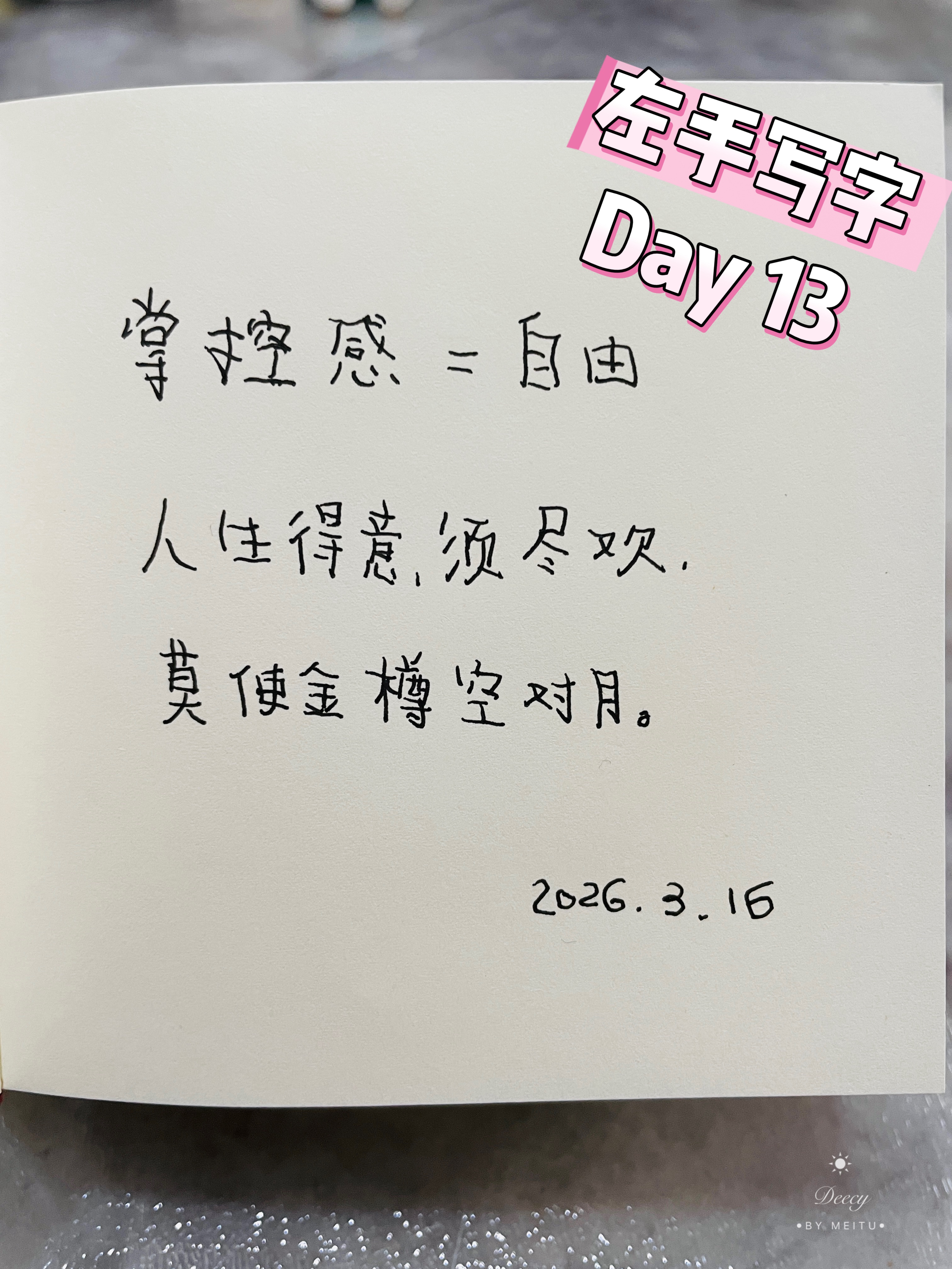 ✍️左手写字打卡第13天 对时间的把握,对人际关系的掌控,对自我的约束,这些掌控好了才会有真正的自由啊。