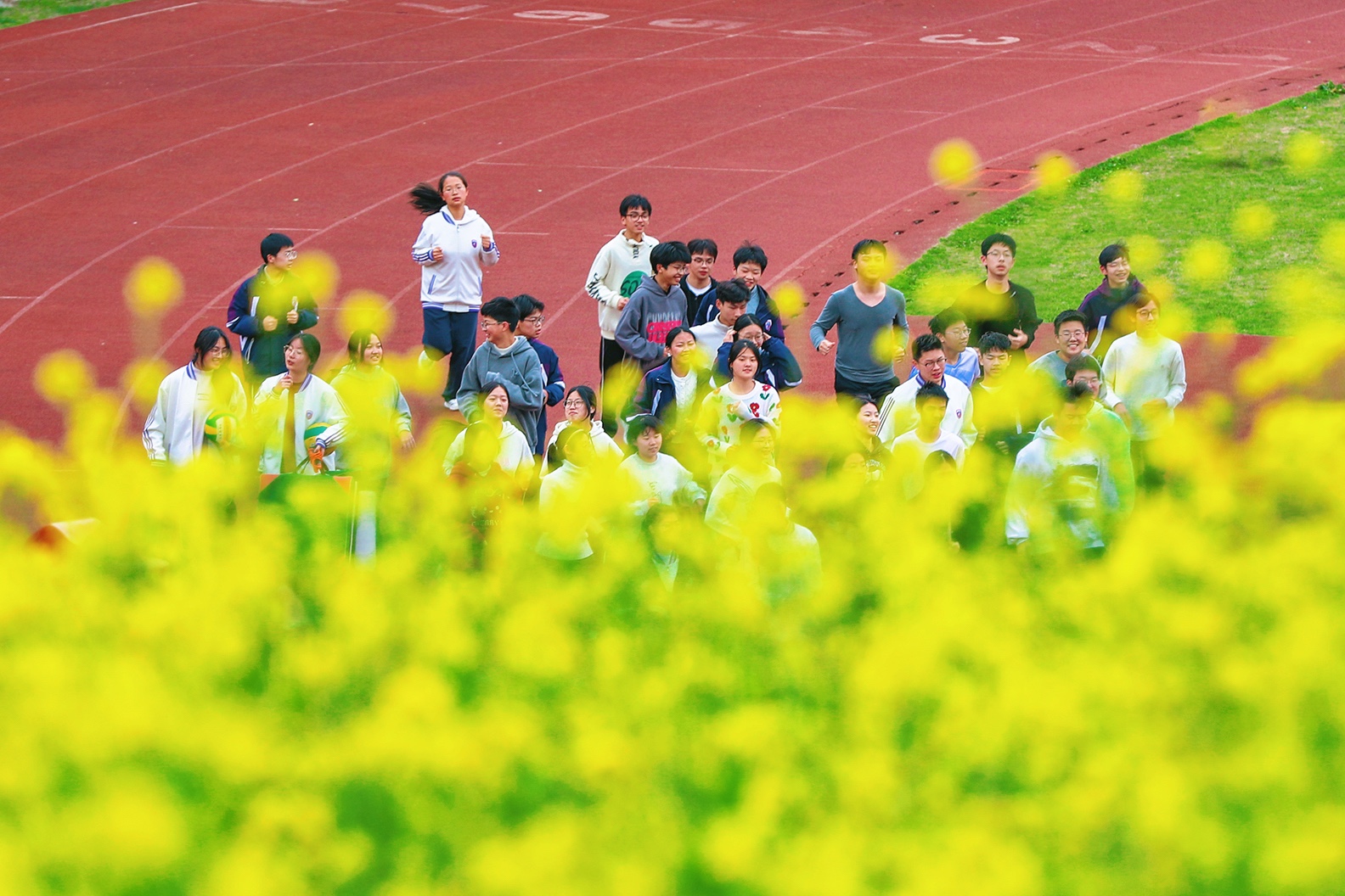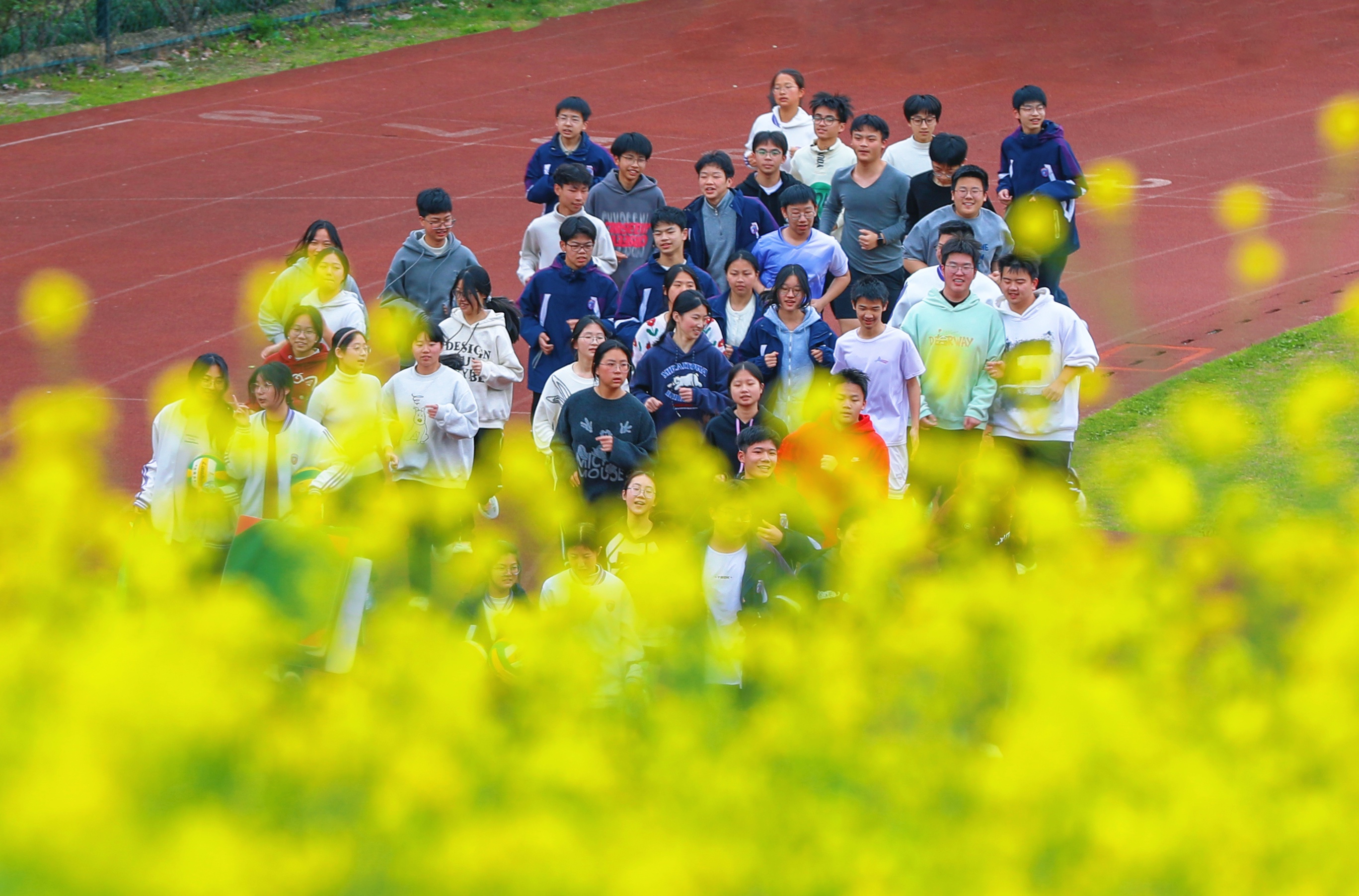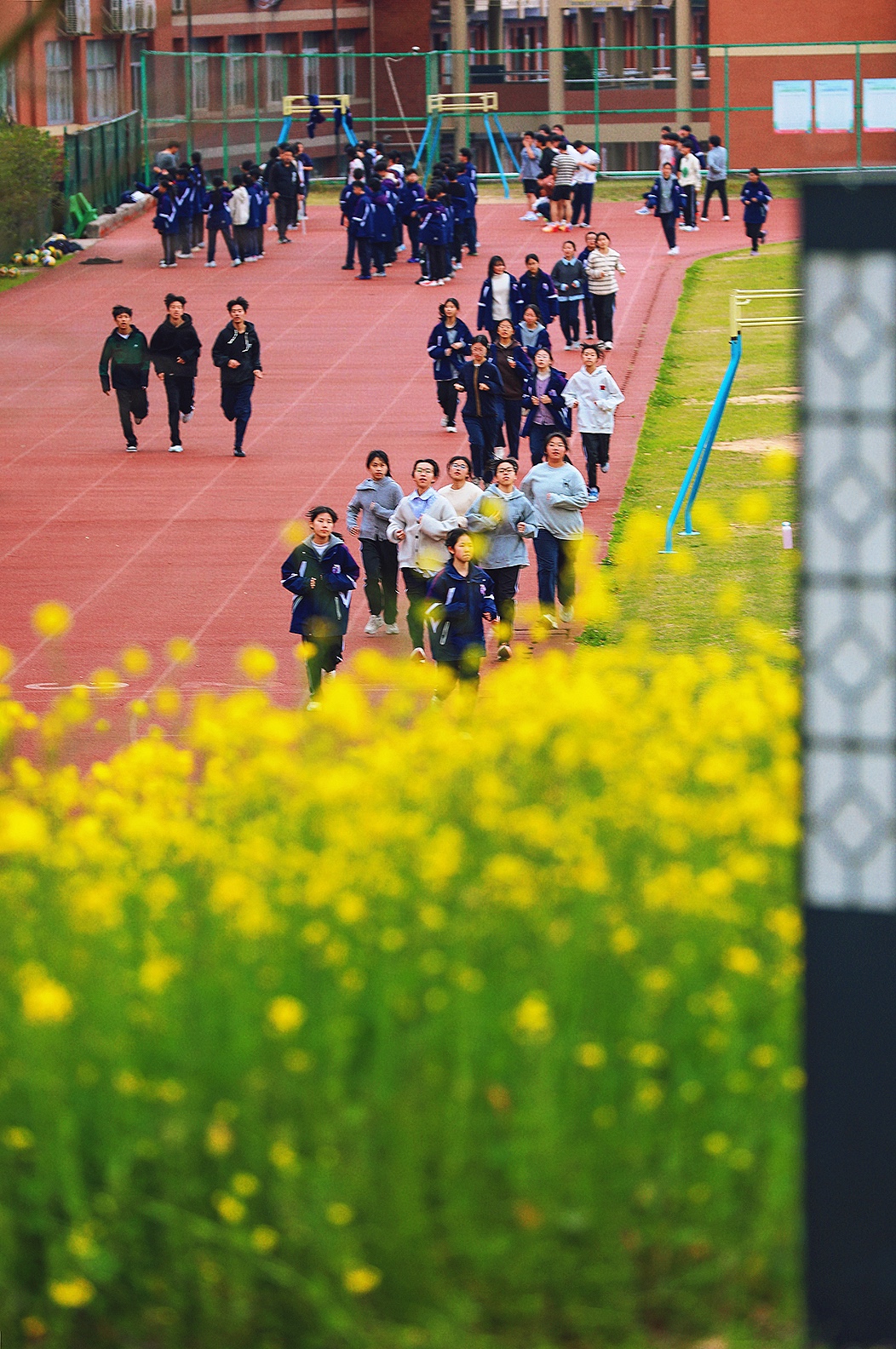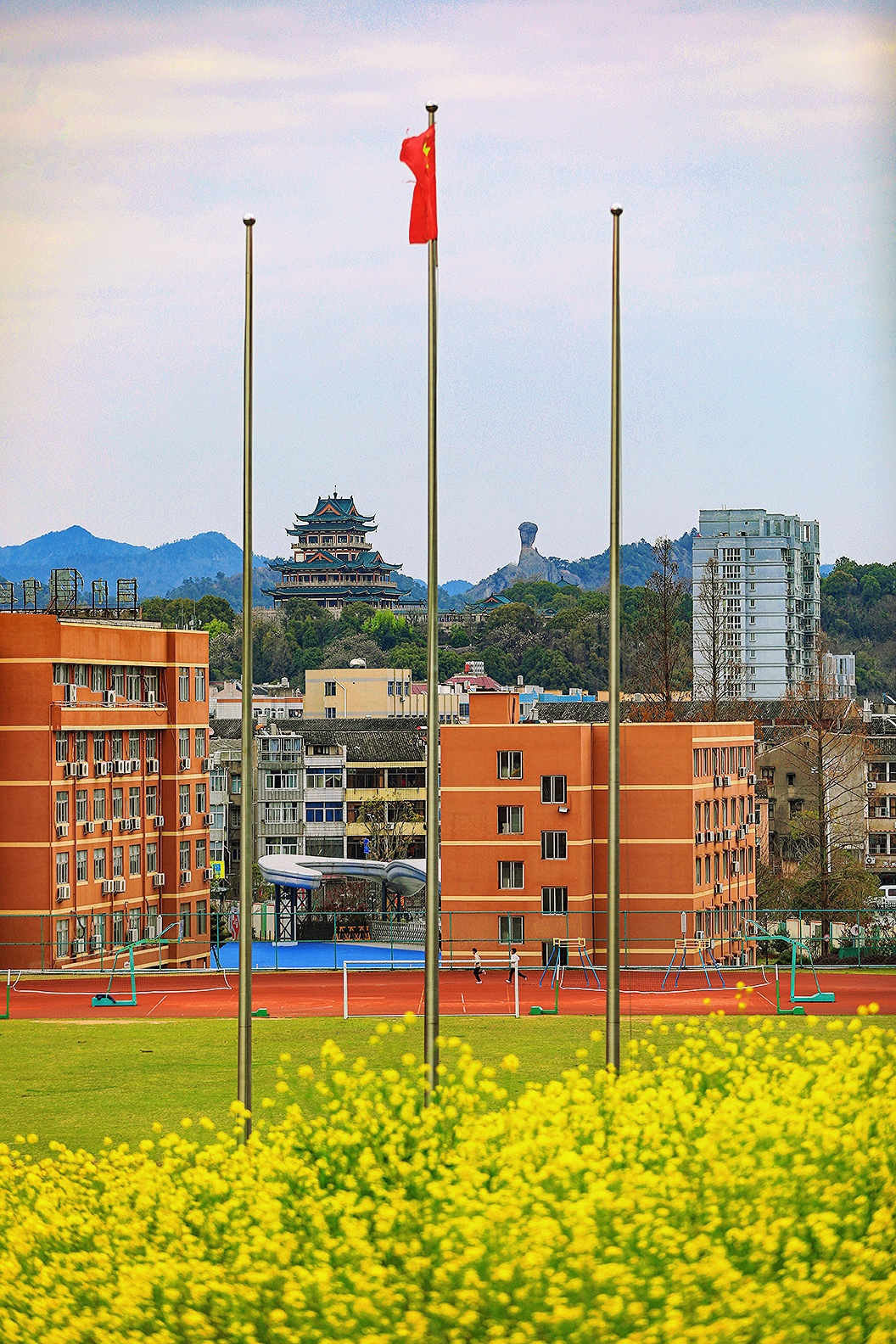 校园的春天。于温岭中学实验初中。 风掠过操场的红跑道,把国旗的一角轻轻扬起,金黄的花田在脚下铺展,像把整个春天都揉碎成了星子。 远处的东辉阁飞檐翘角,与那石夫人遥遥相望,山的轮廓在云里晕开,把城市的烟火与自然的灵秀,都织进了这一方晴空里。 教学楼的橙红是暖的,花田的明黄是亮的,旗杆的银灰是静的,远山的青黛是柔的。 春日的光不偏不倚,落在每一寸土地上,让读书声与风声、花香与山影,都成了这座城最温柔的注脚。
