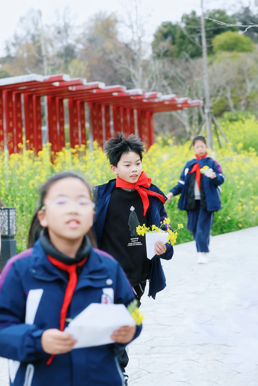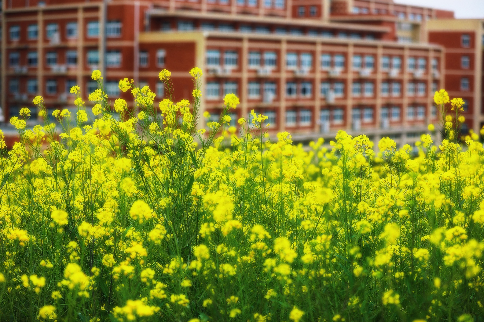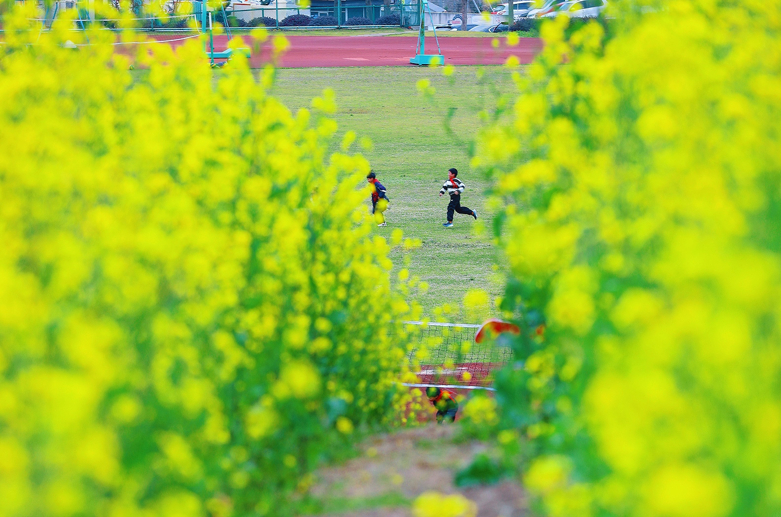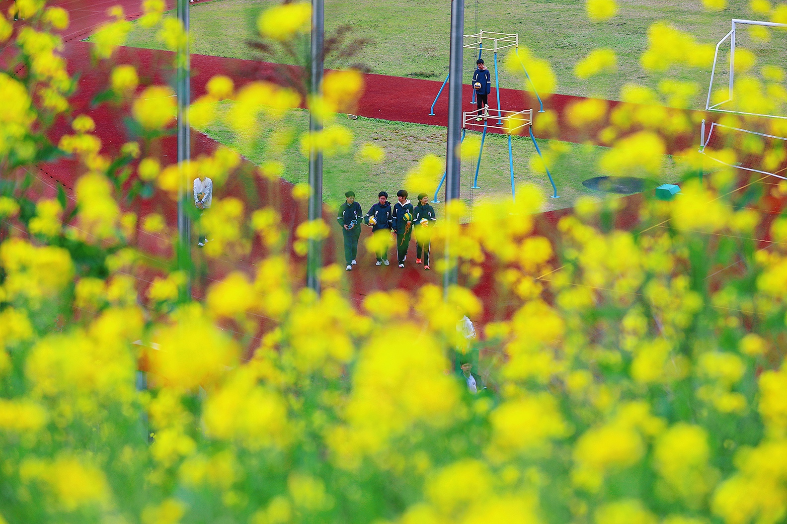 校园的春天。于温岭中学实验初中。 风掠过操场的红跑道,把国旗的一角轻轻扬起,金黄的花田在脚下铺展,像把整个春天都揉碎成了星子。 远处的东辉阁飞檐翘角,与那石夫人遥遥相望,山的轮廓在云里晕开,把城市的烟火与自然的灵秀,都织进了这一方晴空里。 教学楼的橙红是暖的,花田的明黄是亮的,旗杆的银灰是静的,远山的青黛是柔的。 春日的光不偏不倚,落在每一寸土地上,让读书声与风声、花香与山影,都成了这座城最温柔的注脚。