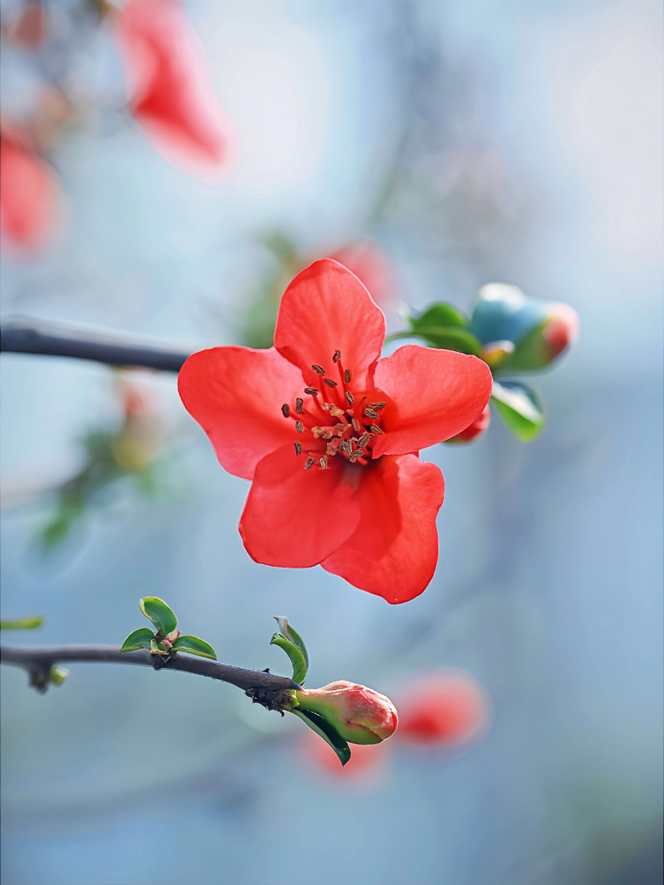 春日海棠上线!红艳艳的花朵在蓝天底下开得正欢,花蕊嫩黄、绿叶衬托,还有羞答答的花苞躲在枝条间~随手一拍就是浅景深大片,连风都温柔了三分。这波春日限定浪漫,不打卡真的亏大啦~