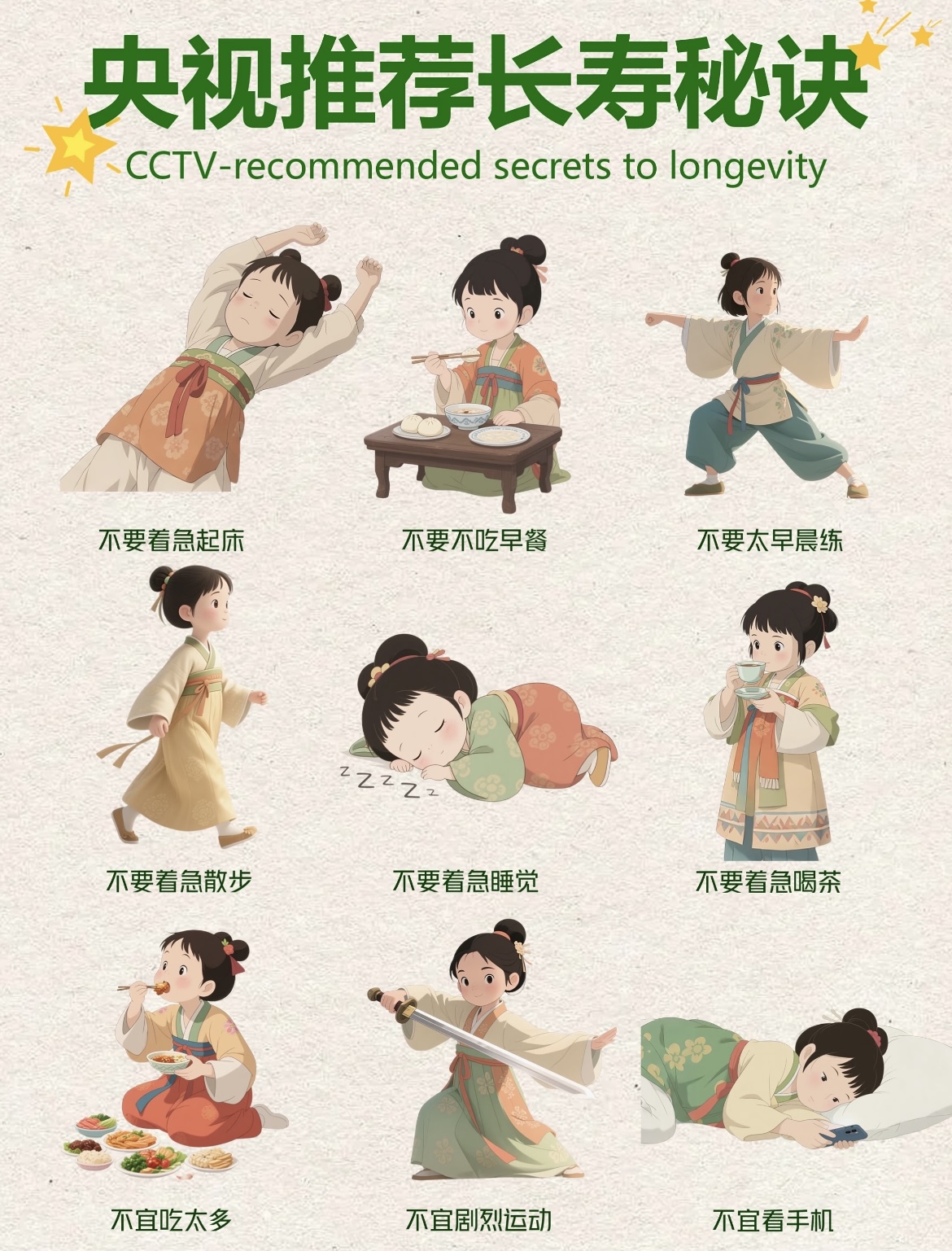 央视推荐长寿的9个秘诀,轻养生小窍门 #当我真正开始爱自己 【清晨三不卷】 1️⃣ 赖床无罪! 醒来先别猛起,闭眼深呼吸5分钟,让血压慢慢醒过来,预防头晕眼花!这叫“温柔开机”。 2️⃣ 早餐必须吃! 不吃早餐=不让手机充电就出门,一上午低电量模式,还会暴食变胖!答应我,吃它! 3️⃣ 别抢树的空气! 太早晨练吸的都是二氧化碳,等太阳出来再运动,氧气更足,效果翻倍! 【饭后三不躺】 1️⃣ 拒绝饭后暴走! 血液正全力消化呢,你散步就是和肠胃抢能量,会腹胀!乖乖瘫20分钟再说~ 2️⃣ 别立马睡觉! 吃饱就躺=强制肠胃加班,反流烧心还长肉!猪猪女孩也不是这么当的! 3️⃣ 茶晚点喝! 茶会绑走食物营养,等于白吃了!等半小时再喝,吸收满分! 【睡前三不嗨】 1️⃣ 宵夜达咩! 深夜放毒,肠胃连夜罢工!又胖又睡不好 2️⃣ 睡前别运动! 晚上跳操等于喝奶茶,越动越嗨根本睡不着! 3️⃣ 刷手机是睡眠杀手! 蓝光会影响褪黑素,睡不着还垮脸!赶紧放下! #春季养生# #健康#