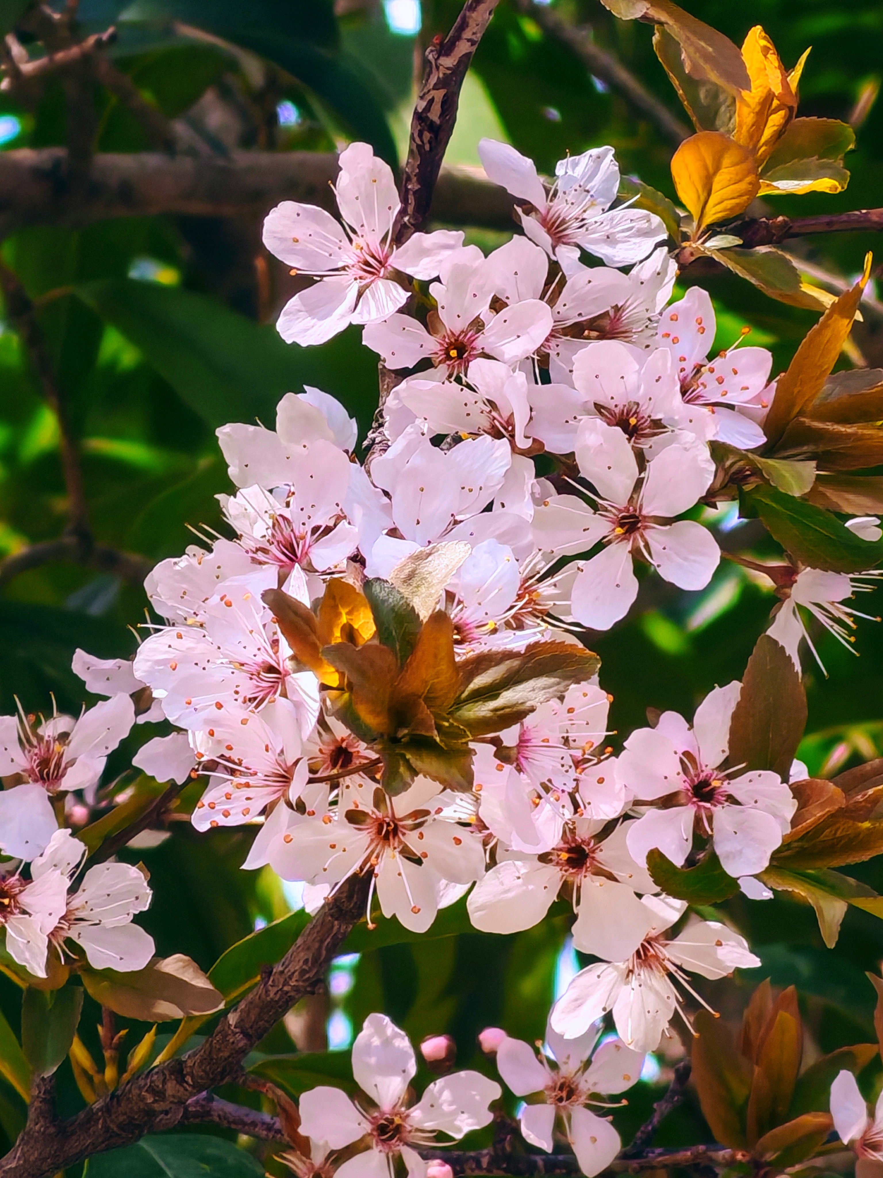 这簇紫叶李在春日暖阳里开得热烈又温柔,粉白花瓣簇拥着嫩黄新叶,满是生机。