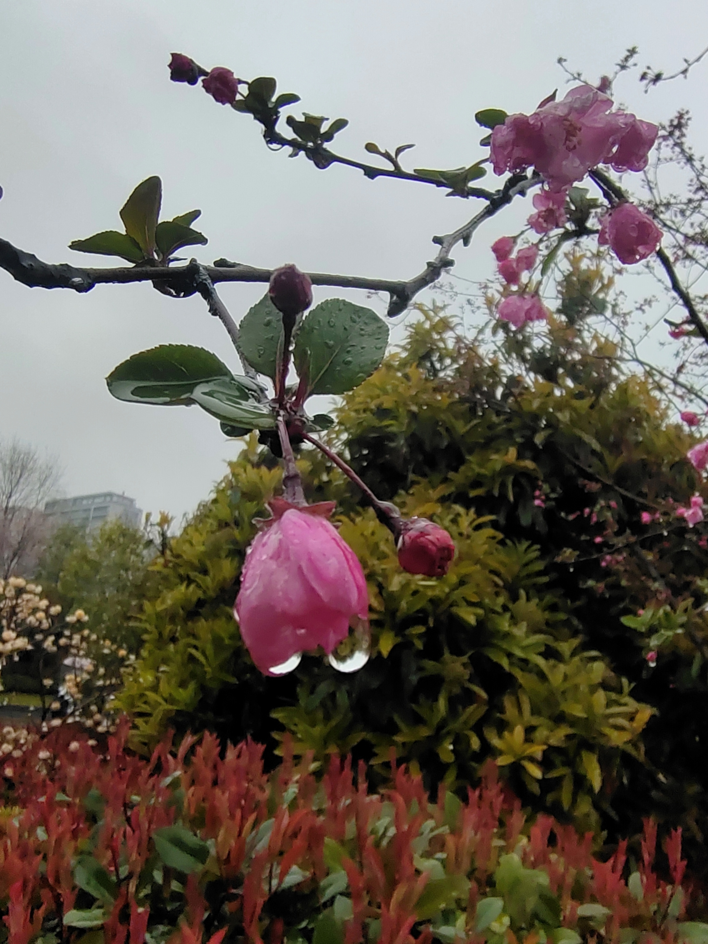 阴天的植物园,雨滴悬在海棠尖,绿叶托着绯红灌木,枝条垂落处,倒挂的花与城市轮廓静默相望。