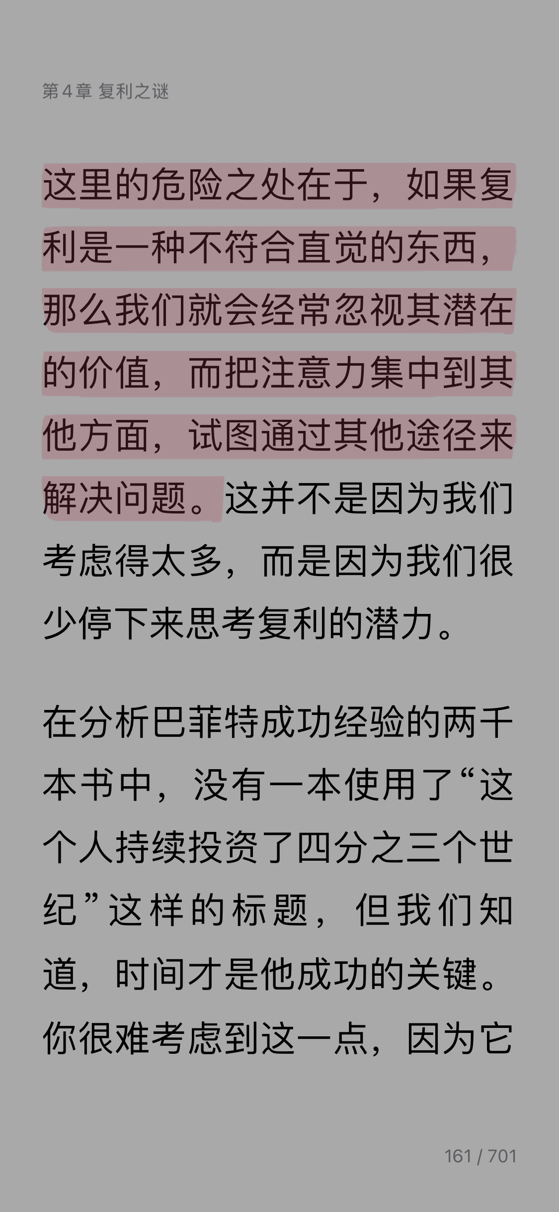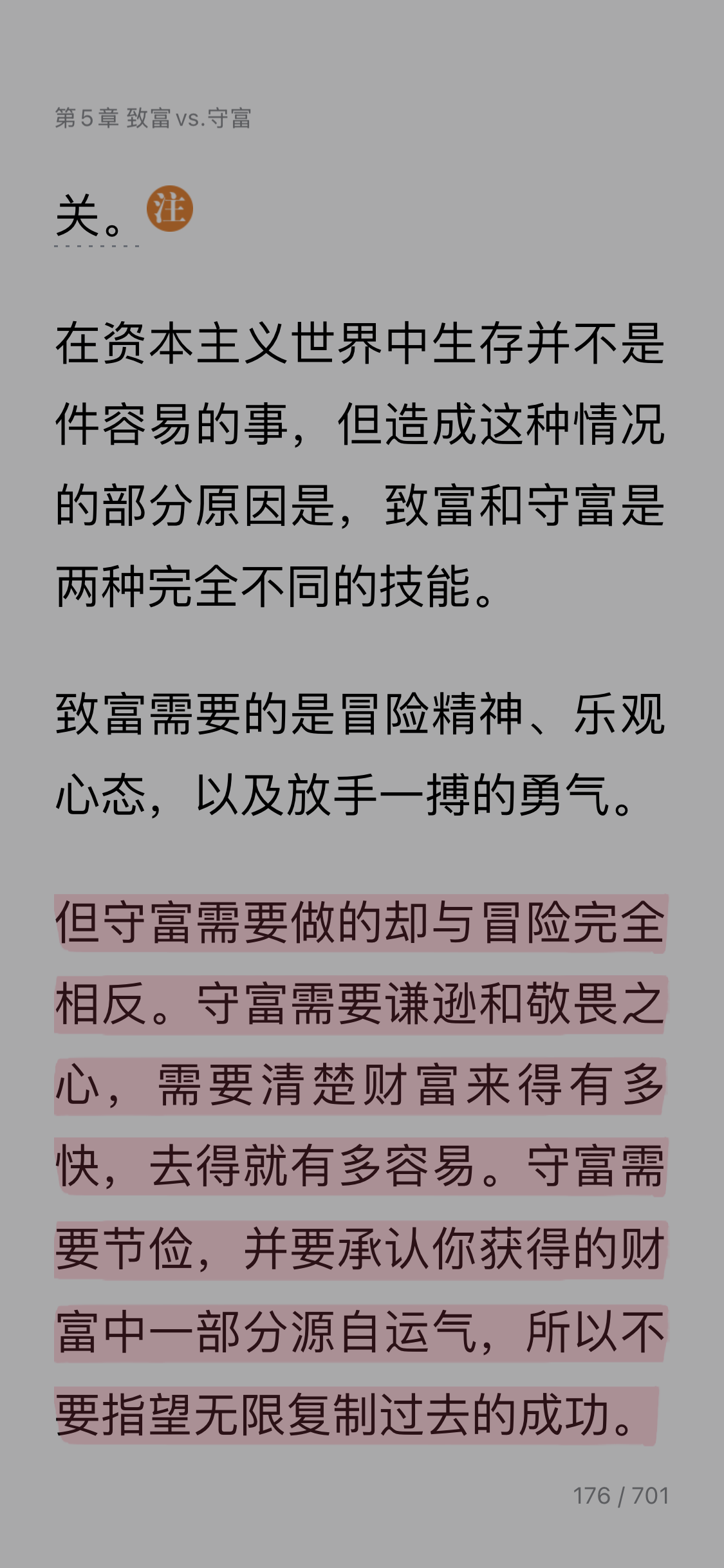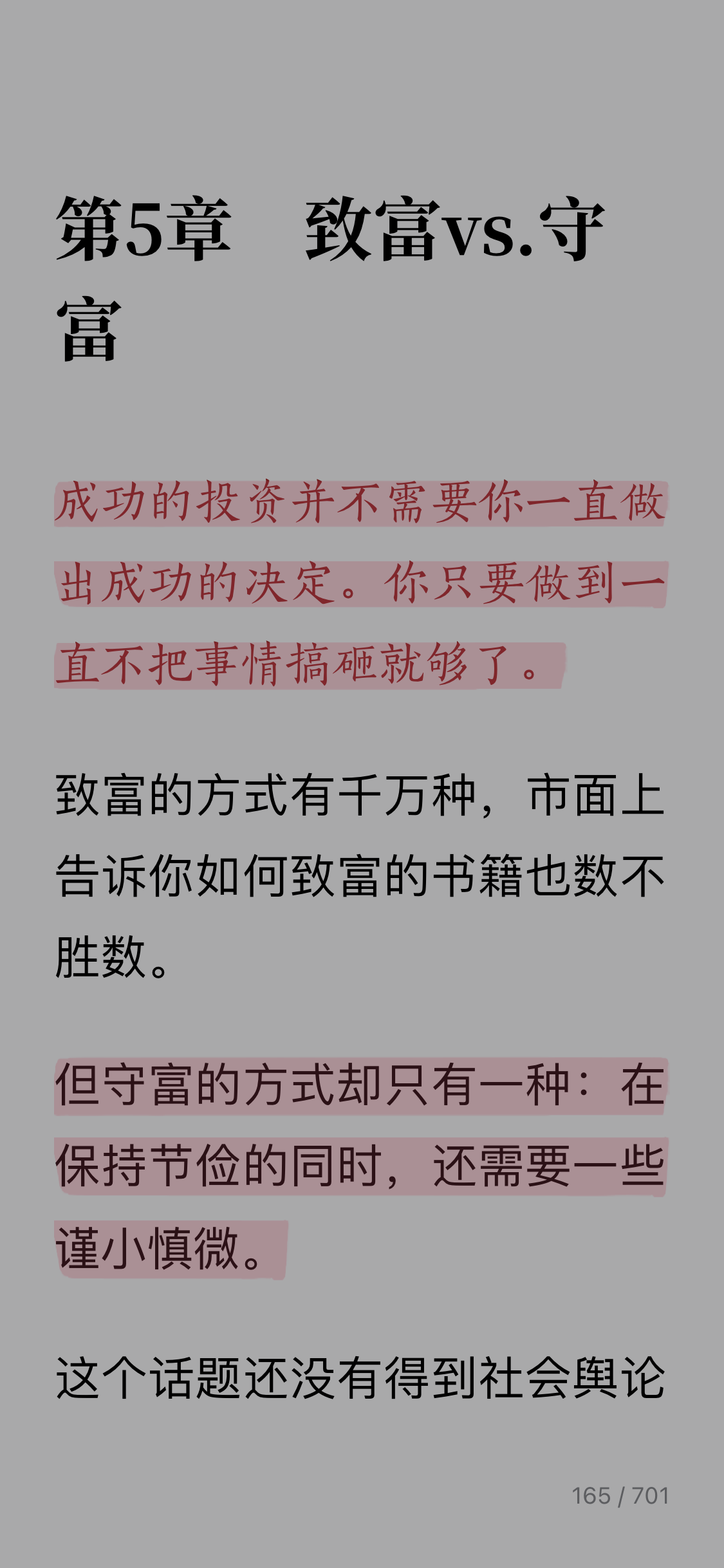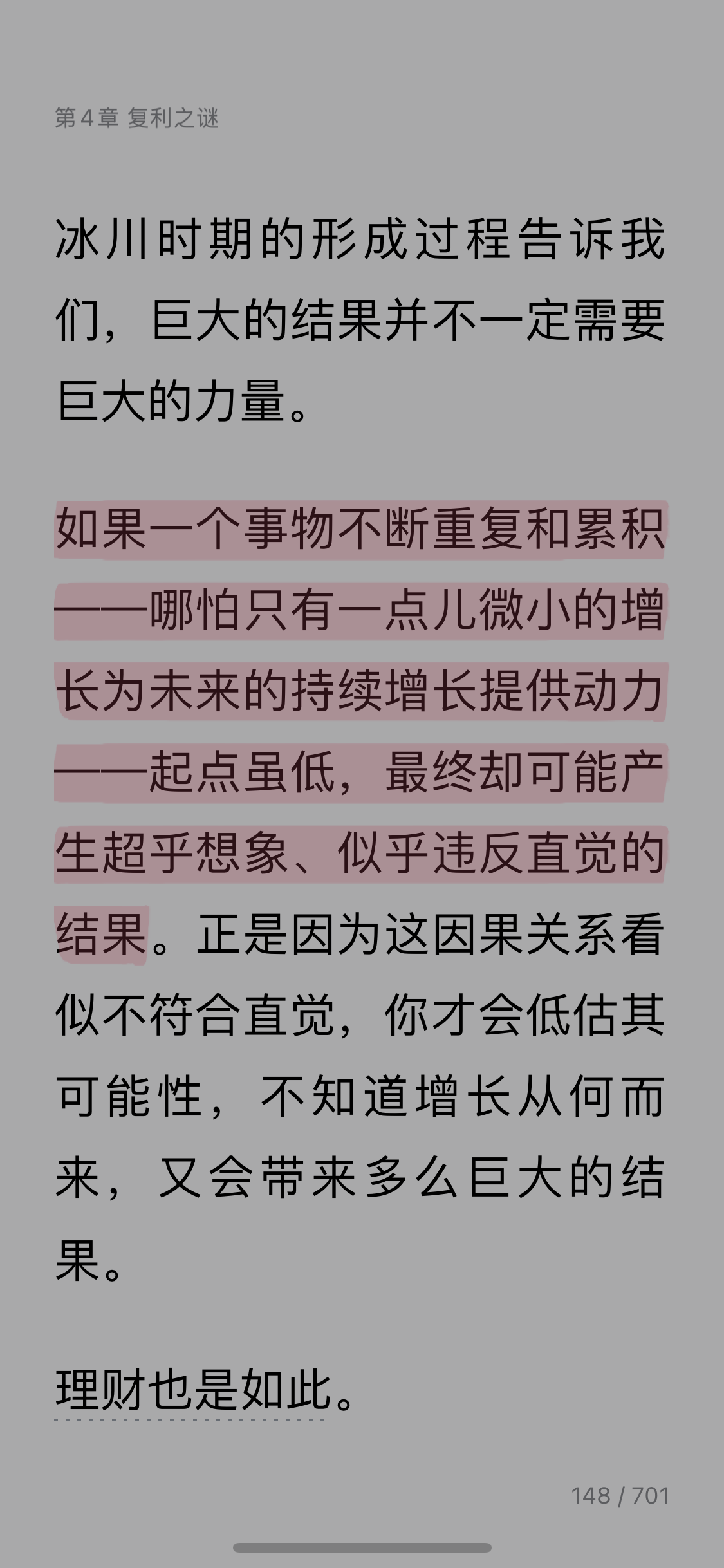 Day13: 今天继续阅读:《金钱心理学》。 书本读到第四章其实是非常熟悉的章节内容,复利之谜,但是对待复利所带来的巨大收益对现代人来说并不陌生,很多书本和媒体都在介绍和宣传,但它需要耐心,需要长期主义,需要时间的积累,我觉得这不是作者所说的容易被大家忽略,而是因为大家性急,包括对知识、能力等都想急于求成,都想走捷径,包括我在内,坚持不了多久,容易被外界所诱惑,总想着高回报,忘记了高风险,总想着快速成功,忘记了成功是更需要要时间投入和付出努力的,所以欲速而不达,真是古人的慧眼。 包括第五章就是提醒大家致富也许可以快速,可以冒险,但要长期拥有财富还得能守富,这就要克制欲望,一切以生存为前提,和看待复利一样,一定要用长期主义去对待财富,为风险为意外做好充足准备。书上对守富用了一个“谨小慎微”一词来形容方式,对于我这位守富失败者而言真的感觉用的很精准,投资一定要一定要谨慎、谨慎再谨慎,要全程保持高度警惕,苗头不对要及早撤出,保本是关键,有了本也能谈生存,才有以后。真的是能赚到钱是靠运气,运气不会无限伴随的,见好就收、稳步前行最明智。