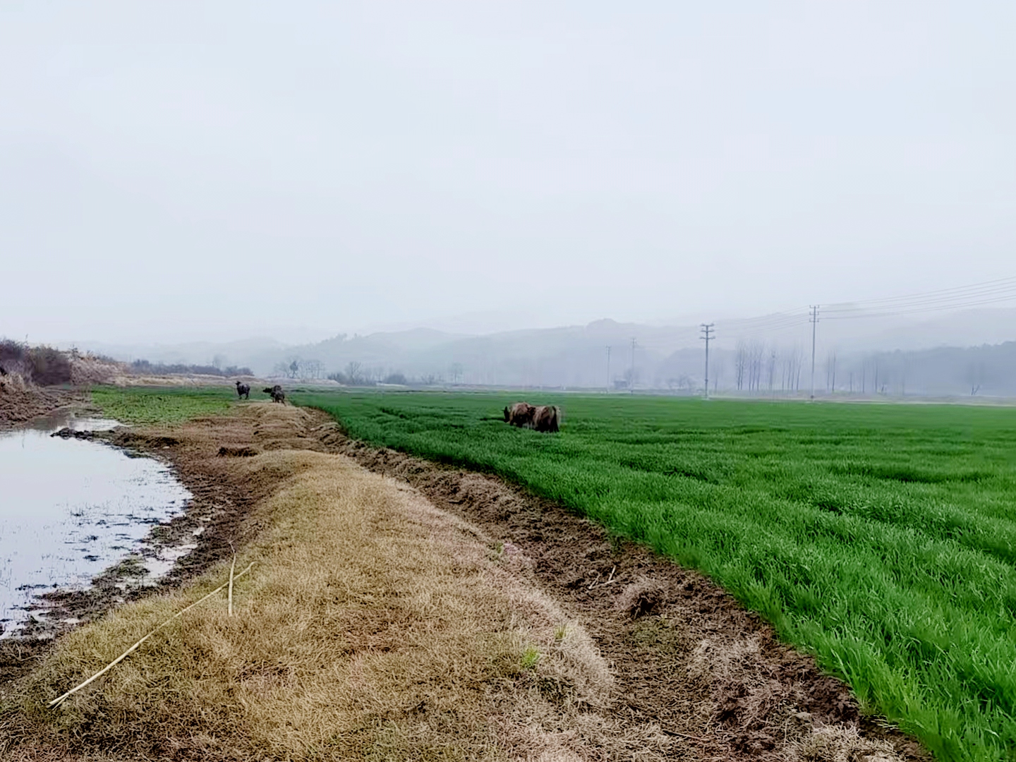 阴天麦田走起~泥巴路、水渠边、牛群慢悠悠,远处山丘静默,电线杆划出天然构图,农耕日常,刚刚好。