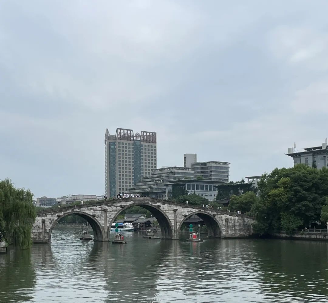阴天的拱宸桥桥,石拱倒映水面,游船轻过,柳影摇曳,现代楼群悄悄入画~