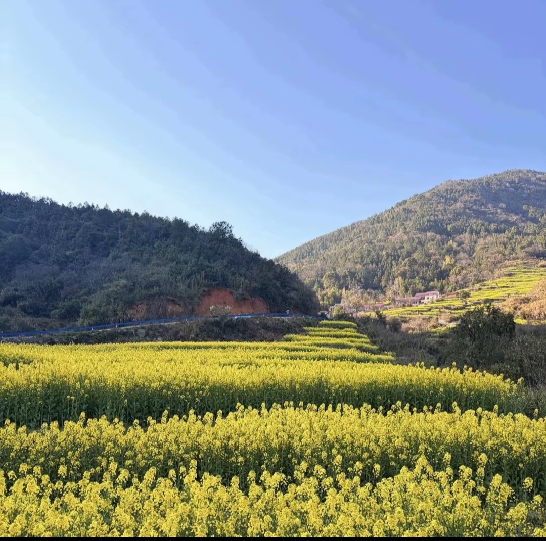 🌼 牛岭春早,梯田铺金 春风拂过梅岭的褶皱,把600余亩金黄泼洒在牛岭的层层梯田上。从山脚到山巅,一垄垄油菜花顺着山势蜿蜒起伏,像大地铺展的金色锦缎,在晴日里泛着暖融融的光。 这里没有婺源的喧嚣,却藏着不输“篁岭”的诗意。红顶民居错落嵌在花海间,青石板路在花田与山林间蜿蜒,偶尔有山风掠过,裹挟着清甜的花香与草木气息,漫过整个山谷。站在高处远眺,黛色青山作底,金黄花田为墨,白墙黛瓦点缀其间,活脱脱一幅江南田园的水墨长卷。 三月的牛岭,是最适合慢下来的地方。沿着步道穿行在花海里,看蜂蝶在花间忙碌,听溪水在石缝间叮咚,或是坐在田埂上晒晒太阳,让春日的暖意浸透衣衫。不必赶行程,不必追风景,只消沉醉在这无边的金色里,便足以治愈一整个冬天的疲惫。 待到夕阳西下,余晖为花海镀上一层暖橙,远山与村落都浸在温柔的暮色里。此刻的牛岭,少了白日的明艳,多了几分静谧的诗意,让人忍不住想把这春日的温柔,永远留在镜头里、记忆中。