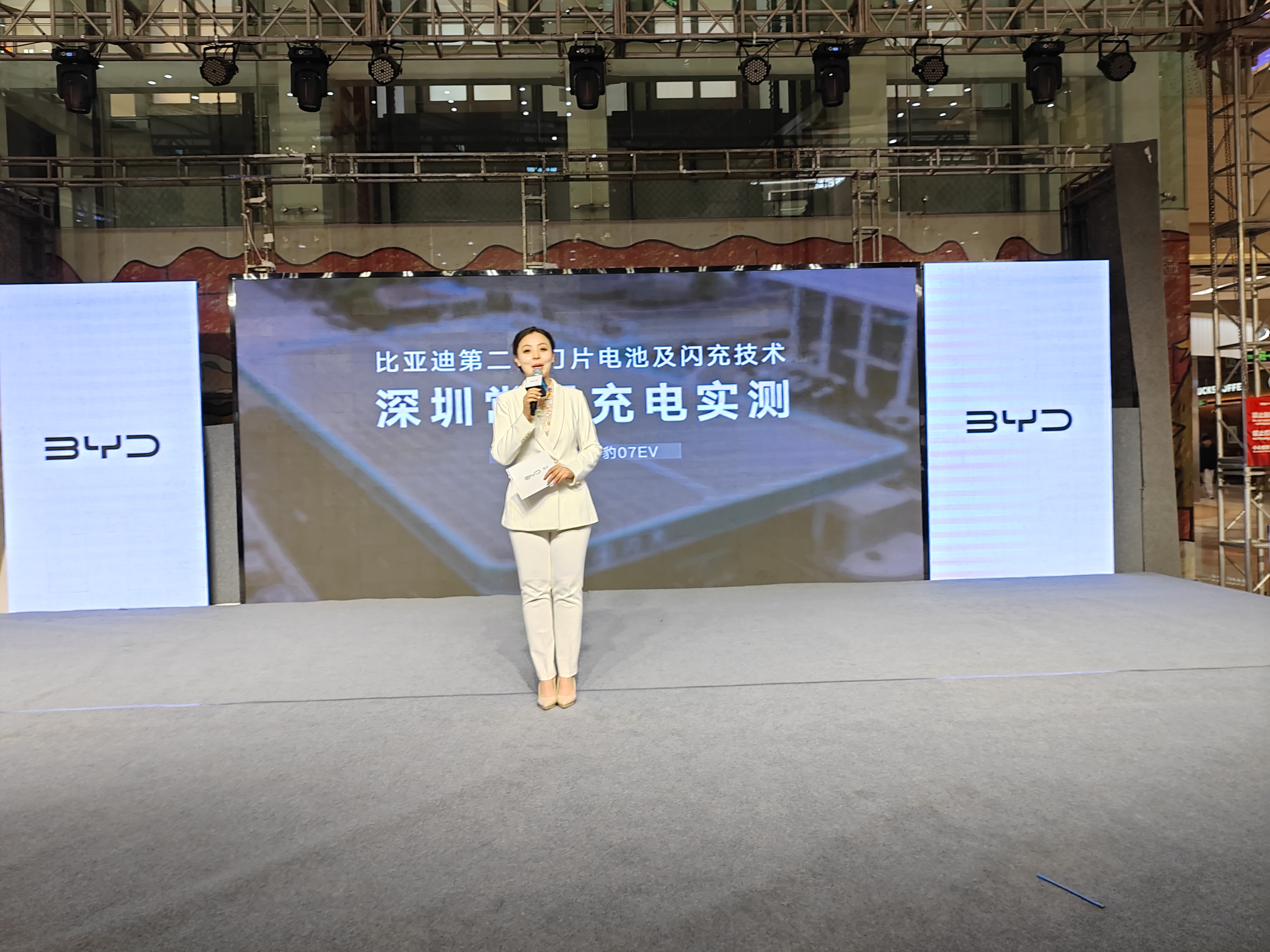 深圳比亚迪发布会现场,白西装主持人手持麦克风,豹07EV静静停在工业风展厅,大屏闪充数据跳动,科技感拉满~