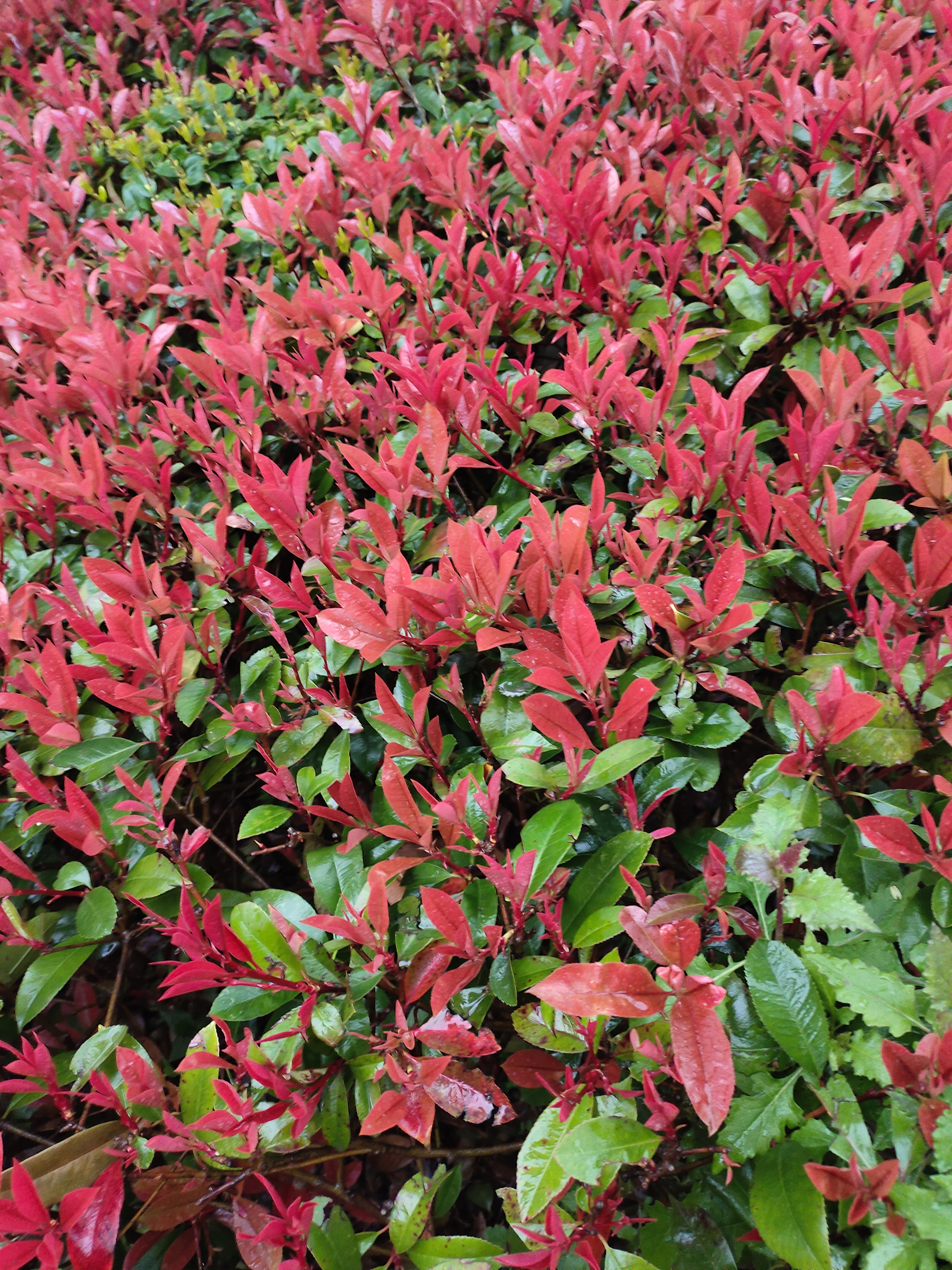 红叶石楠新叶红得像打翻了胭脂,老叶绿得稳如泰山。这波叶色对比,绝了!