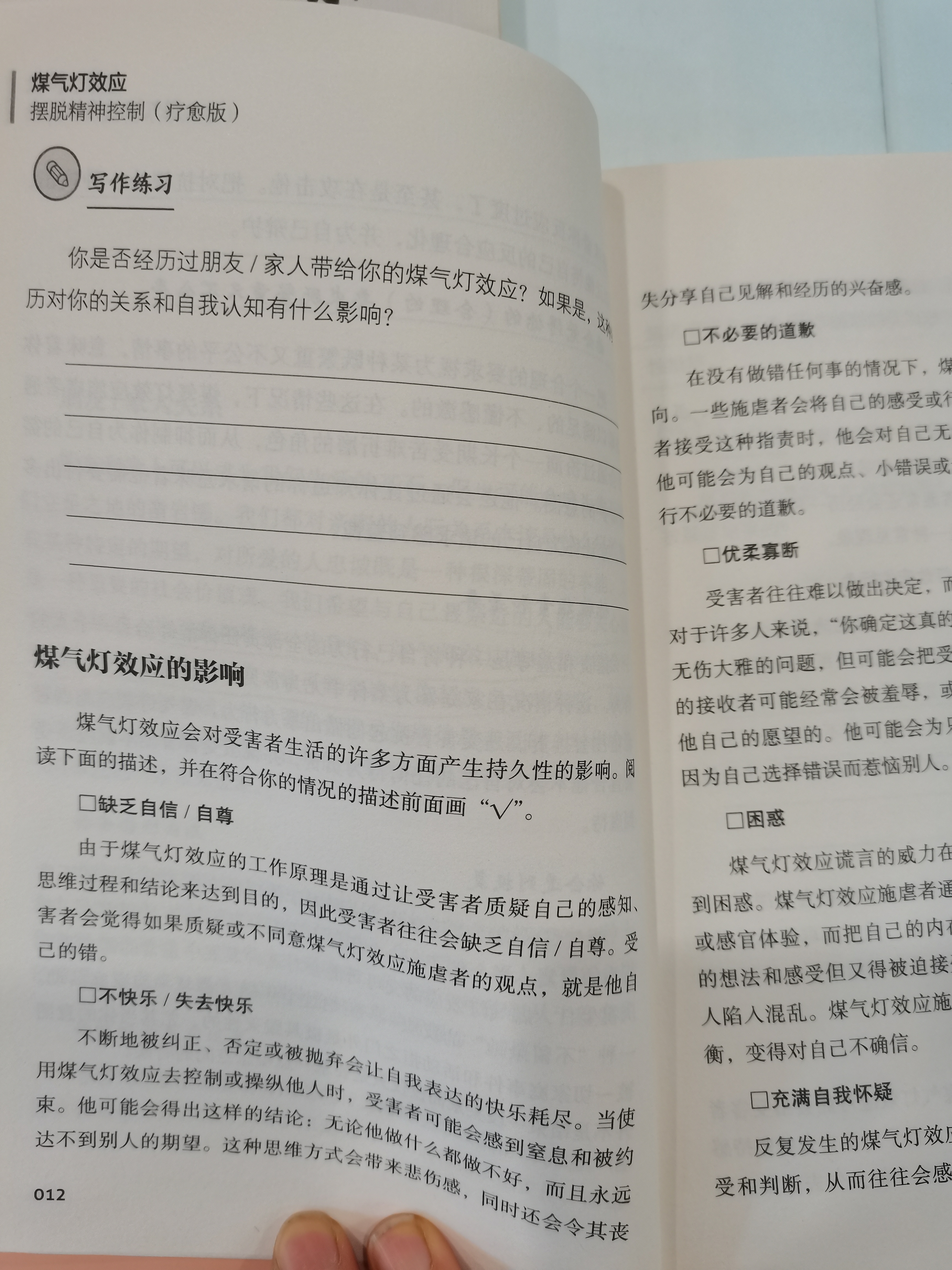 翻到《煤气灯效应疗愈手册》、光影交错间,照见内心真实——疗愈始于相信自己的感受。阳光正巧落在“重建自信”那行字上~光,真好。