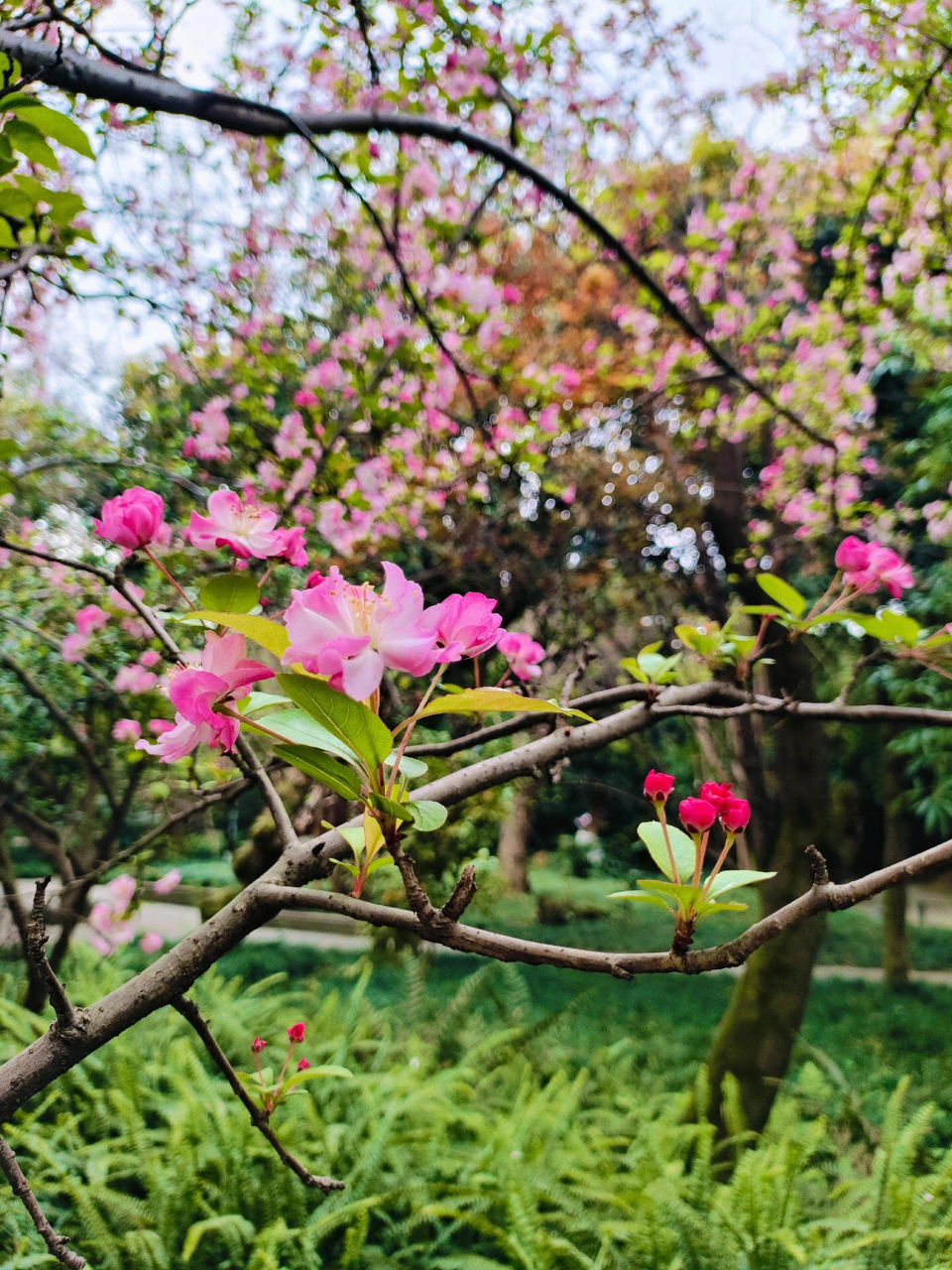 粉樱缀枝,绿叶扶疏,花枝低垂拂过石拱桥;澄澈水面倒映花影与飞檐,光影斑驳,静谧悠然。古典园林间,自然与人文交融,尽显东方春韵。