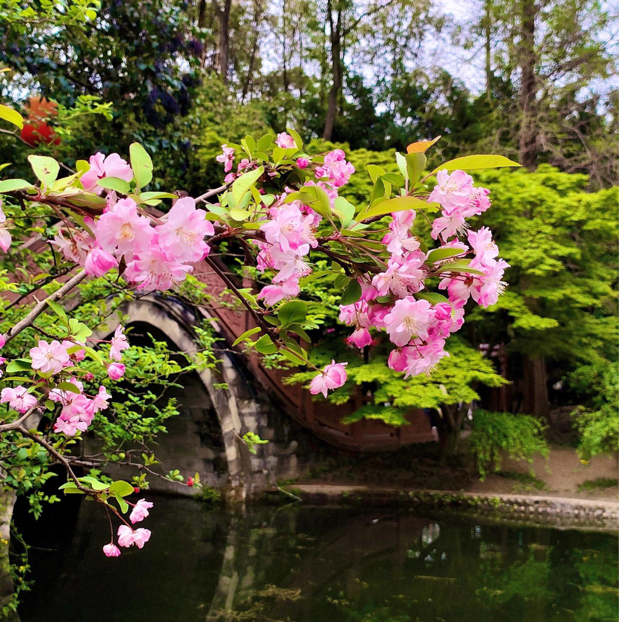 今天溜达到园子深处,小河弯弯,石桥拱拱,正开得热闹~风一吹,花瓣簌簌落进水里,倒影晃着晃着,分不清哪边是真哪边是梦。蓝天懒懒铺在头顶,阳光斜斜穿过枝条,在青苔石阶上画光斑。蕨类悄悄冒头,草色刚染新绿,连空气都软乎乎的。谁说赏樱非得挤人堆?静一点,慢一点,春就自己踮脚走来啦~