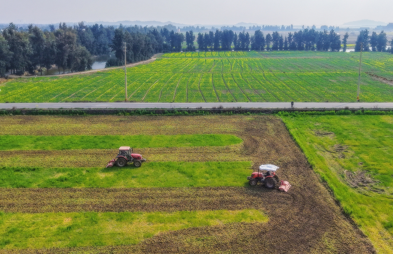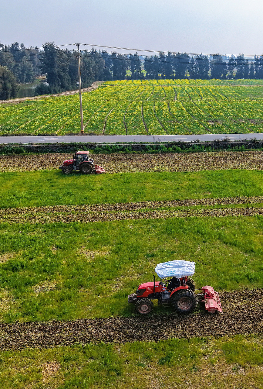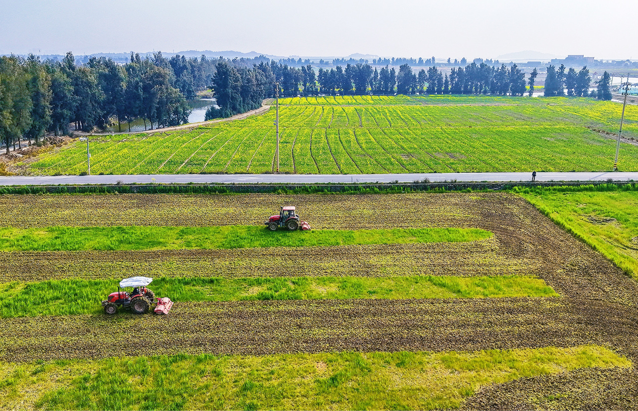 拖拉机犁开春泥,绿野铺展至天边;黄花缀田埂,河流蜿蜒如诗——这是大地苏醒的呼吸。于温岭市坞根镇。