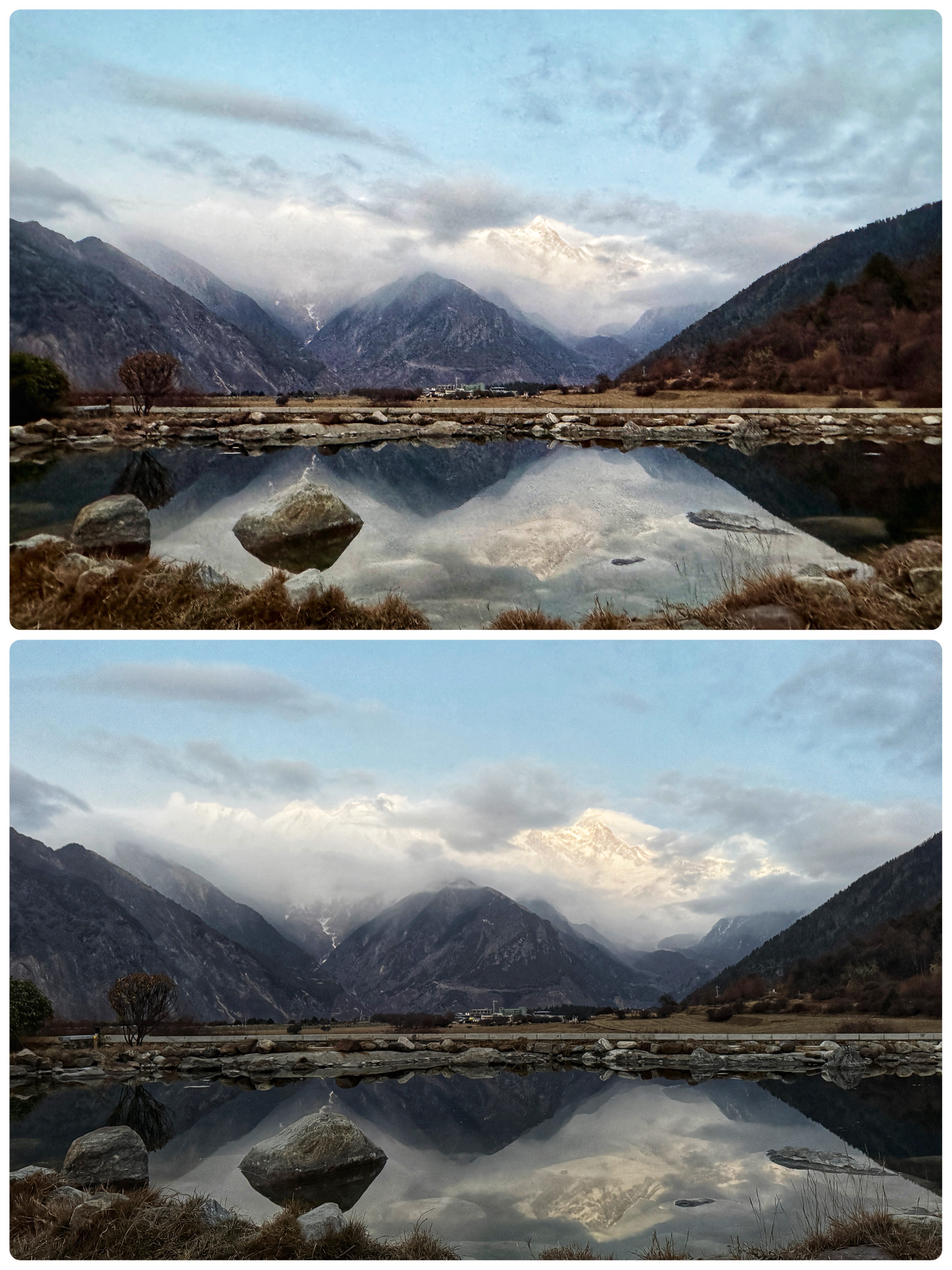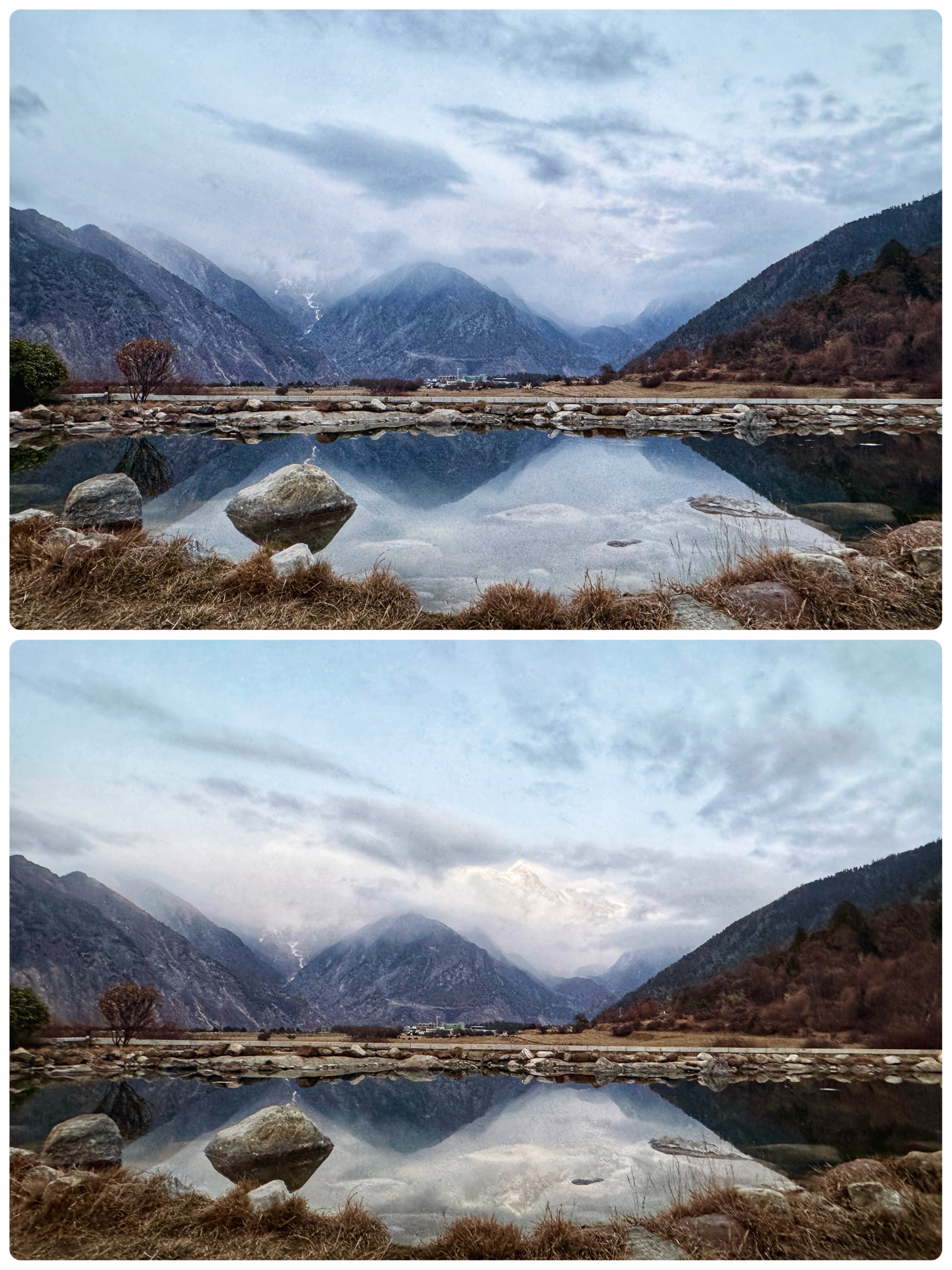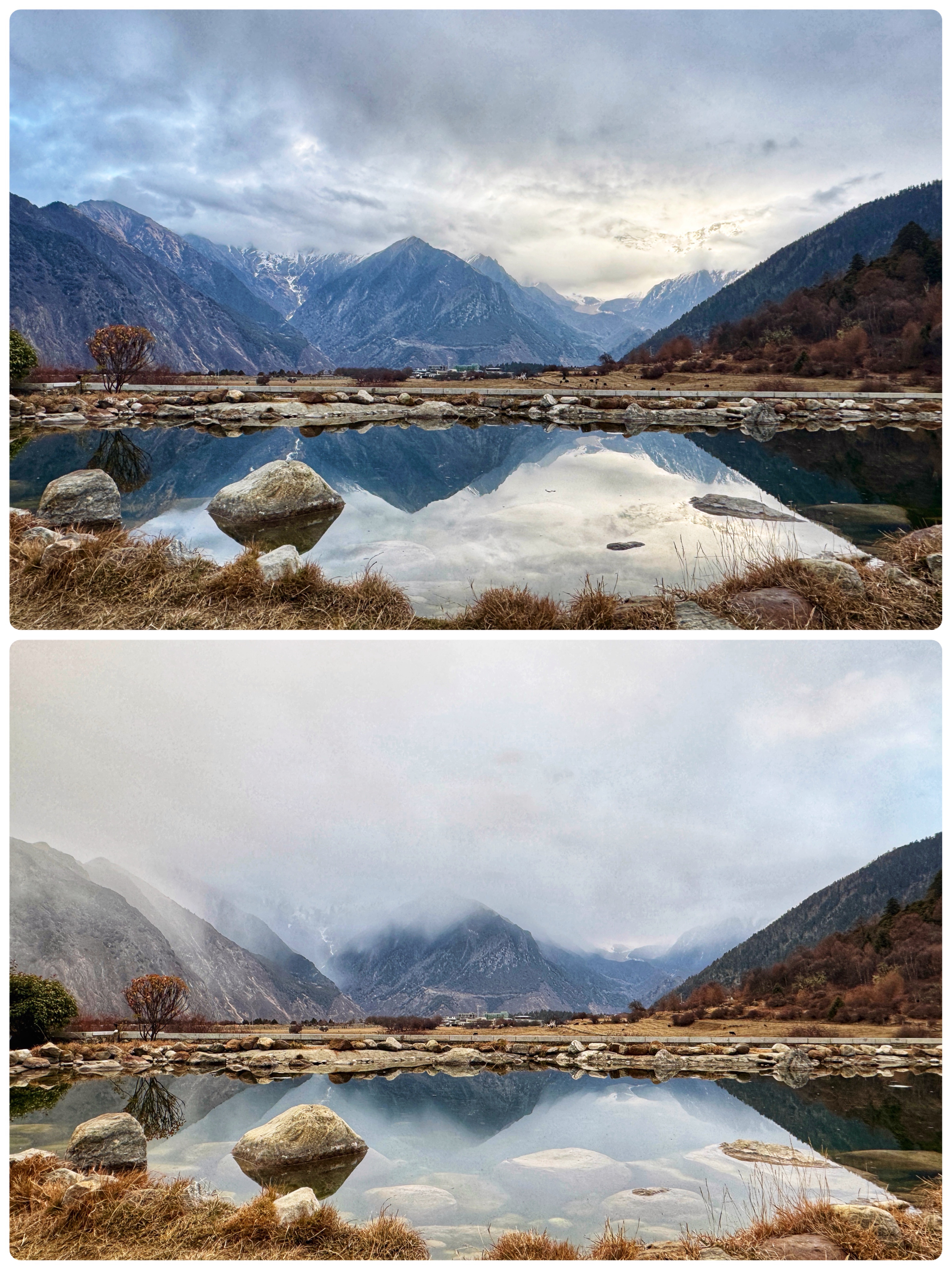 山在雾中,我在等风 等一场云开 等一次峰现 两小时的守候 同机位记录 南迦巴瓦的每一次呼吸 云雾是它的面纱 池水是它的镜面 南迦巴瓦的威严与温柔 在云雾里浮沉 都印在帧帧光影里 虽未见全貌 却也足够迷人 原来最美的风景 从来都在等待的过程里
