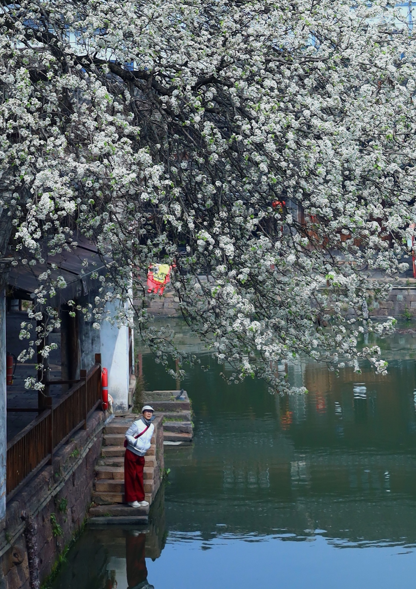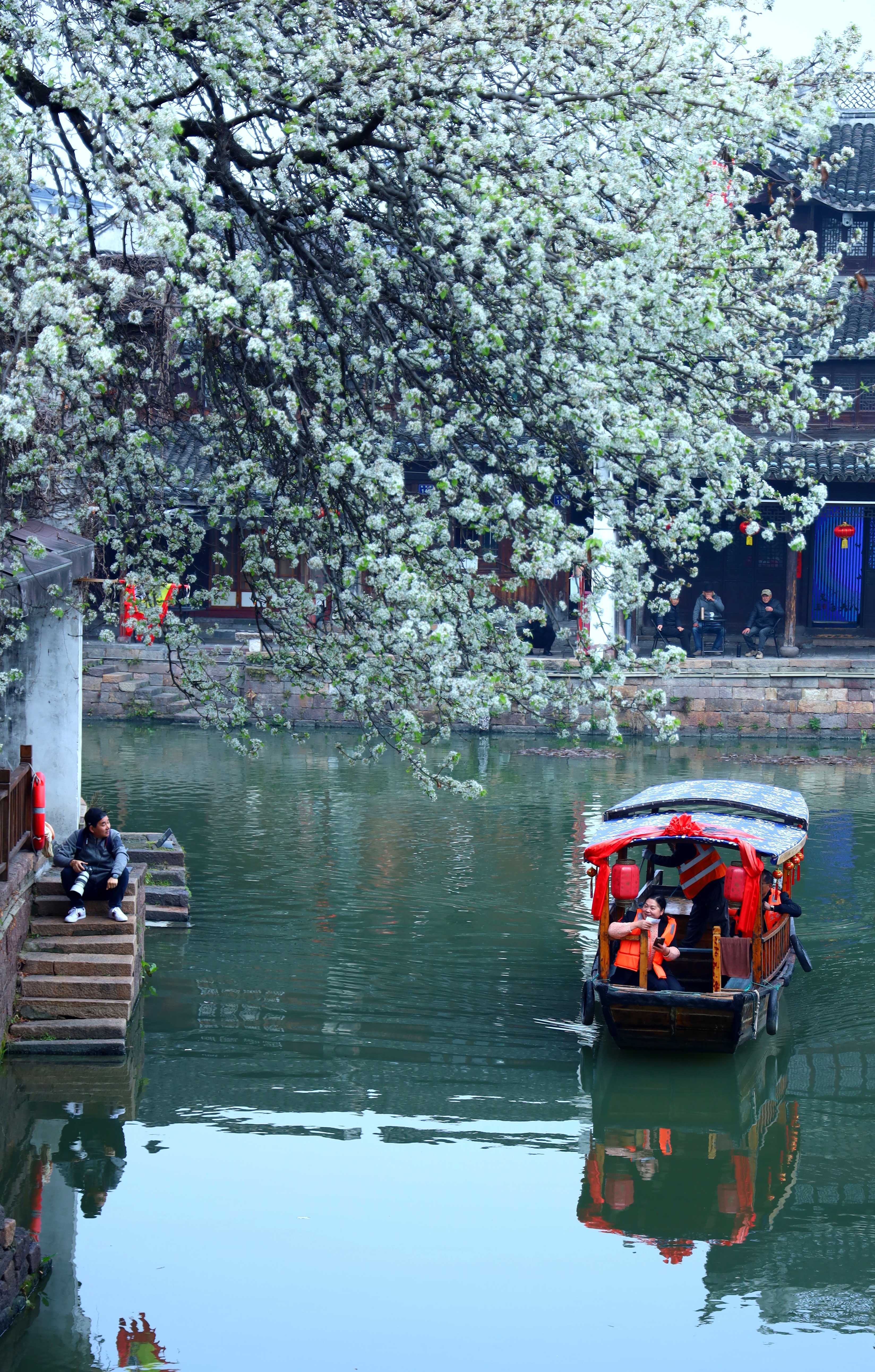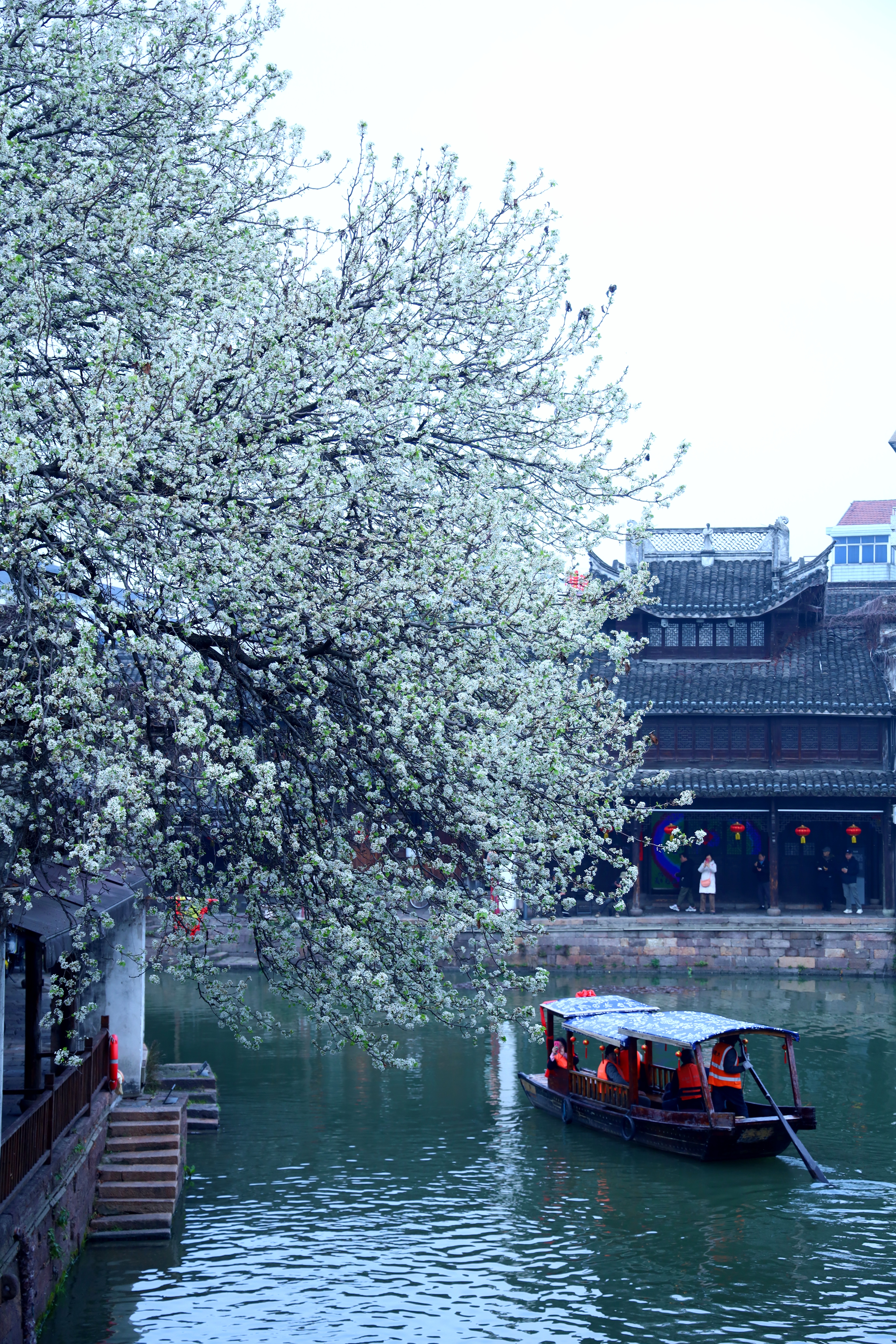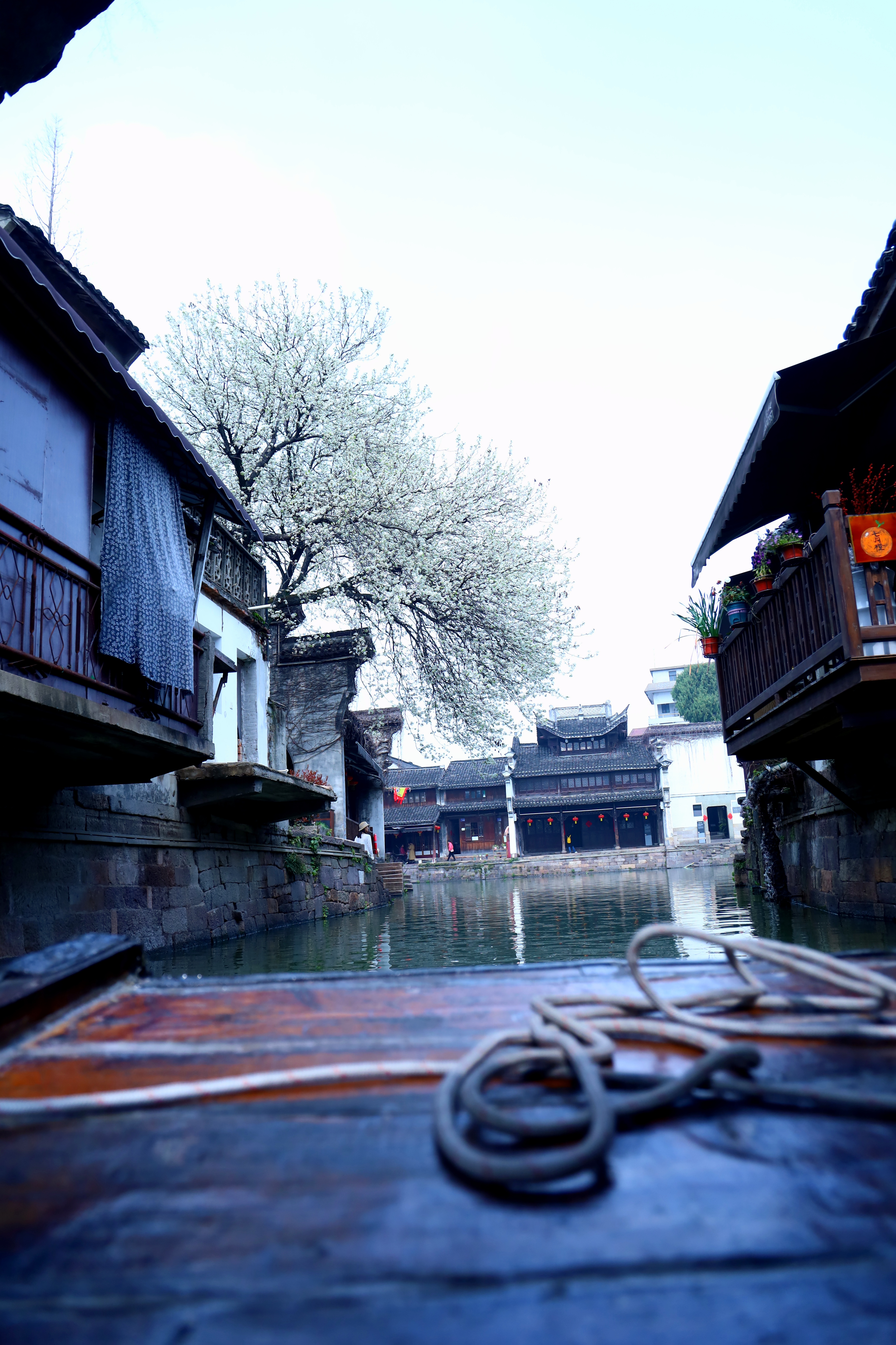 摇橹船 载一树梨花 入江南古镇 水乡春色如画