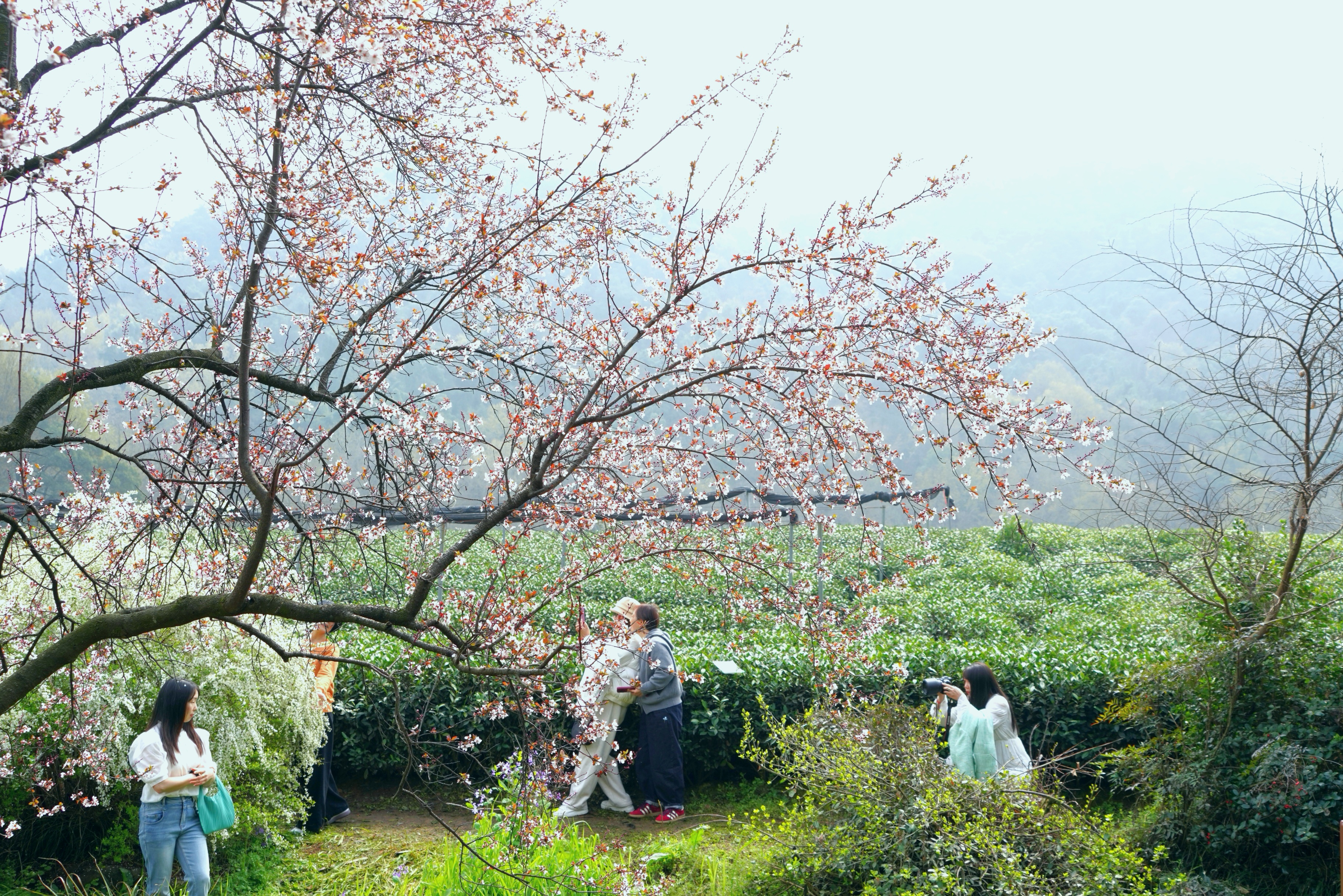 春天的样子!枝上春樱,垄间茶香;茶田新绿,花满枝头!