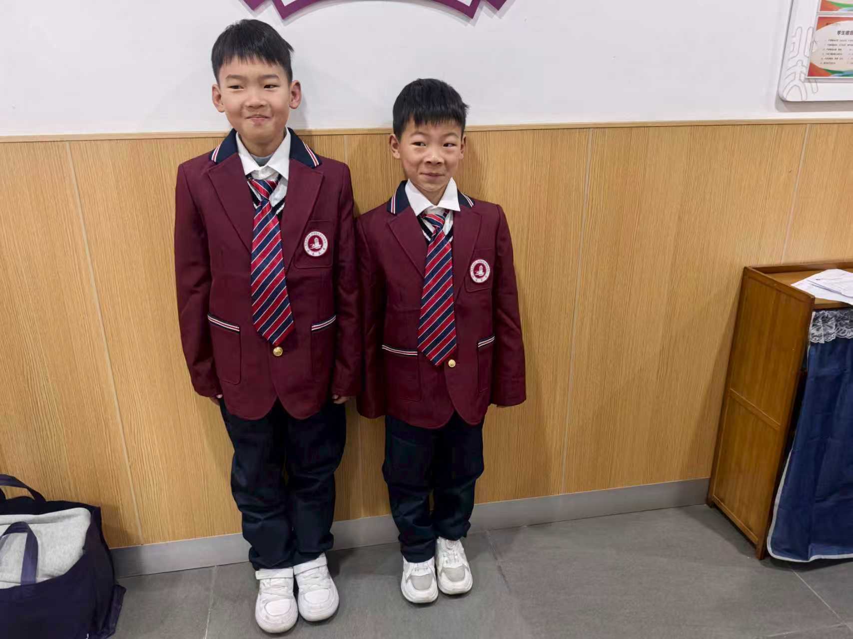 第一次穿上西装,掩饰不住的开心 在湖州培文实验学校,第一次穿上漂亮的西装校服,我心里又激动又紧张。紫红色的西装挺括又好看,搭配着白衬衫和小领带,整个人都变得精神极了。对着镜子照了又照,走路都忍不住挺直腰板,感觉自己一下子长大了,特别神气,恨不得赶紧去学校给同学和老师看看。