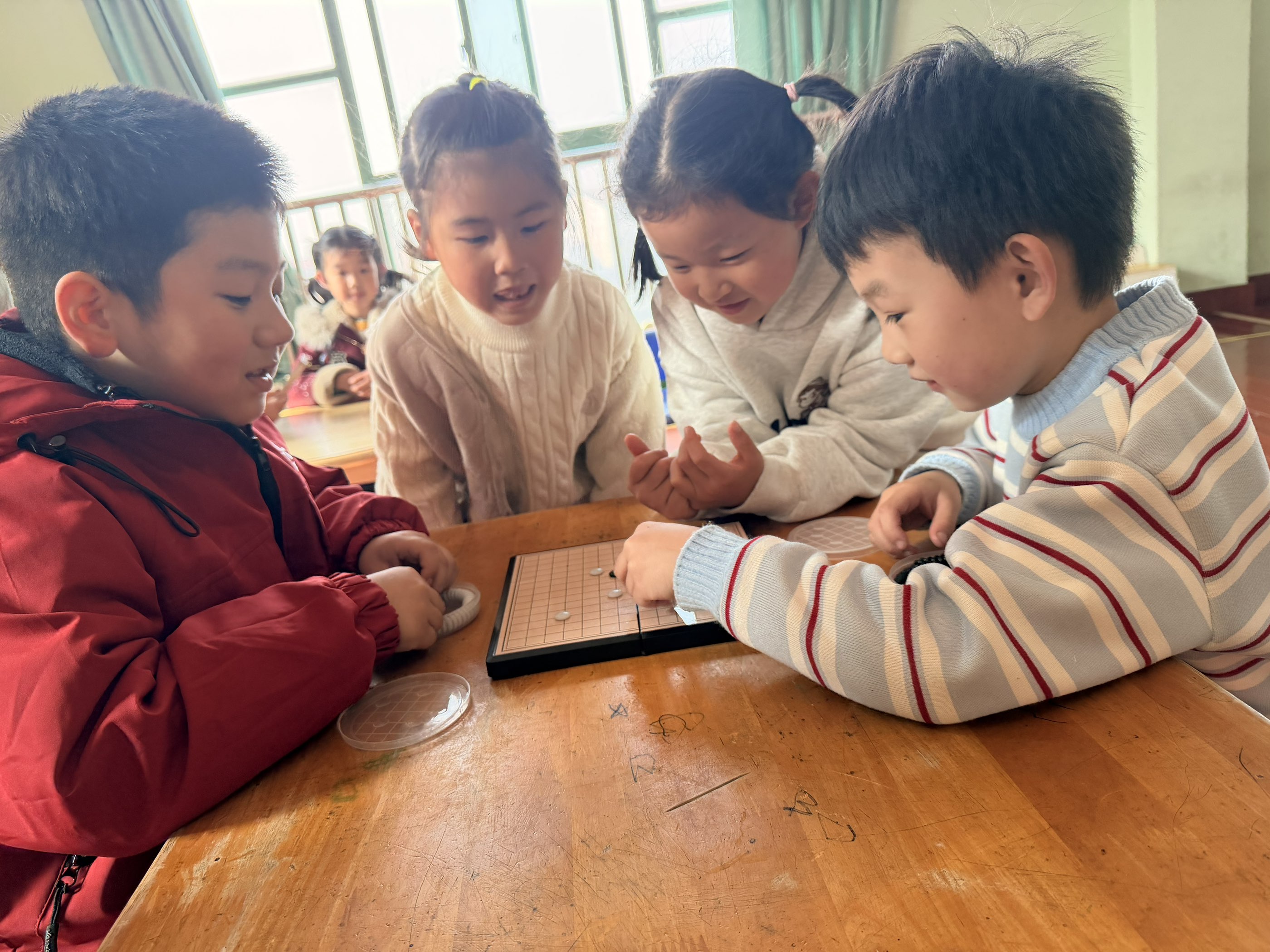 几名小朋友围坐在棋盘前,正专注地进行五子棋的对弈。他们时而眉头微蹙思考策略,时而因一步精妙的“围堵”露出得意的笑容,小小的棋盘不仅锻炼了逻辑思维,更培养了耐心与专注力。