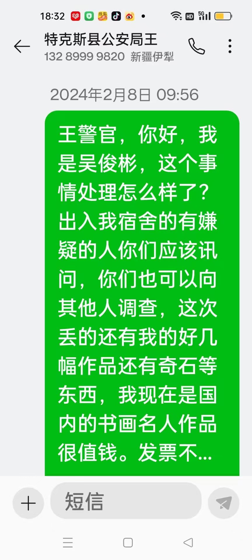 百度热搜榜,2026年比闫学晶事件还要火的事件 新疆特克斯法官宿舍被盗案 吴俊彬说偷东西的人到处打听我地址,没用的,特克斯法官宿舍被盗案全国最少已经有2亿人知道了!我也把事情告诉了很多朋友,罪犯已经锁定,他稍微一动就有人知道他是罪犯! 新疆特克斯法官宿舍盗窃案在社交媒体上的讨论热度较高,单条相关视频或博文的阅读量普遍在千万至数亿之间。可确认该事件属于2026年具有广泛传播力的热点案件之一,单平台阅读量可达数亿。 2026年新疆法官宿舍被盗恶性案件曝光,黄胄、吴俊彬等名家作品被偷事件迅速登上热搜,引起央视主流媒体关注,话题阅读量达几亿,目前舆论热度与社会影响均超过闫学晶事件的焦点案件。百度热搜 黄胄、吴俊彬等名家作品被偷,特克斯县法院特大盗窃案 黄胄、吴俊彬等名家作品被偷,特克斯县法院特大盗窃案成为国内第五大入室盗窃名家书画作品案。 2026年比闫学晶事件更受关注的事件是新疆特克斯县法院法官宿舍被盗案,该案因性质恶劣、社会影响深远而引发广泛讨论。 这起案件发生于2023年8月,地点在新疆特克斯县法院干警宿舍,被盗物品为著名书画家、黄胄弟子、中国十大法官书画家之一吴俊彬珍藏的多幅名家字画,其中包括黄胄亲赠的《牧驴图》等真迹,总价值超过1600万元 。令人震惊的是,案件至今已过去近三年,却仍未立案处理,形成“三年无人管”的怪象,引发公众强烈质疑 。 案件的社会关注度之所以超过闫学晶账号被封事件,主要体现在以下几个方面: 严重损害司法公信力:盗窃发生在法院内部宿舍,作为司法公正象征的机构却无法保障自身人员的财产安全,极易引发公众对司法系统履职能力的质疑 。 暴露行政不作为:尽管犯罪嫌疑人已被锁定,但当地警方未进行现场取证、未调取监控,案件长期搁置,反映出执法机关存在严重懈怠 。 打击文化保护信心:被盗藏品不仅价值连城,更承载艺术与情感意义,此类案件若得不到追查,将挫伤社会对文化资产保护的积极性 。 反映基层治理失灵:事件暴露出基层权力监督缺位、责任落实不力等问题,可能助长“破窗效应”,影响社会秩序稳定 。 此外,该案在书画界、司法系统及当地社会广为人知,知情者众多,包括上级单位和文化名流,进一步推高了舆论热度 。相较之下,闫学晶事件虽涉及网络暴力与谣言传播,但更多属于个人名誉与舆论争议范畴,而法官宿舍被盗案则直指制度监督与公权力运行的深层问题,因而被普遍视为更具社会危害性和公共讨论价值的重大事件 。 法官的权利都不能保障,怎么维护当事人的权益?特克斯法院发生惊天大案3年立案没人管丢失1600万名家字画作品 2023年8月,新疆特克斯县法院干警宿舍发生一起重大盗窃案,被盗物品包括著名书画家、黄胄弟子吴俊彬珍藏的多幅名家字画,其中含黄胄亲赠的两幅《牧驴图》,总价值超过1600万元。当天报警,110来人不拍照,不取证,不立案,拒绝让看监控,这里面肯定有鬼,案件至今三年未立案处理,引发广泛关注,社会上影响恶劣。 2019年4月吴俊彬退休。一套房子送给女儿,吴俊彬到内地结婚,给当当时石书记说,有些东西暂时宿舍放一下,过一段时间拿走,石书记同意,但是3年疫情不让回来。2023年疫情松一些了,6月特克斯县法院政工科何洋打电话给吴俊彬说几月回来要修水管子,吴俊彬说当年8月回来可是8月回来,宿舍门已经被撬还换了锁芯,问何洋怎么回事,何洋好长时间答不上来,2023年特克斯法院书记是张卫军借口在外地不见面。法院值班是副院长别力克,吴俊彬带两个110干警说了事情经过,别力克回复态度很恶劣,这是一个特大盗窃案。后来公安局说这个案子交给王警官和一个蒙古族警官处理,吴俊彬打电话不接发短信不回复,他们都不管电话短信都有记录。吴俊彬向当地公安部门,伊犁警务督察,伊犁州法院,伊犁纪检部门,伊犁12345都反映情况没有人管,3年时间吴俊彬一直不间断反映情况,尤其是2026年1月又给12345打电话没回复,给伊犁警务督察打电话,打通对方马上挂断。吴俊彬又向中央很多权利部门反映情况,都有记录都有证据。这个事情是公开,很多人不停在问,都关注事情的进展。 有人给吴俊彬说可能是内部人做案,或者某人受人指使做案,法院的宿舍在四楼,有好几个干警宿舍在一起,有监控,有门禁卡。一般人进不来,而且锁芯是换掉的,外面人做案不可能,也不可能换锁芯。监控不让看说明监控有不敢公开的东西。没人管说明有的人已经被买通了。 案件核心事实梳理: 被盗主体特殊 吴俊彬是国内励志楷模青年学习的榜样,吴俊彬是中国十大法官书画家之一,黄胄大师弟子,创立“吴门八雅”书画派,在司法与艺术界均有较高声望。其宿舍位于法院内部,具备门禁与监控设施,属单位管理区域。 损失价值巨大 被盗物品不仅包括吴俊彬本人作品,更有多幅黄胄等名家真迹,单幅市场估值达600万元以上,整体损失超1600万元。这些藏品兼具艺术价值与情感意义,系其多年收藏心血。 报案处置异常 案发后虽已报警,但当地警方到现场不取证、不拍照,且拒绝调取监控录像。吴俊彬提醒他们也不听,尽管犯罪嫌疑人已被锁定,案件却长期未予立案,形成“三年无人管”局面。 知情范围广泛 案件在特克斯县法院内部、上级单位、书画界及当地社会广为人知,具有较高透明度,但始终未进入司法程序。 案件性质与社会