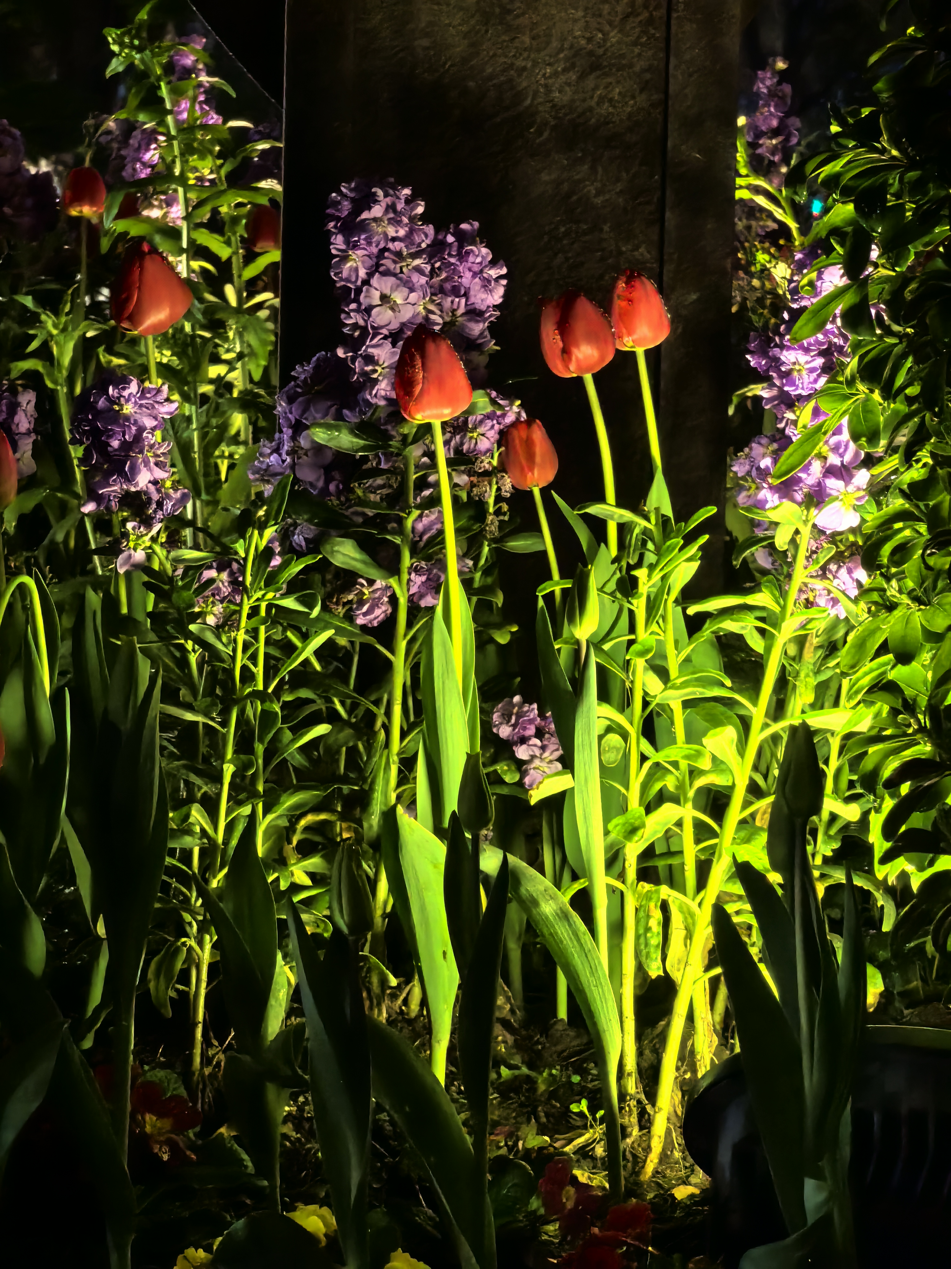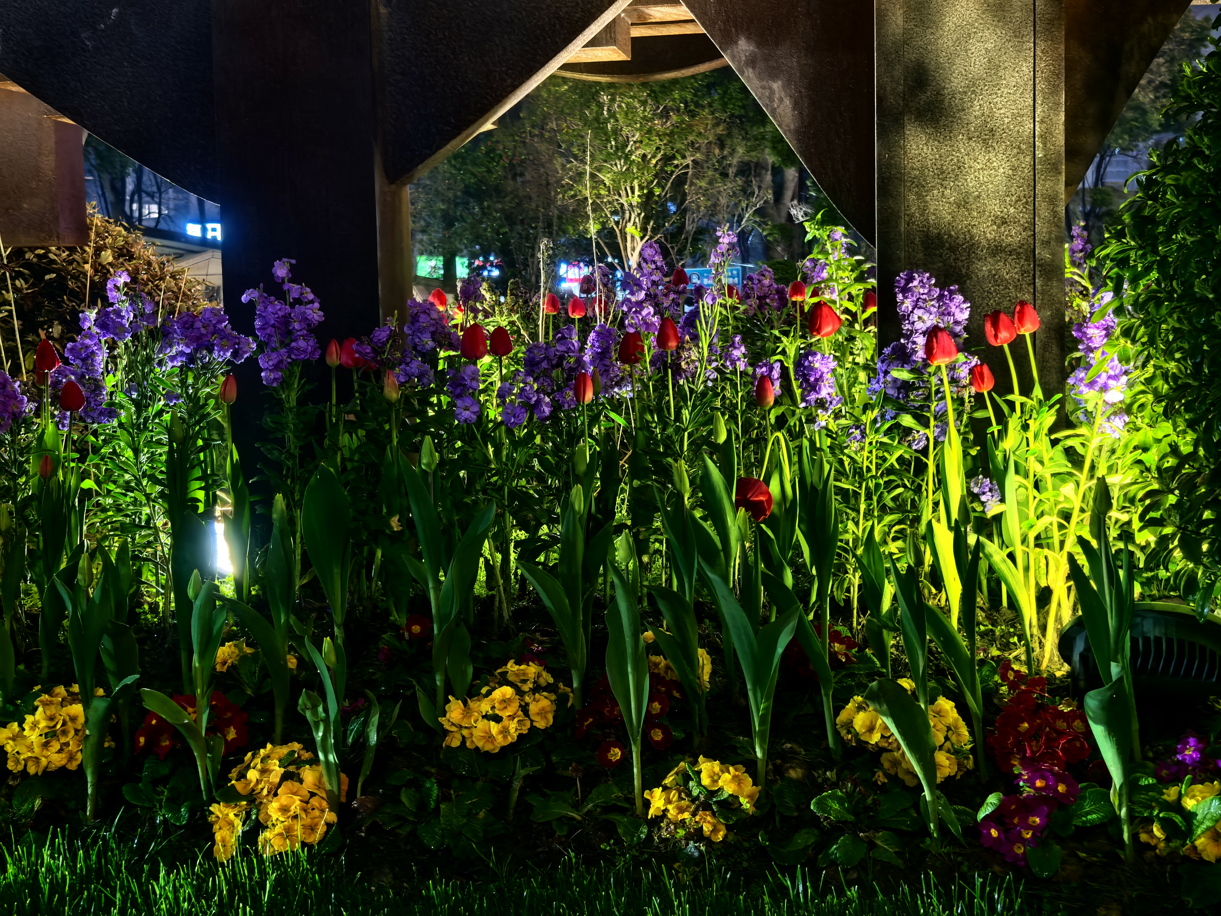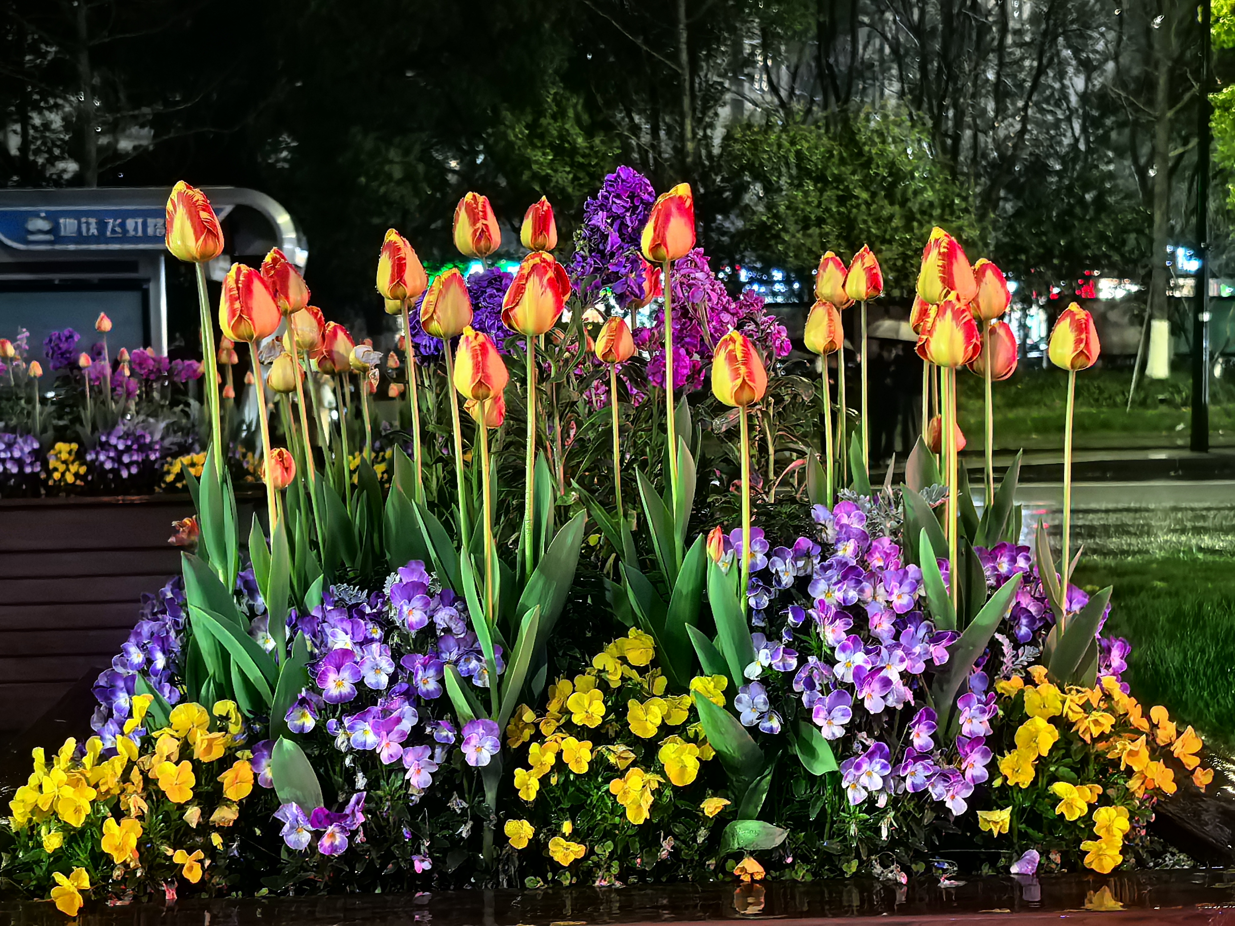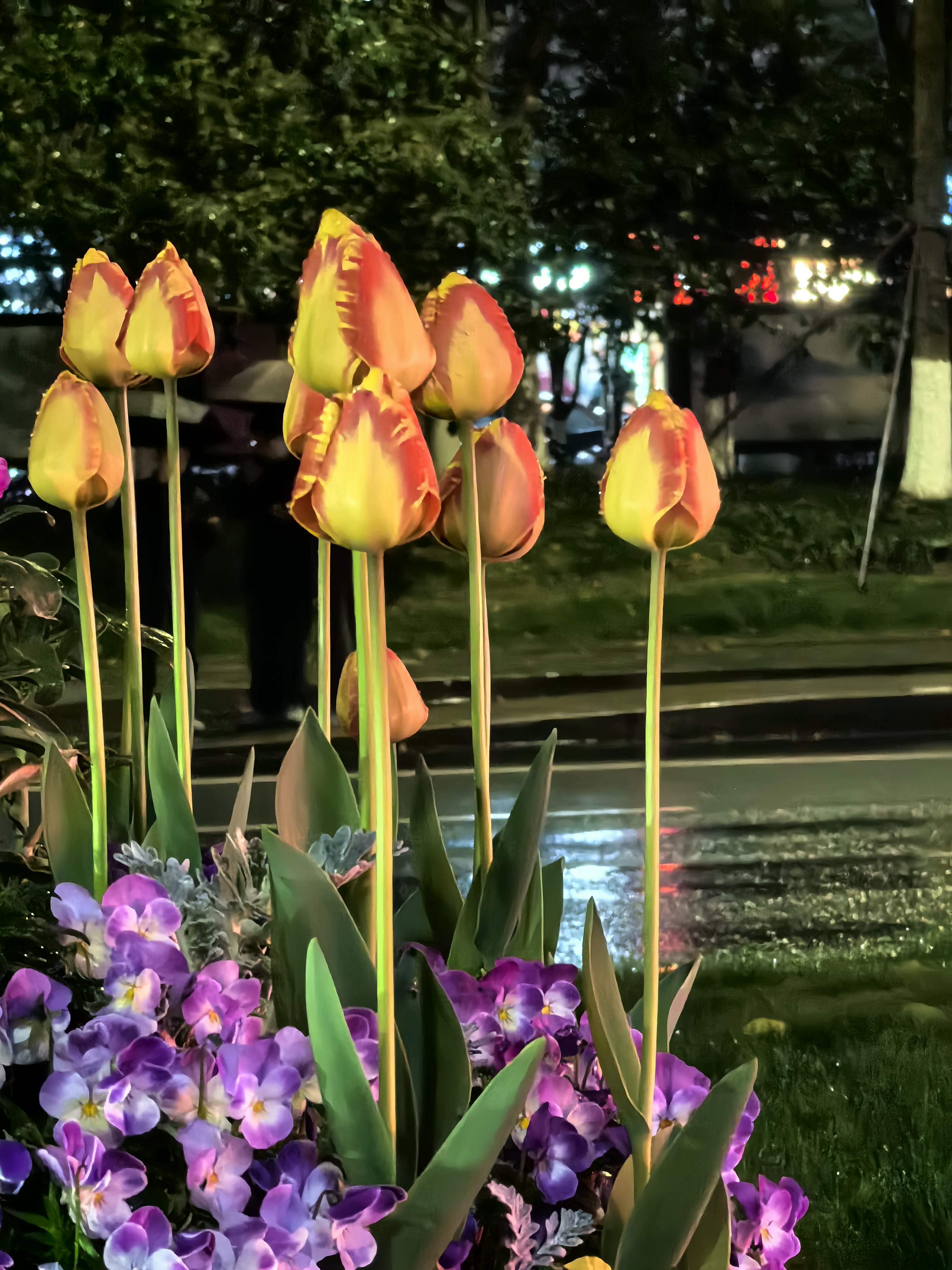 丝绒般的花瓣被雨水浸润,色泽愈发饱和鲜亮:绯红似燃、明黄温润、深紫沉静。晶莹的雨珠缀满瓣尖与褶皱,风过轻轻一颤,水珠便簌簌滚落,溅起细碎的湿意。 未全开的花苞裹着一层薄薄的水膜,像捧着满杯春露;盛放的花盏半倾,在氤氲雨雾里透出朦胧的柔光,空气里混着泥土的清新与淡淡的花香,比晴空下更添几分诗意与静谧。