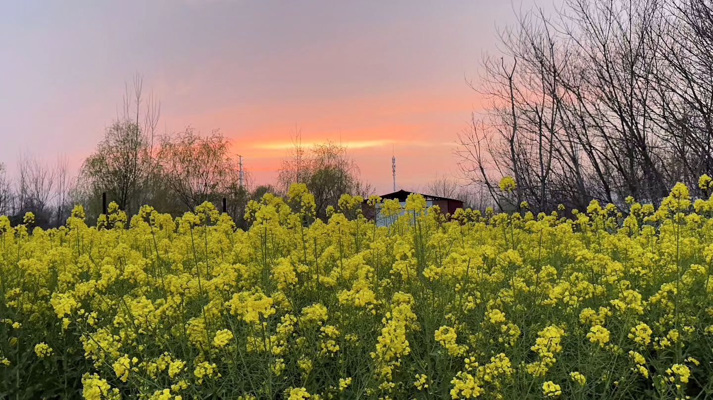 日落熔金,粉空如诗,油菜花海翻涌着春的私语,树影与农舍静默成画。