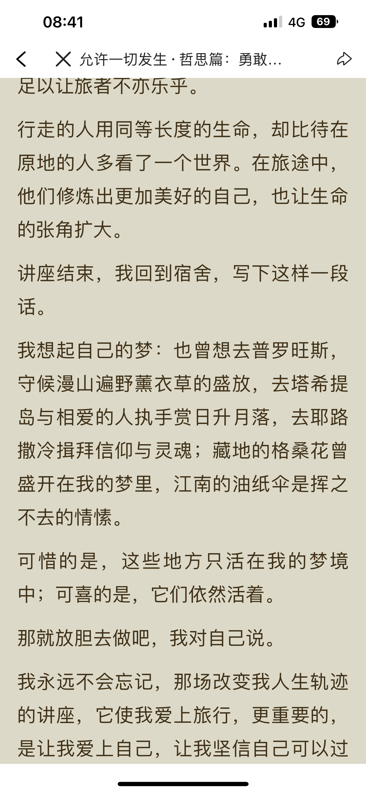 今日摘抄: 行走的人用同等长度的生命,却比待在原地的人多看了一个世界。在旅途中,他们修炼出更加美好的自己,也让生命的张角扩大。 时间对谁都一样流逝,但“待在原地”与“行走”之间,差的不是时间刻度,而是生命与世界的接触面积。原地的人把日子过成了单行线,行走的人却让生命长出了经纬度。 行走不是为了逃离原来的生活,而是在离开之后,更清楚自己是谁、要什么。每一次出发都是一次打破边界,而每一次归来,都带着更开阔的视角和更柔软的心。 这或许就是旅行的意义——它让生命不再是时间的简单累加,而成为空间的不断延展。在同等长度的岁月里,走得远的人,拥有了更大的世界。